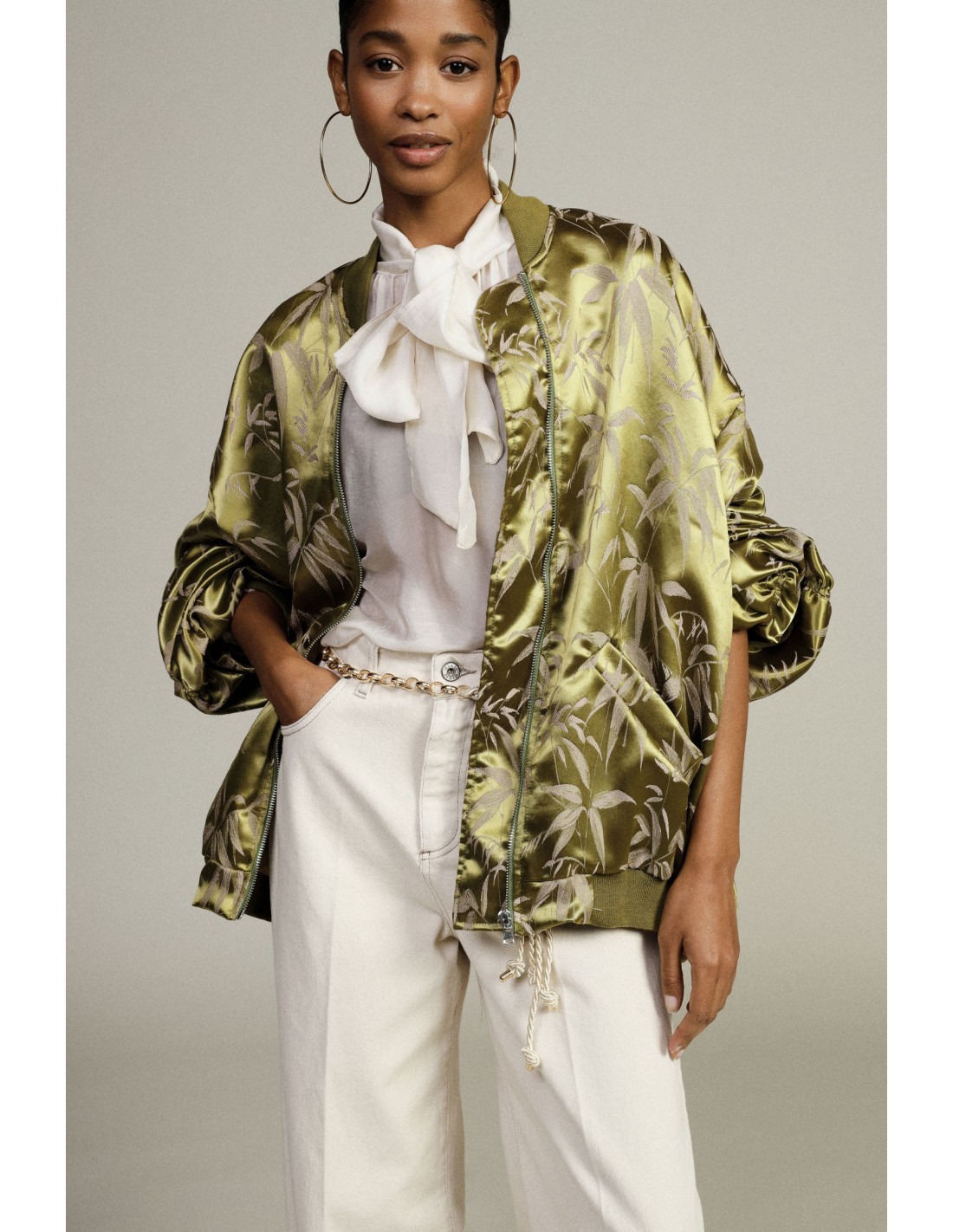 Deixa‑te inspirar pela personalidade deste bomber oversize: a estampa foliage confere um toque original e as mangas amplas acrescentam conforto e movimento. O fecho de correr e as barras caneladas tornam‑no prático para os dias dinâmicos. Perfeito para te destacares com estilo e leveza, mesmo por cima de looks simples.