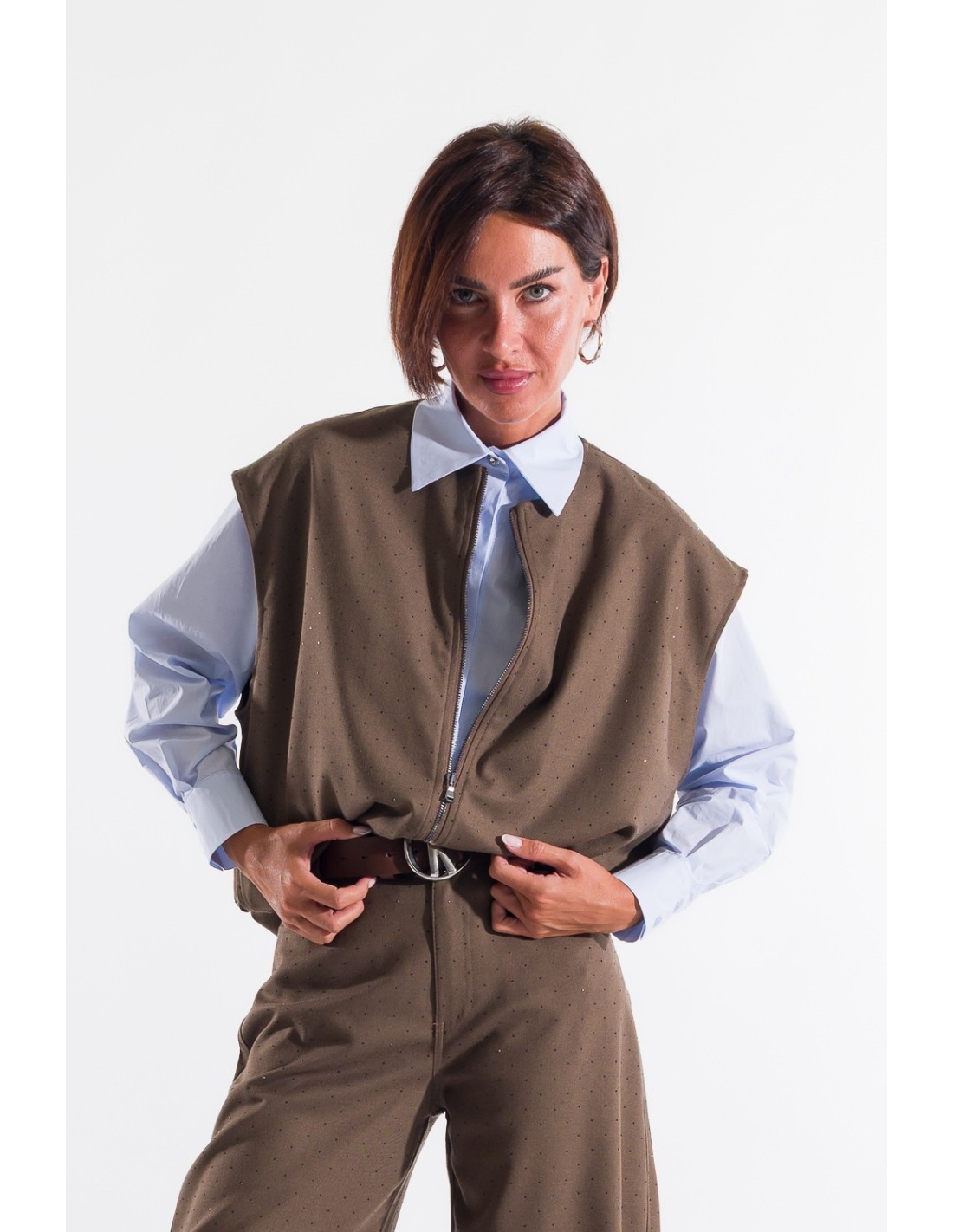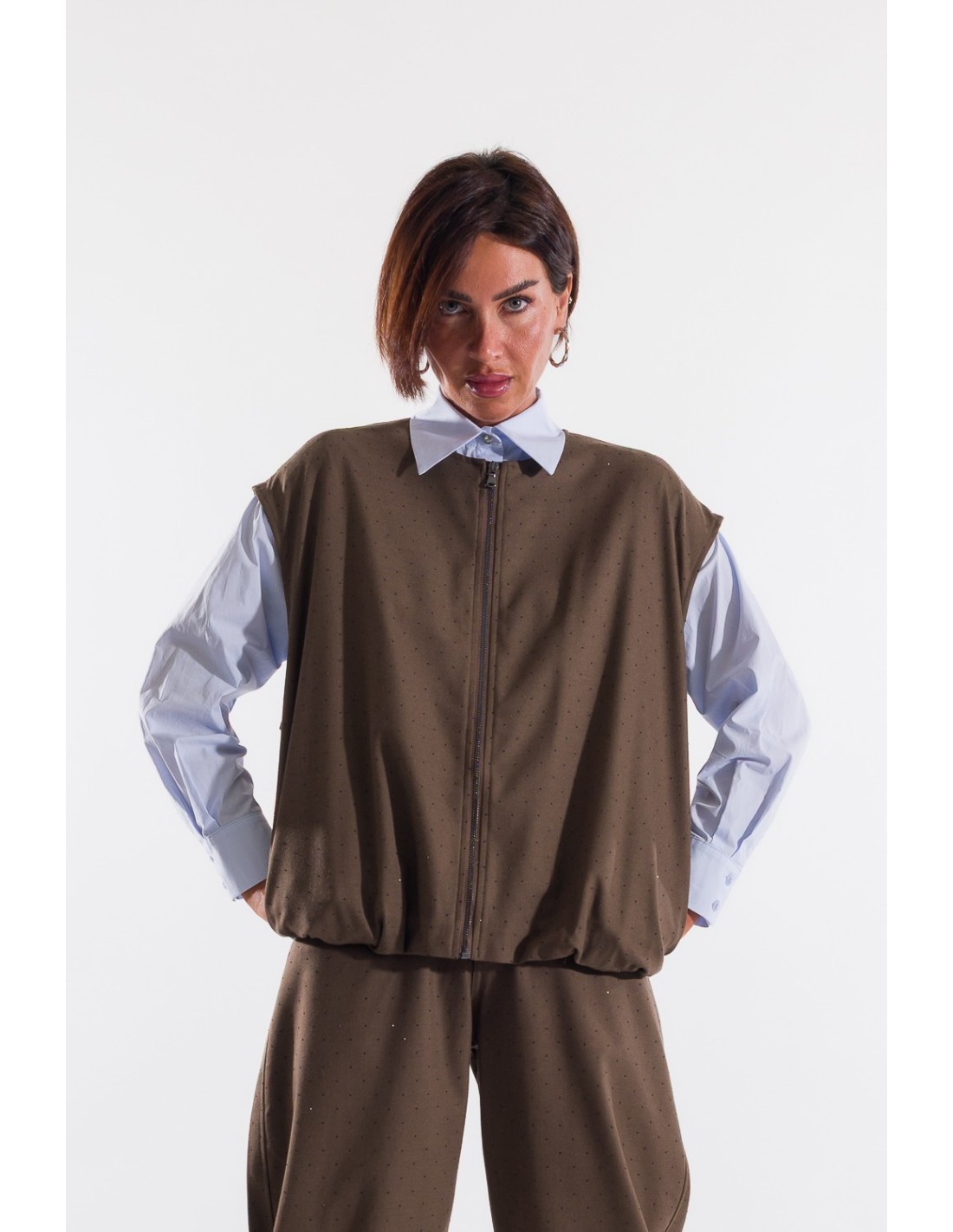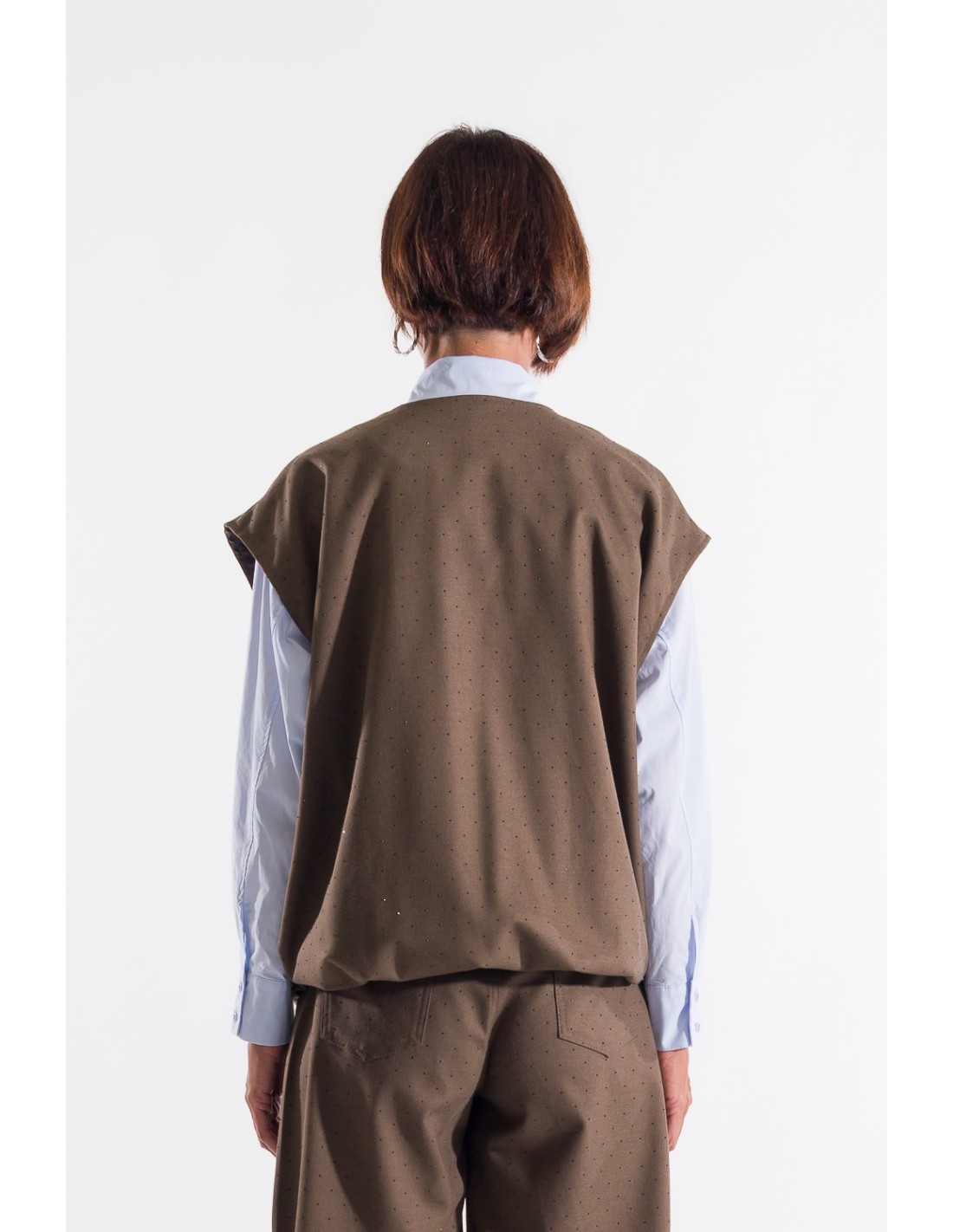 Kontatto apresenta um colete com um corte macio e direito, ideal para sobreposição. Tecido compacto com micro textura pontilhada, agradável na pele. Fecho de correr frontal e barra ligeiramente elástica valorizam a silhueta e regulam o volume. Perfeito sobre camisa para o escritório ou com denim para o dia a dia.