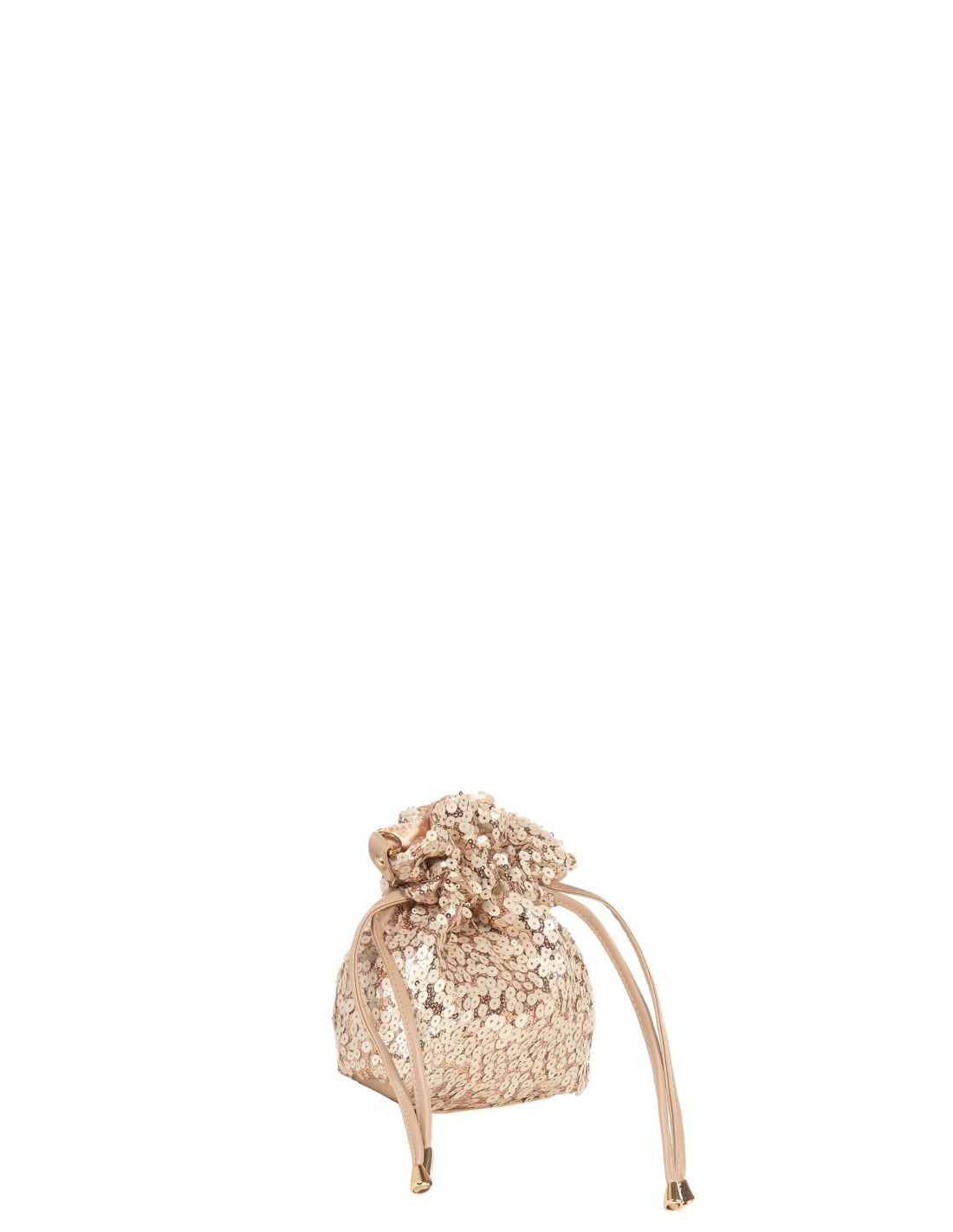 Mini bag macia e compacta, revestida de lantejoulas sobre uma base luminosa com remates em material com efeito pele. Fecho de cordão que cria um elegante franzido e alça de corrente removível para a usar como crossbody ou como pochette. Perfeita para festas e cerimónias.