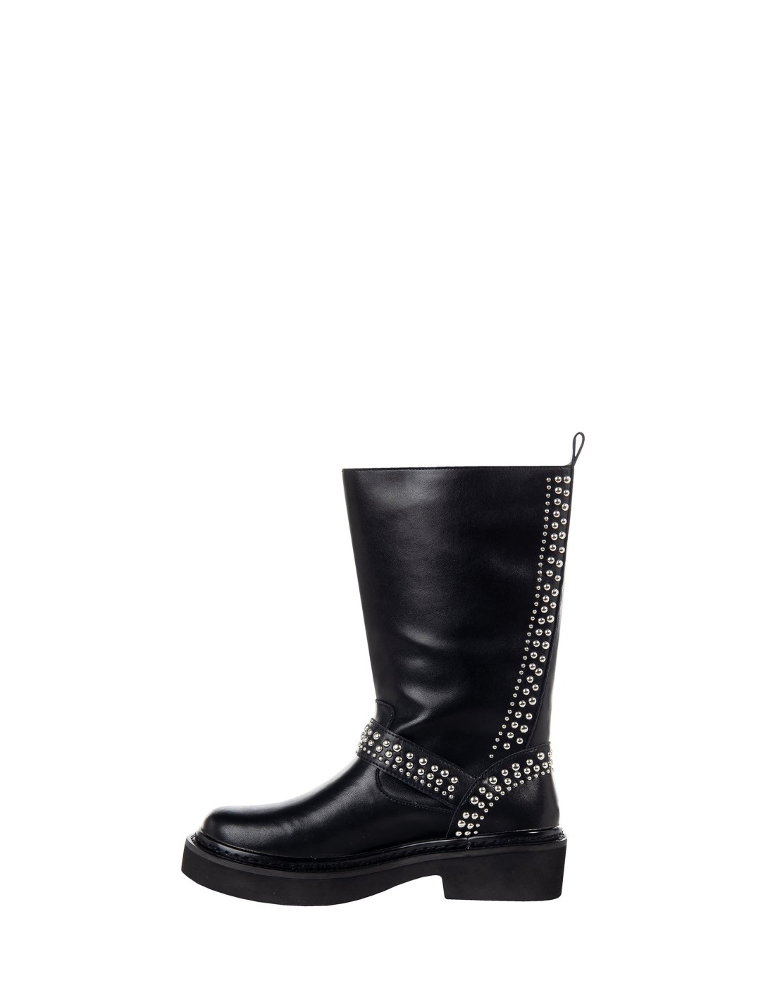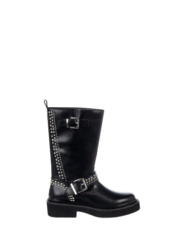 Bota alta de perna direita, de ajuste confortável. Pele lisa com acabamento macio e sola plana estável para caminhar durante todo o dia. Tiras ajustáveis com fivelas metálicas e perfil com tachas que adelgaçam a silhueta. Perfeitas para looks urbanos: da ganga do dia a dia a um minivestido de aperitivo.