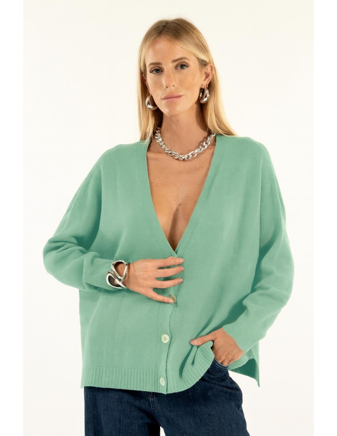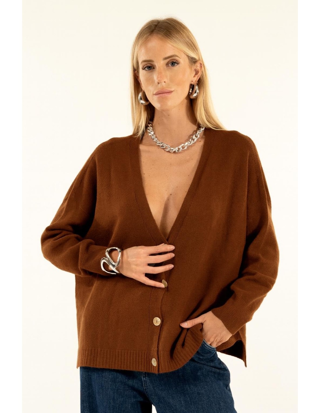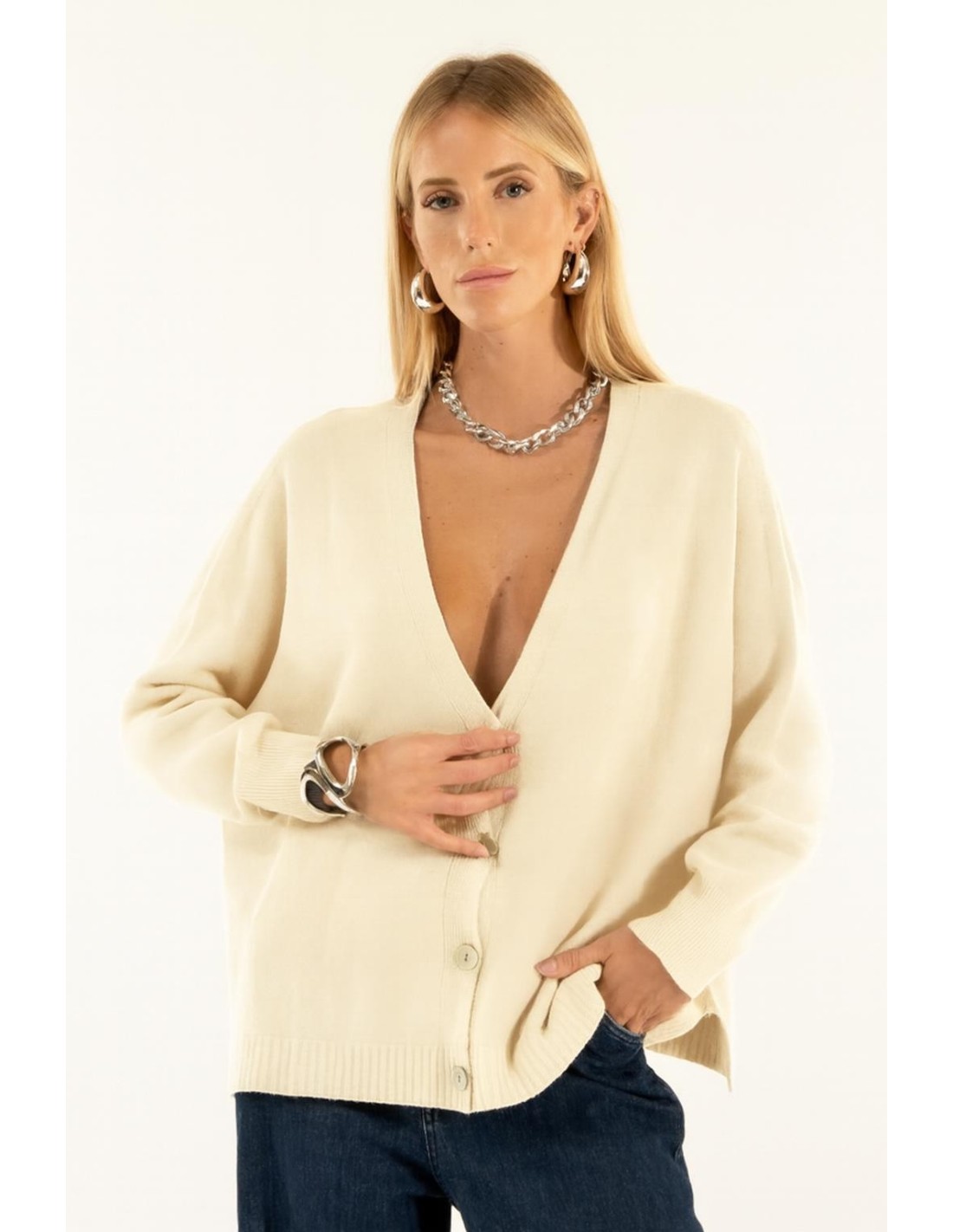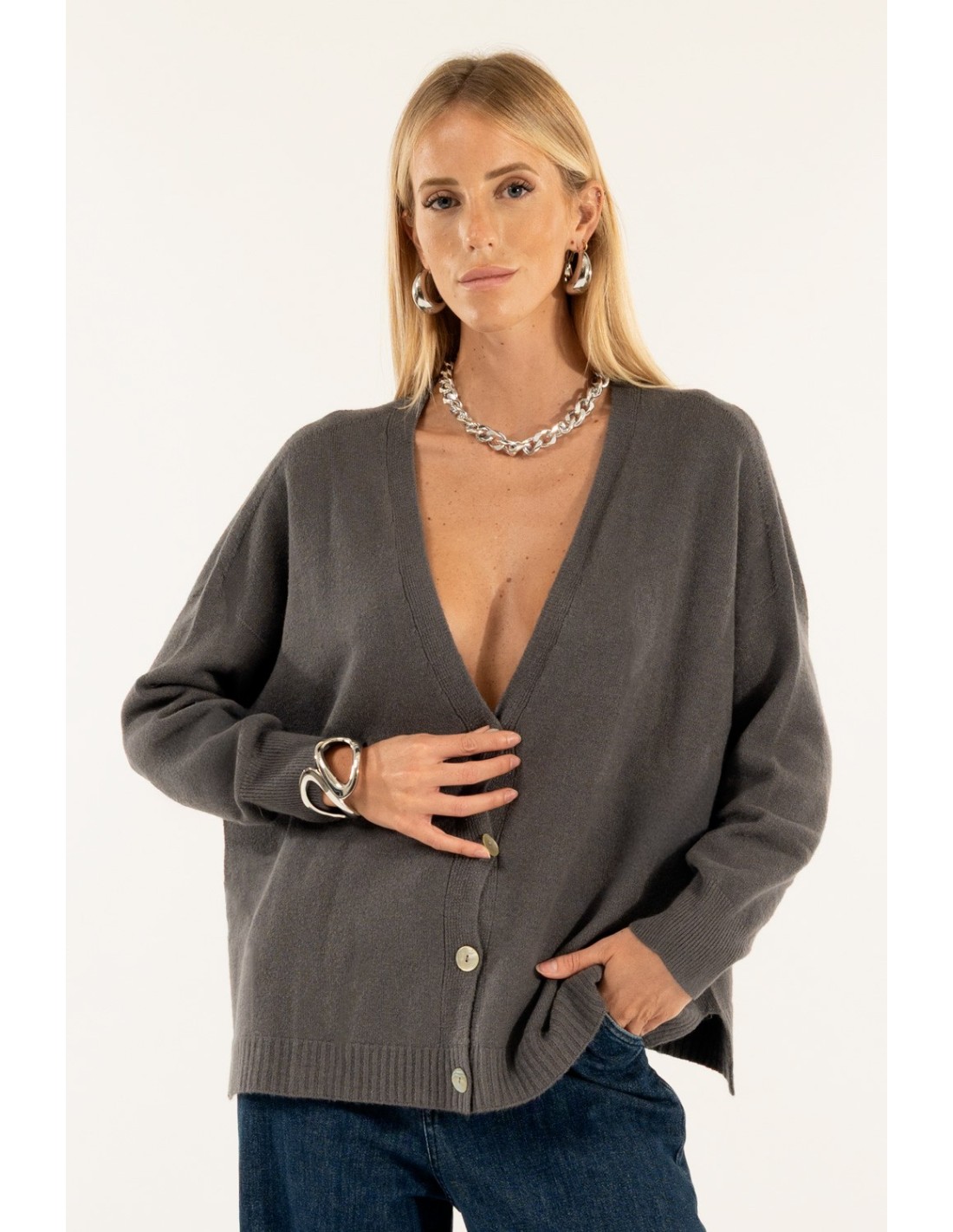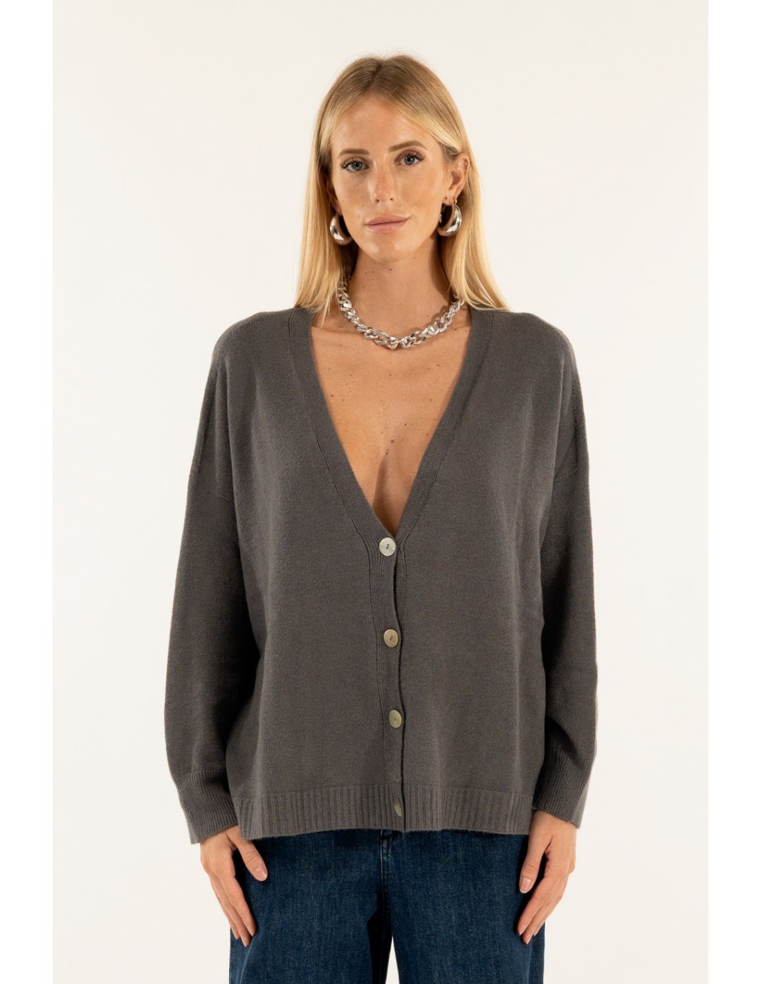 Malha aberta Kontatto com um corte suave e descontraído que realça a silhueta sem a apertar. Tricot macio com mão quente e acabamento canelado. Decote em V profundo e abotoamento frontal com fendas laterais: pormenores que o tornam versátil. Perfeito do escritório para o dia a dia, também como camada sobre tops e camisas.