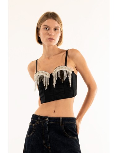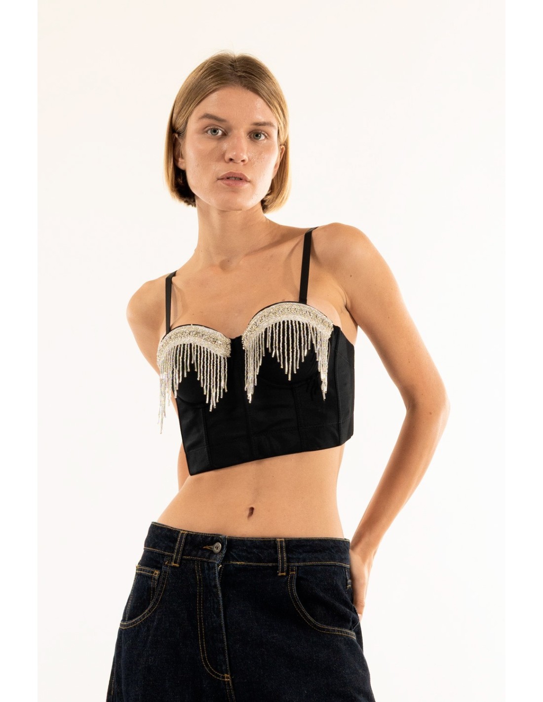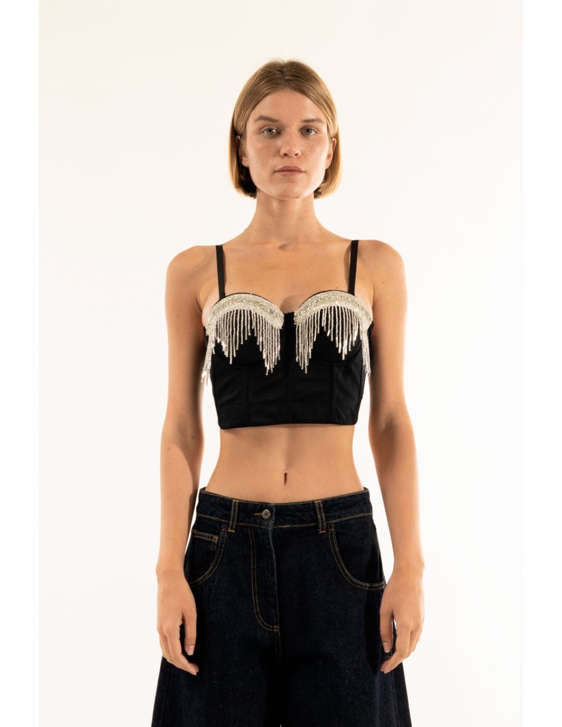 Kontatto reimagina o top de festa: corte justo que esculpe a silhueta, copas modeladas e alças reguláveis para conforto à medida. Tecido compacto com ligeira estrutura. Bordado tipo joia e franjas luminosas no decote, fecho posterior com ganchos. Perfeito com denim ou fato para noites e ocasiões especiais.