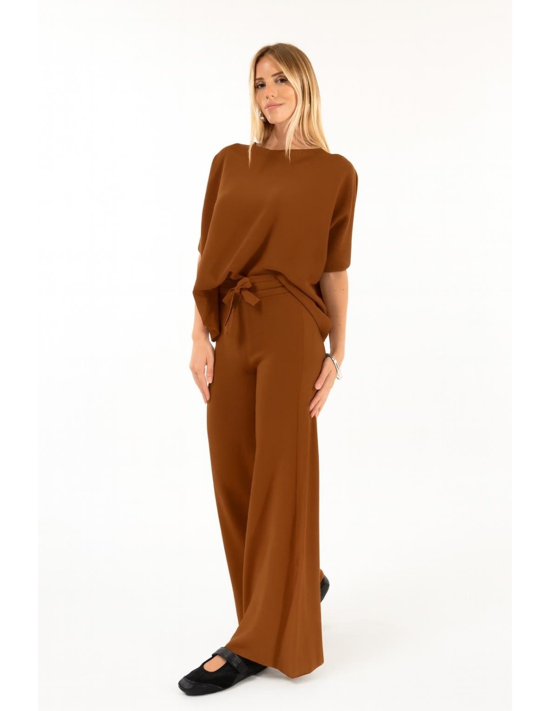 Kontatto assina umas calças de perna larga com um corte macio e fluido. Malha trabalhada em ponto arroz para uma textura suave e envolvente, cintura alta canelada com cordão atado que define a silhueta sem apertar. Perfeito do escritório ao fim de semana: conforto elegante para o trabalho, viagens e para o dia a dia.