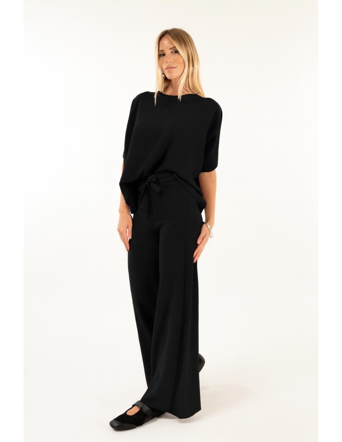 Kontatto assina umas calças de perna larga com um corte macio e fluido. Malha trabalhada em ponto arroz para uma textura suave e envolvente, cintura alta canelada com cordão atado que define a silhueta sem apertar. Perfeito do escritório ao fim de semana: conforto elegante para o trabalho, viagens e para o dia a dia.