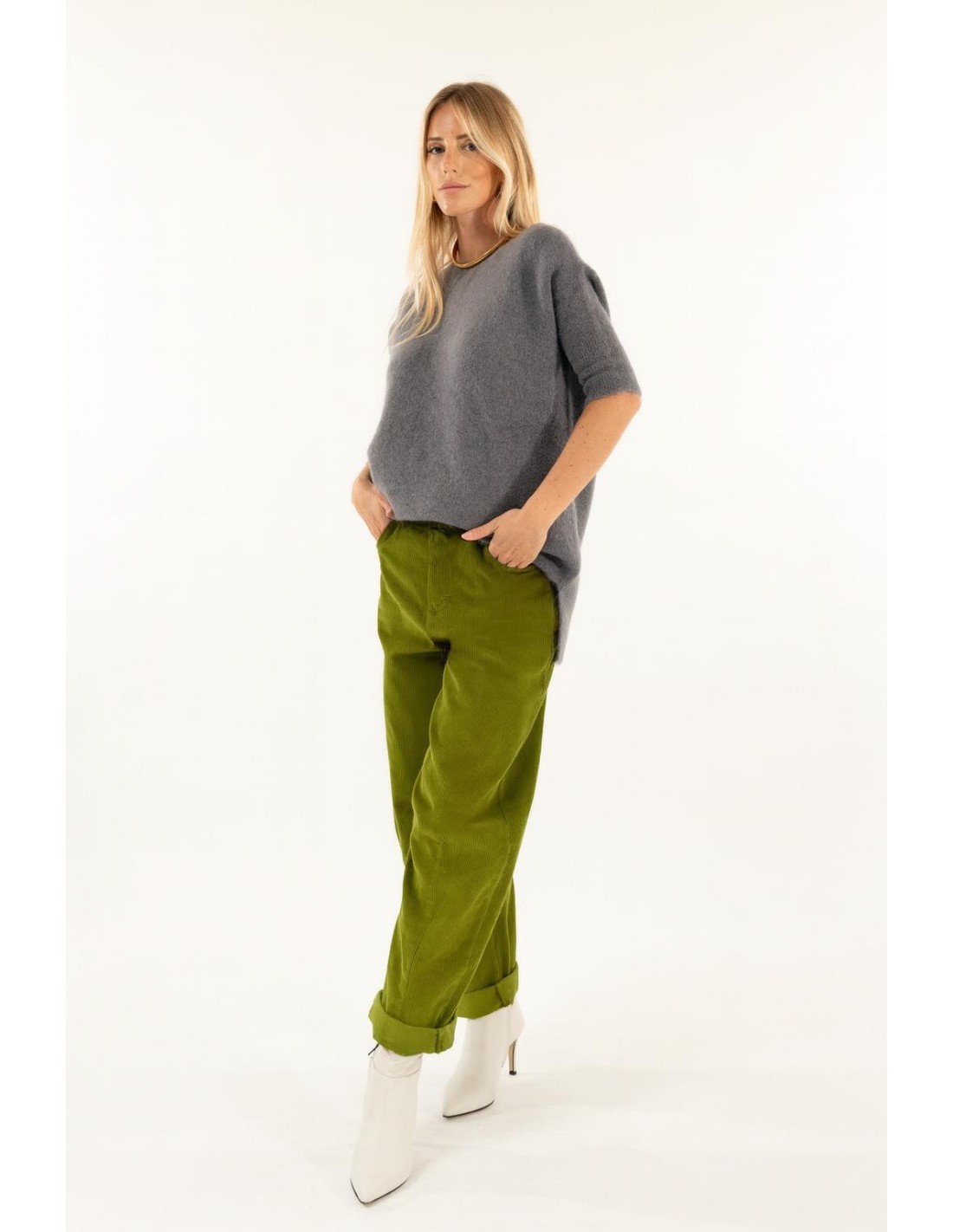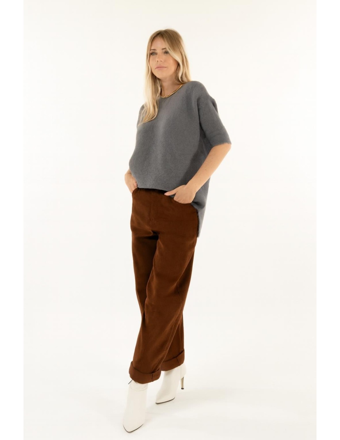 Kontatto assina uma calça de perna larga com volumes suaves e cintura regular, concebida para realçar a silhueta sem sacrificar o conforto. Em veludo às riscas de milleraies, confere uma textura rica e quente. Pormenores: pregas na parte inferior e bolsos de remendo. Perfeito para o escritório com botins ou para usar casualmente ao fim de semana.