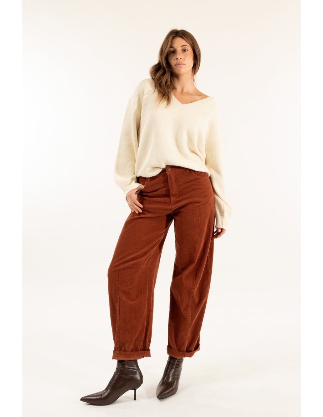 Kontatto assina uma calça de perna larga com volumes suaves e cintura regular, concebida para realçar a silhueta sem sacrificar o conforto. Em veludo às riscas de milleraies, confere uma textura rica e quente. Pormenores: pregas na parte inferior e bolsos de remendo. Perfeito para o escritório com botins ou para usar casualmente ao fim de semana.