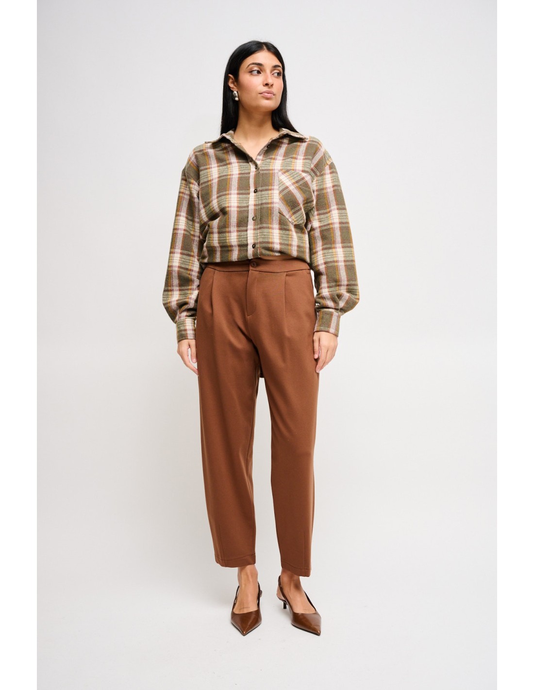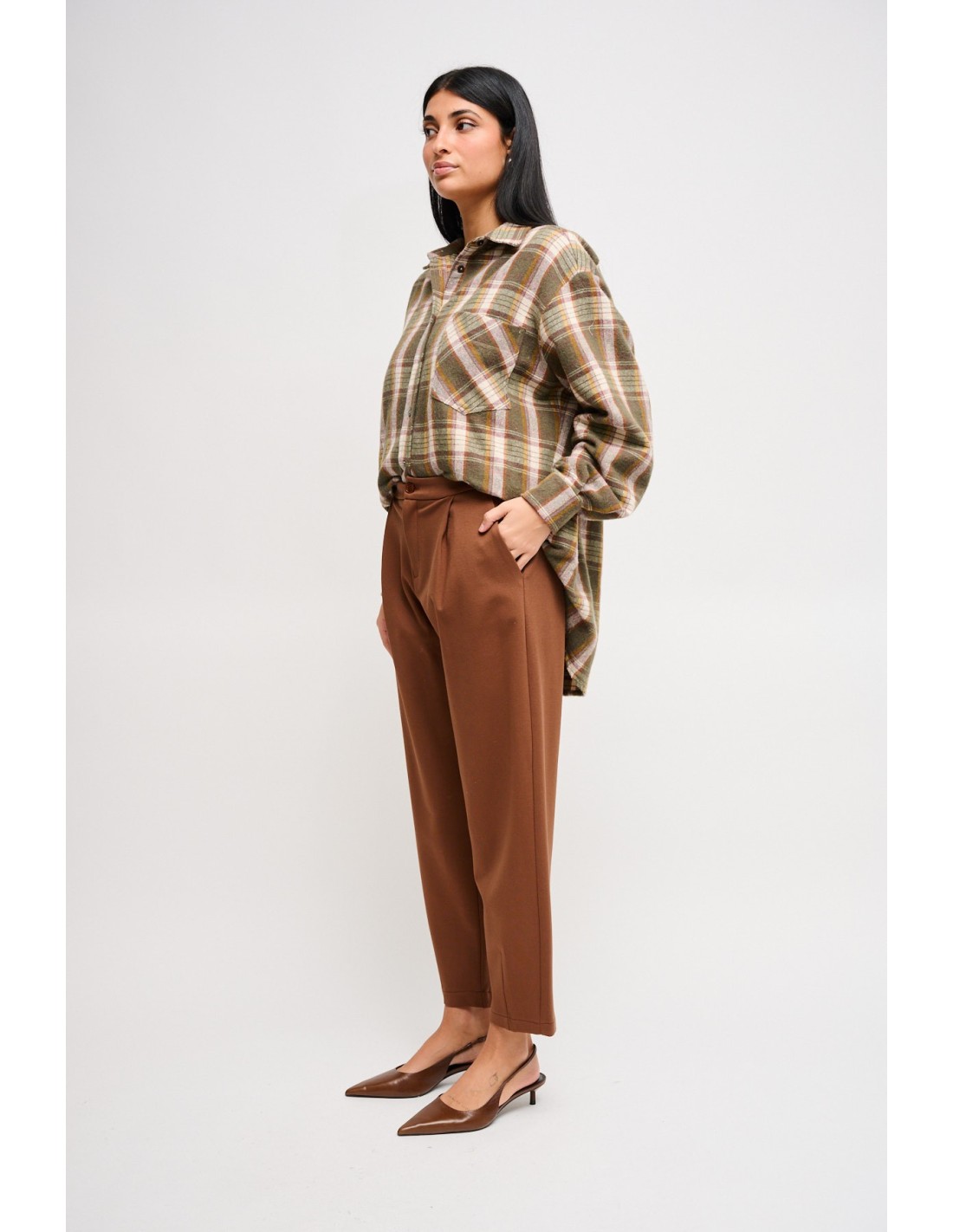 Maryley apresenta calças de corte suave e perna afunilada, em Punto Milano elástico: estrutura limpa que modela sem apertar. Cintura regular com pregas e fecho com botão, bolsos laterais e comprimento ao tornozelo para alongar. Versáteis do escritório ao dia a dia, também perfeitas com blazer para looks impecáveis.