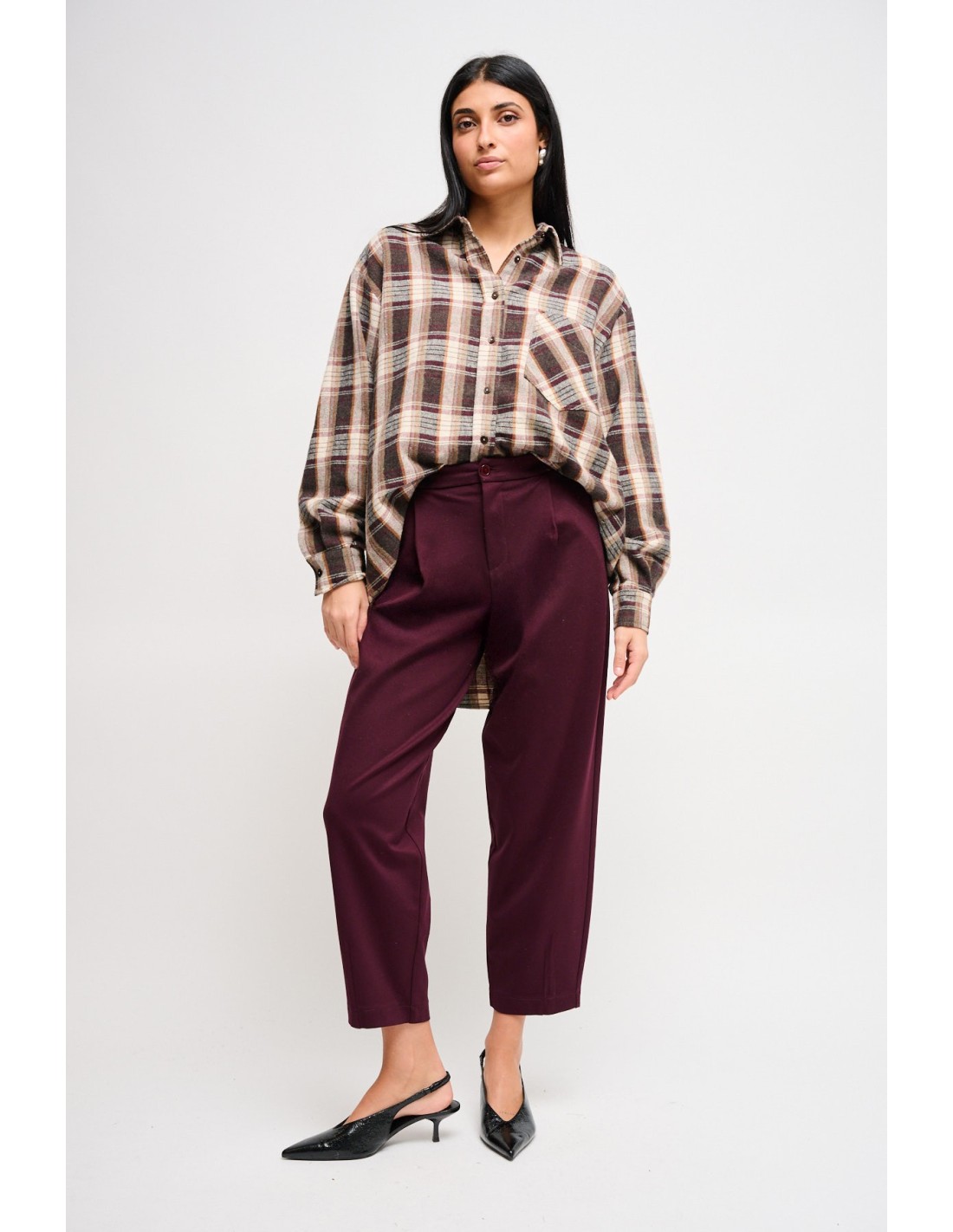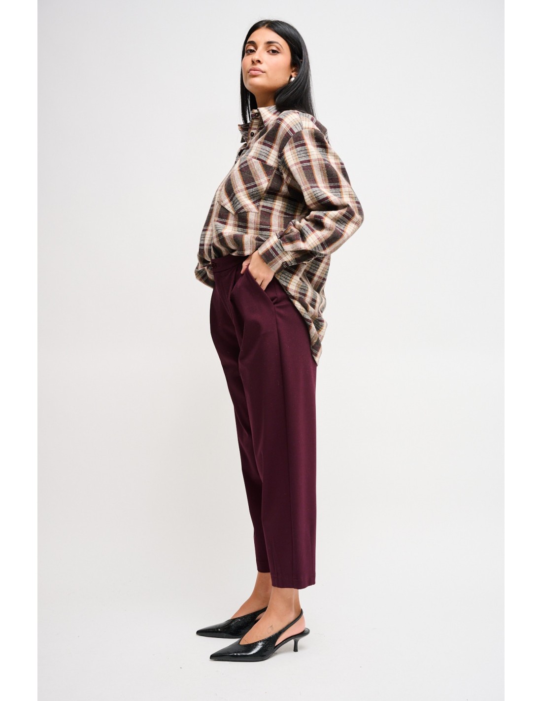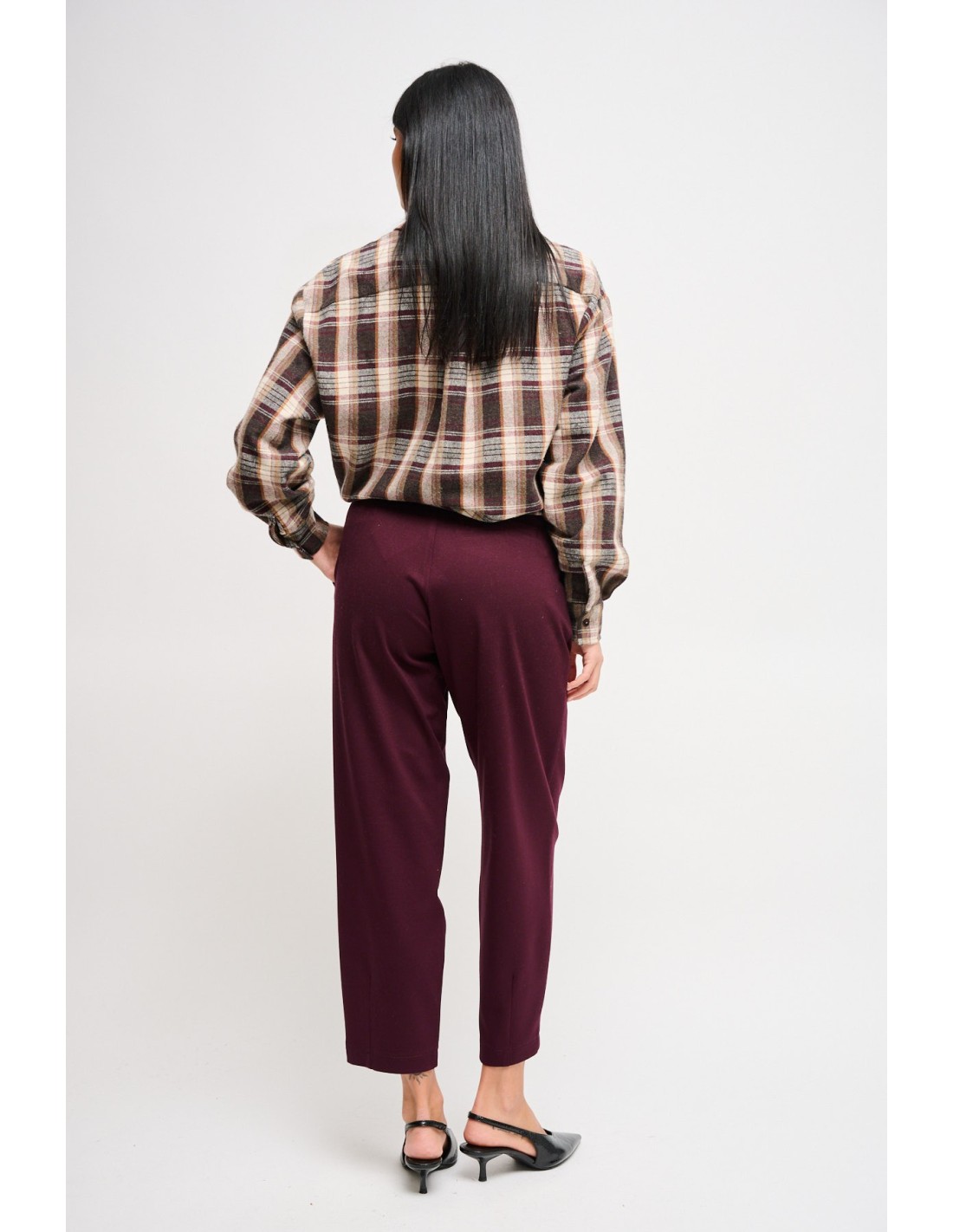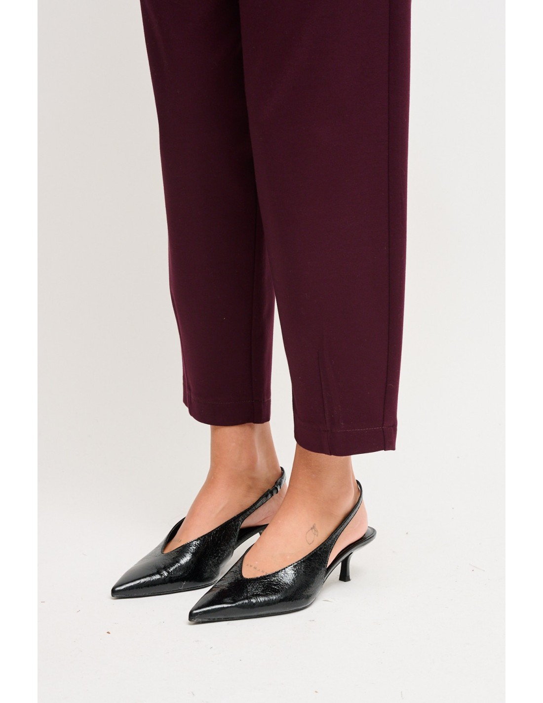 Maryley apresenta calças de corte suave e perna afunilada, em Punto Milano elástico: estrutura limpa que modela sem apertar. Cintura regular com pregas e fecho com botão, bolsos laterais e comprimento ao tornozelo para alongar. Versáteis do escritório ao dia a dia, também perfeitas com blazer para looks impecáveis.