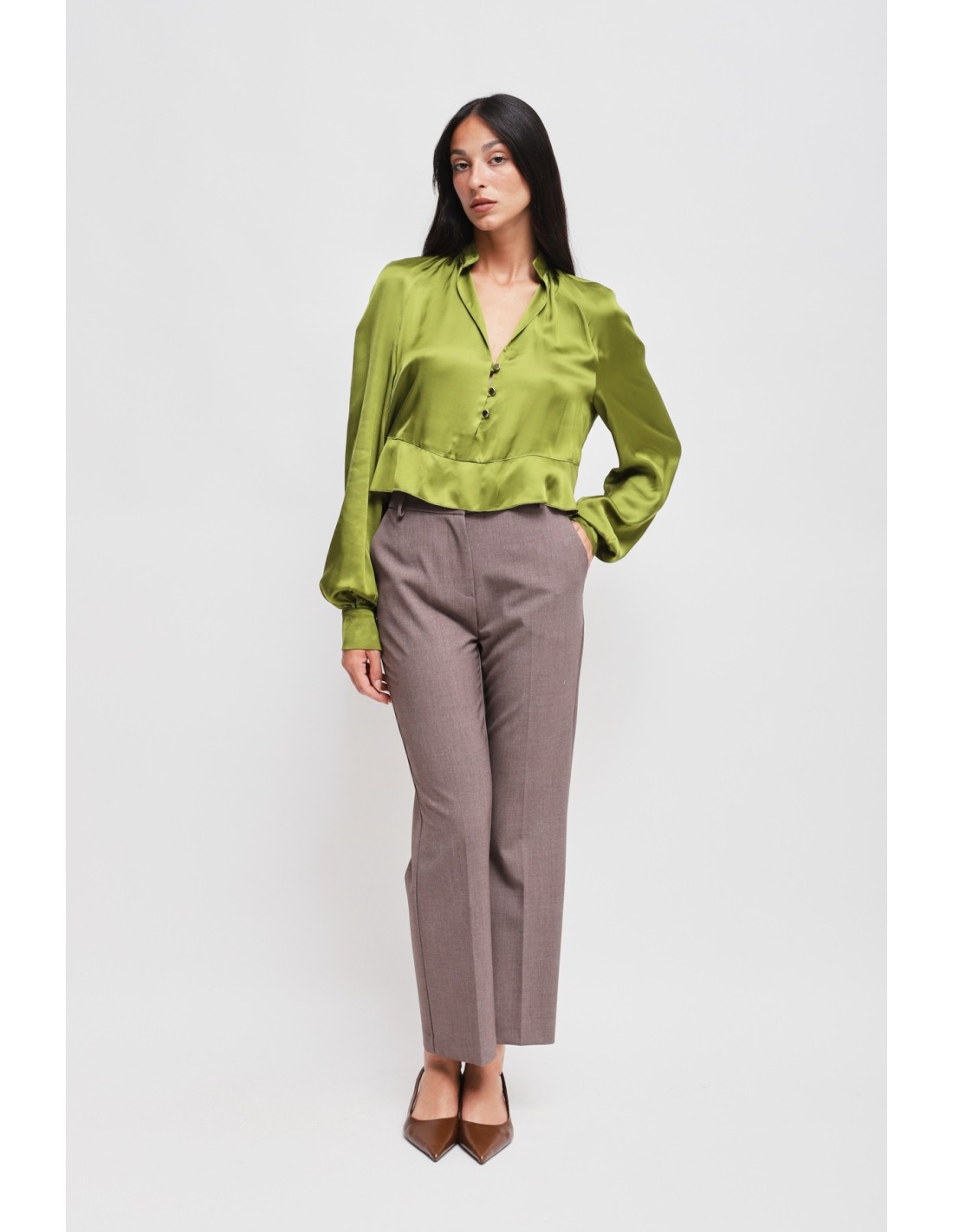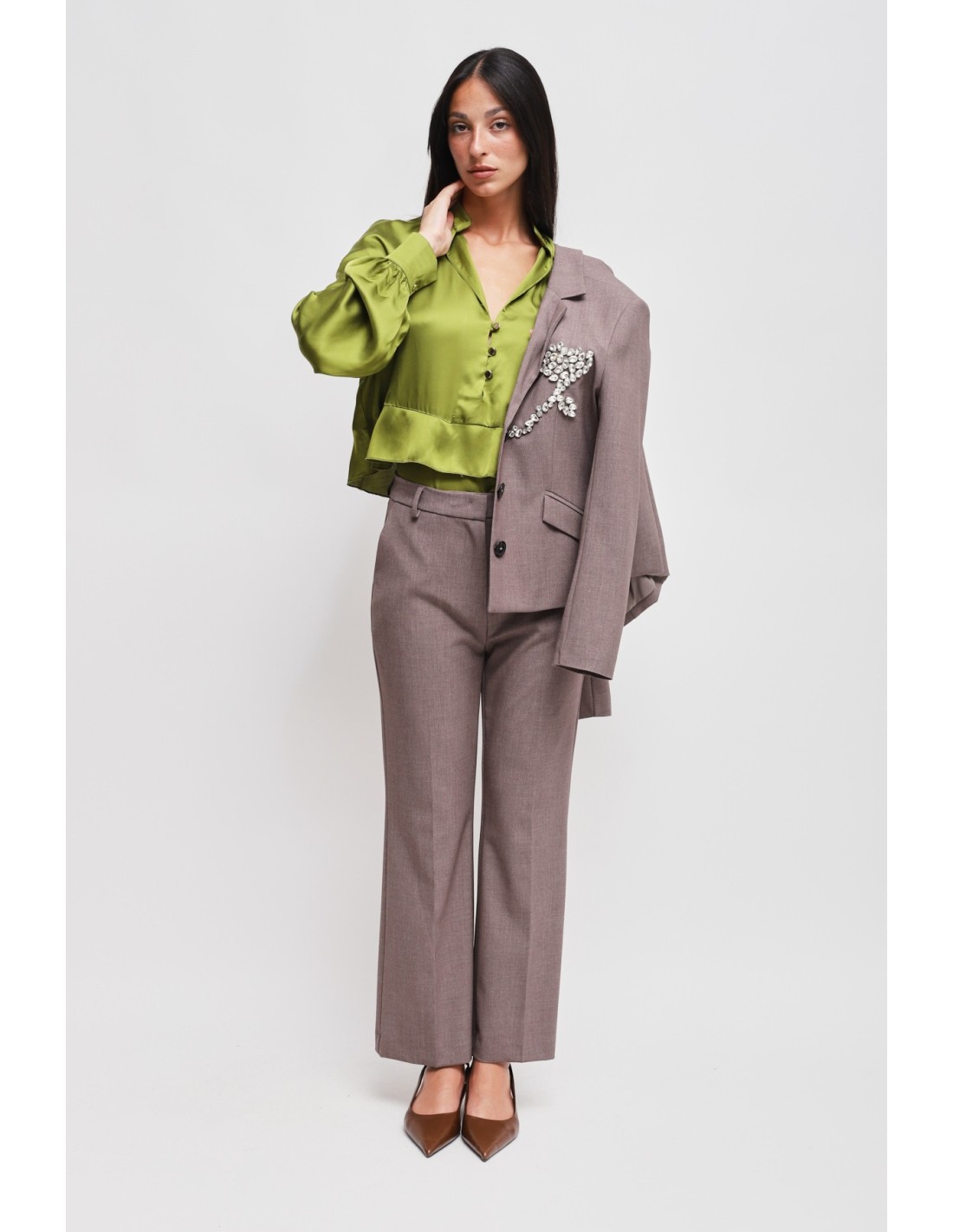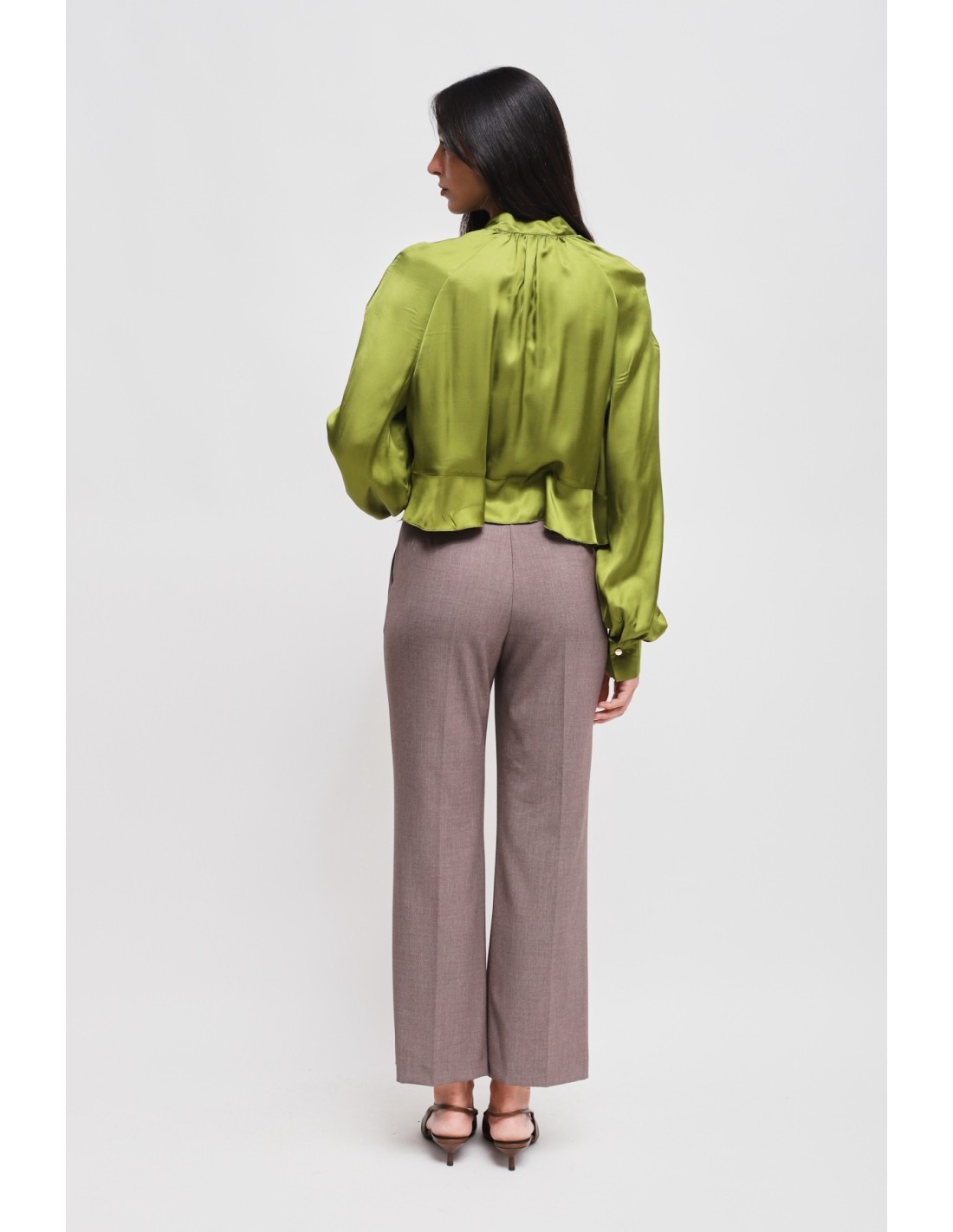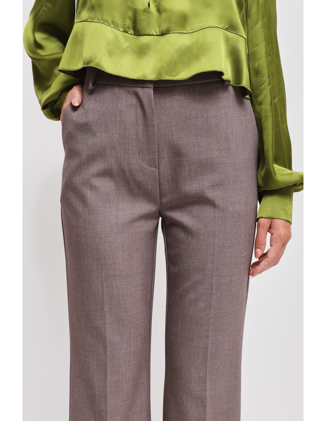 Calças com perna ligeiramente evasé, corte regular que alonga a silhueta. Tecido fluido com toque macio e confortável. Cintura média com passantes e prega vincada frontal, bolsos laterais para praticidade. Perfeitas do escritório ao aperitivo, combinam com blazers ou blusas para uma elegância sem esforço.