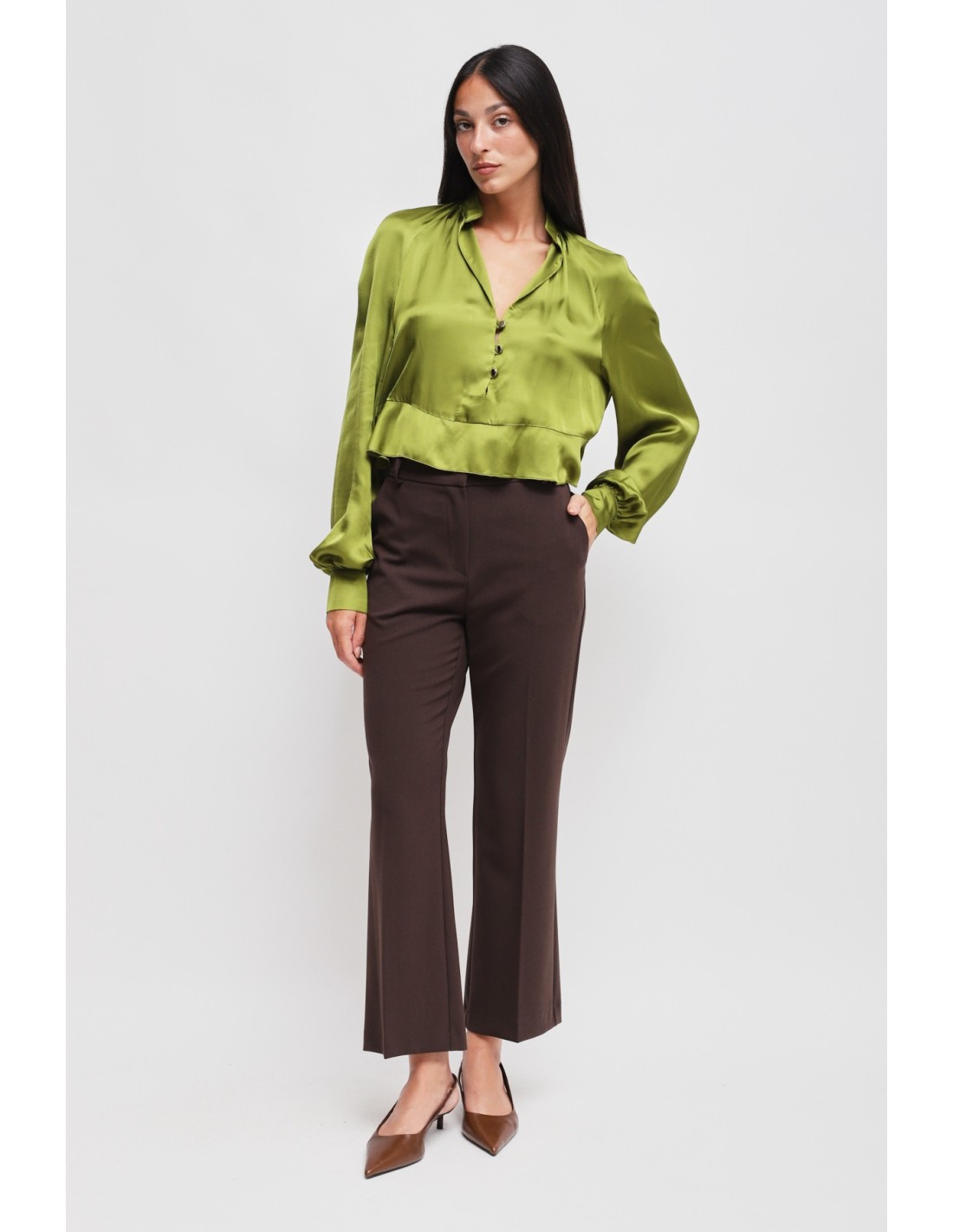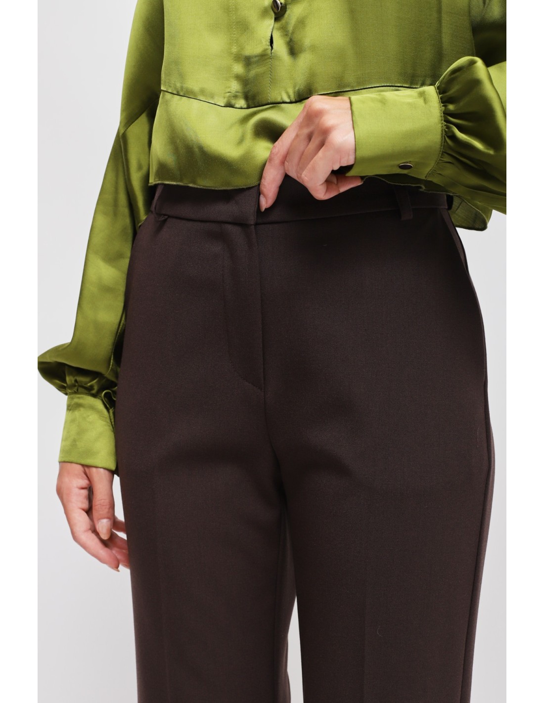 Calças com perna ligeiramente evasé, corte regular que alonga a silhueta. Tecido fluido com toque macio e confortável. Cintura média com passantes e prega vincada frontal, bolsos laterais para praticidade. Perfeitas do escritório ao aperitivo, combinam com blazers ou blusas para uma elegância sem esforço.