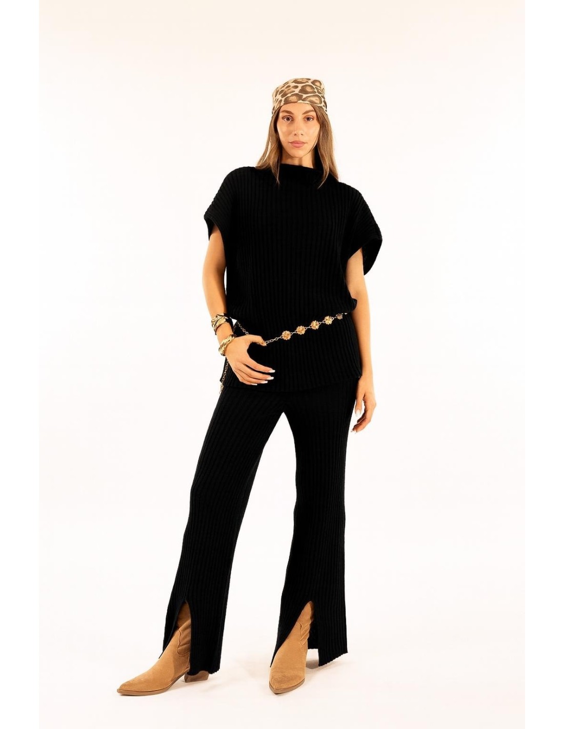 Calças Kontatto de perna reta com corte cómodo que alonga a silhueta. Malha canelada em tricô macia e elástica para conforto diário. Aberturas frontais no tornozelo e cintura elástica que envolve sem apertar. Perfeitas com botas para um escritório casual ou para um look quotidiano chique.