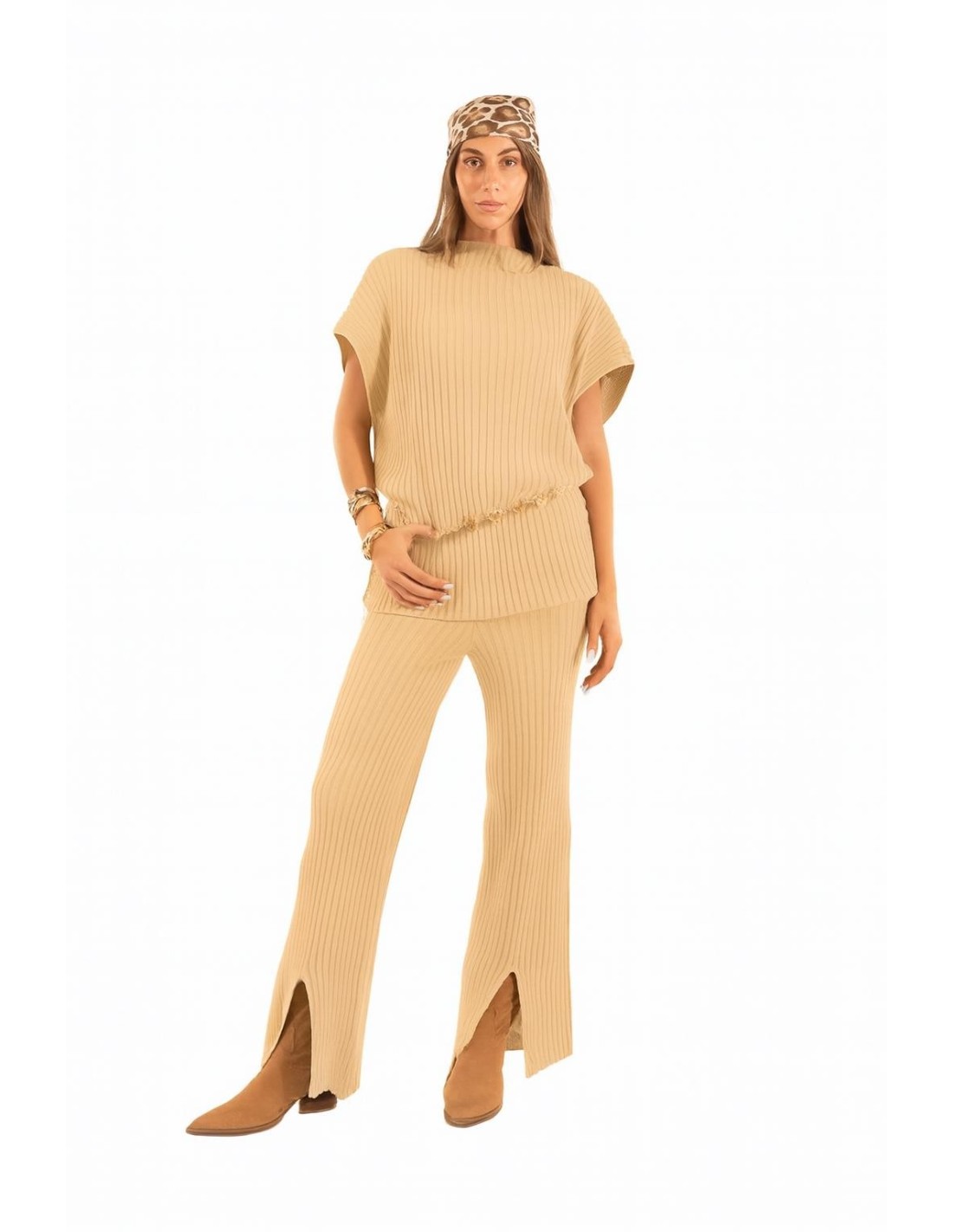 Calças Kontatto de perna reta com corte cómodo que alonga a silhueta. Malha canelada em tricô macia e elástica para conforto diário. Aberturas frontais no tornozelo e cintura elástica que envolve sem apertar. Perfeitas com botas para um escritório casual ou para um look quotidiano chique.