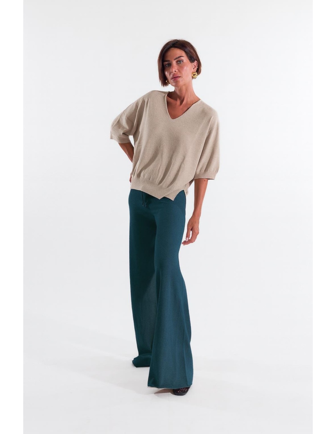 Kontatto assina uma calça wide leg de cintura média com um fit macio e fluido, que alonga a silhueta. Malha leve com micro-paetês e toque suave para um conforto que não prescinde do brilho. Cordão na cintura com terminais metálicos, perfil elástico. Perfeita para um chic do dia a dia, aperitivo ou festa descontraída.