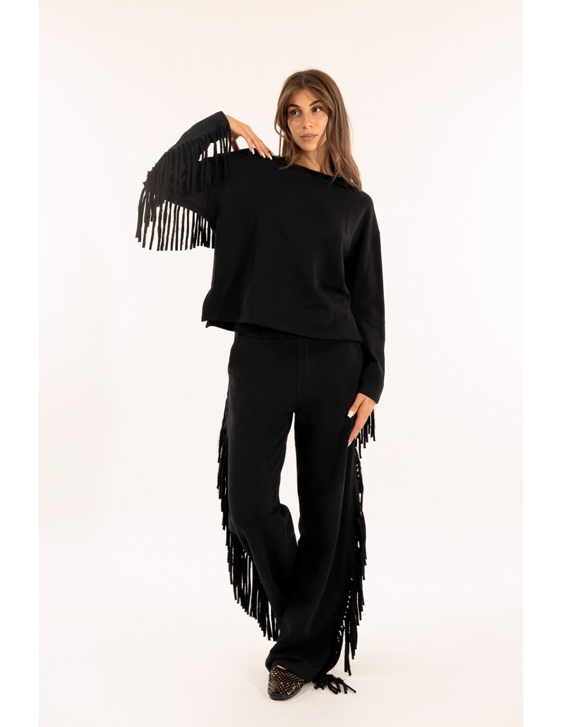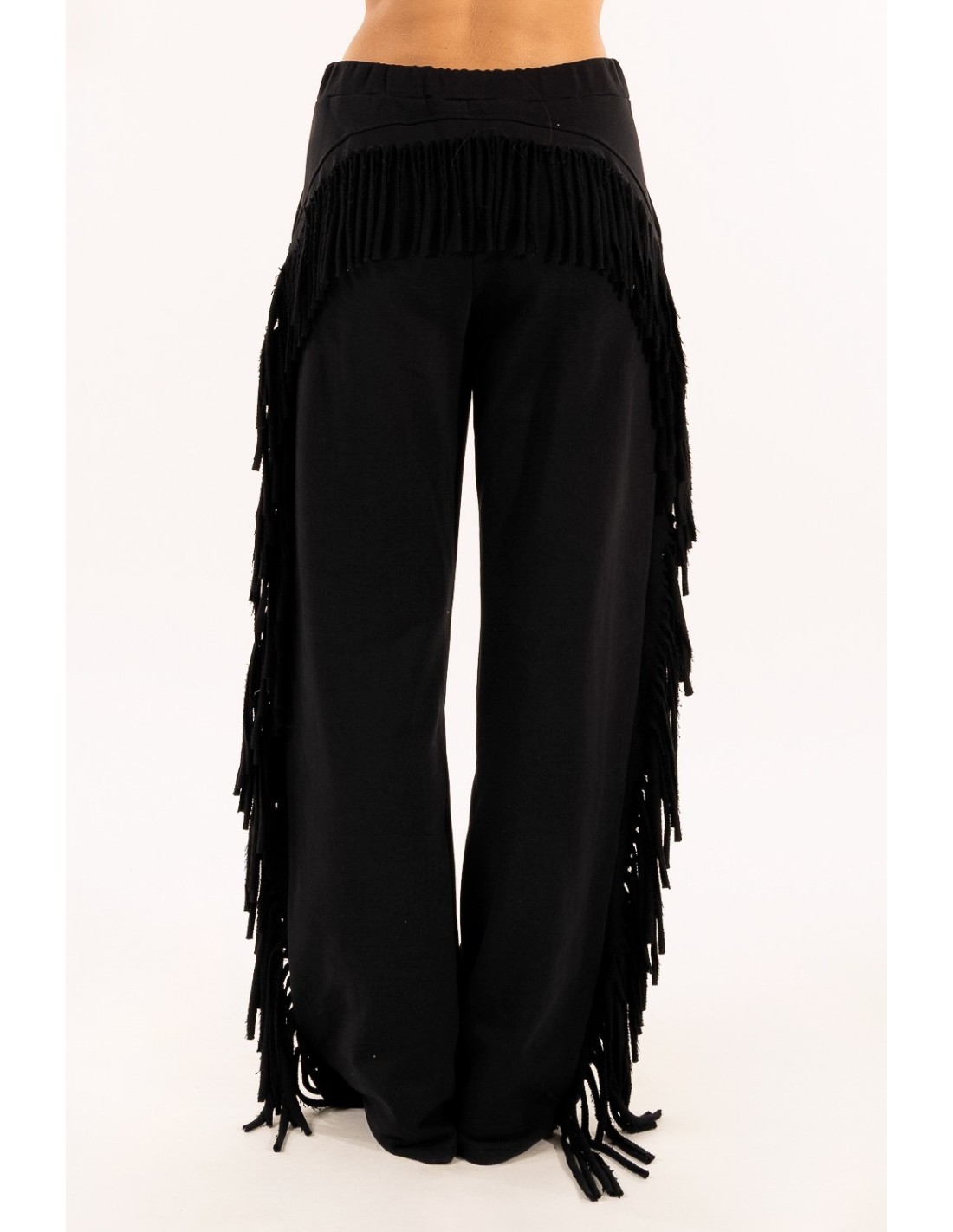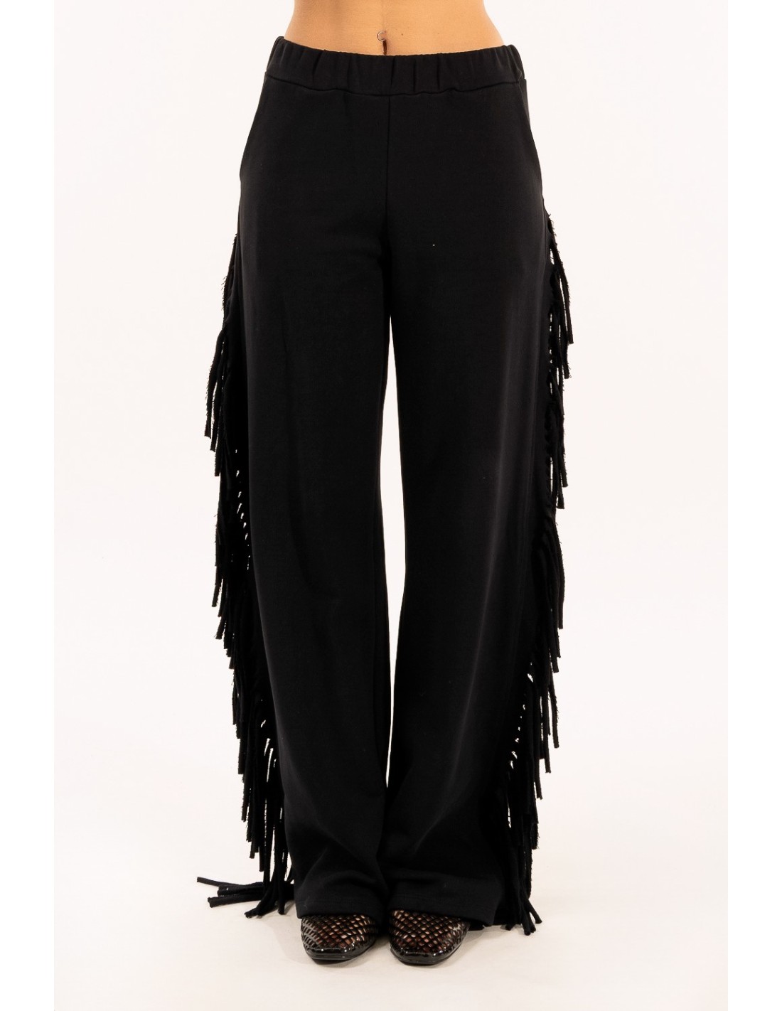 Calças de perna larga com um corte suave, em jersey fluido que acompanha o movimento. Franjas laterais e aplicação tipo capa nos quadris afinam a silhueta e acrescentam dinamismo. Cós elástico para conforto diário. Perfeitas do aperitivo à festa, também com botins ou sandálias.