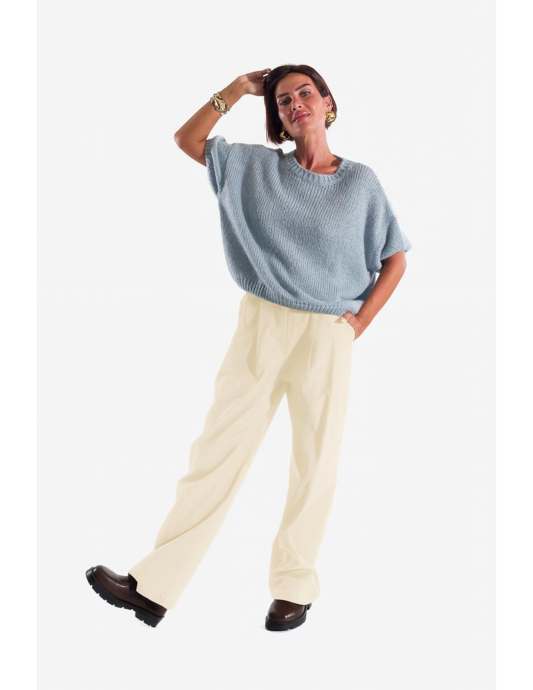 Kontatto assina uma calça ampla de corte relaxado que alonga a silhueta. Confeccionada em algodão compacto com toque macio, oferece conforto todo o dia. Prega frontal e fecho com botão e fecho de correr definem a linha. Perfeita do escritório ao tempo livre, combina com malhas suaves ou camisas de corte limpo.