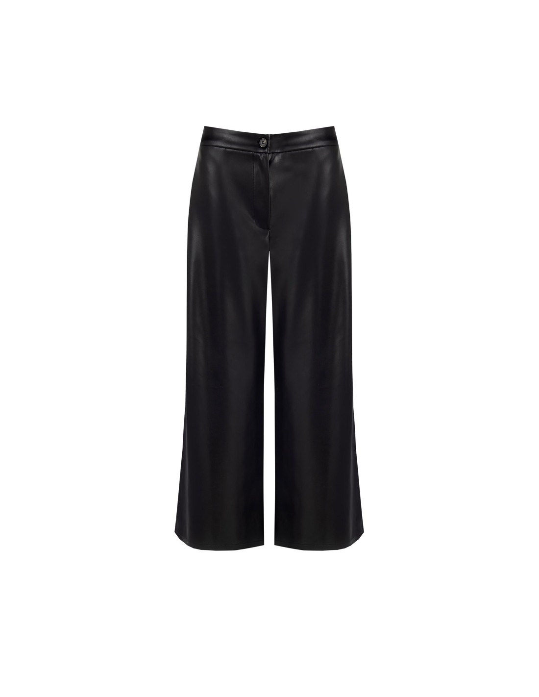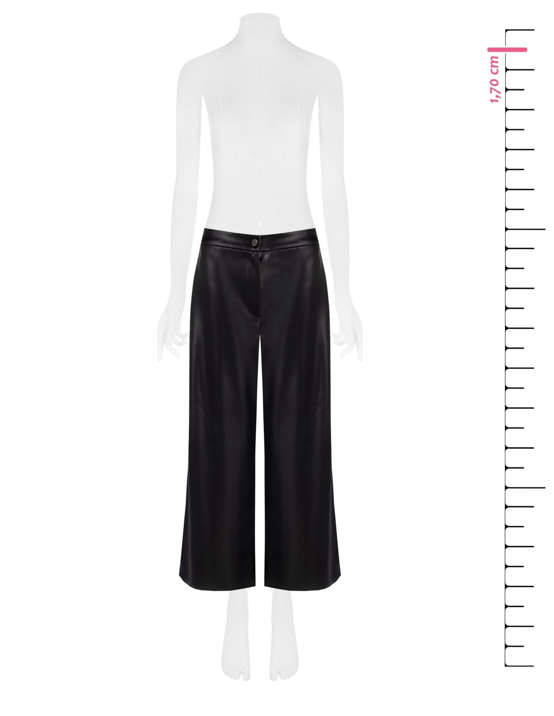 Cropped de perna larga, corte direito que alonga e deixa liberdade de movimento. Pele sintética macia e lisa, efeito segunda pele. Cintura média com botão e fecho de correr ocultos, bolsos laterais e pormenores posteriores. Perfeitos do escritório ao aperitivo: combinam com blazer ou malha para um look decidido mas confortável.