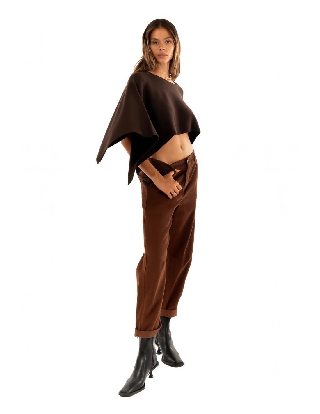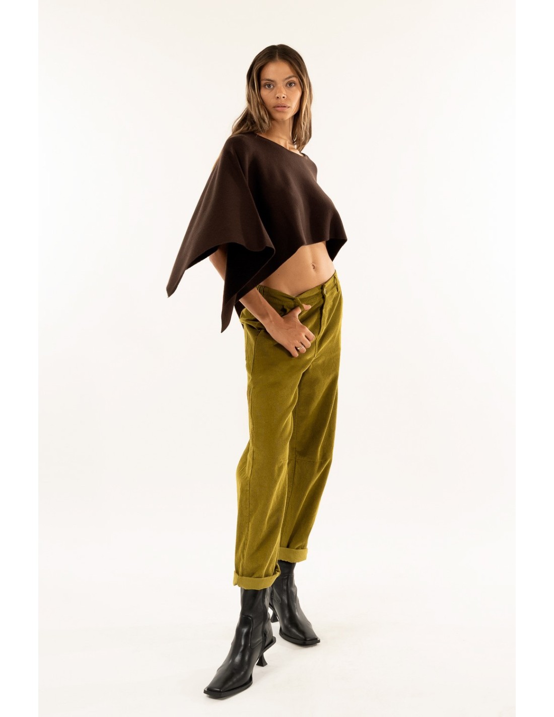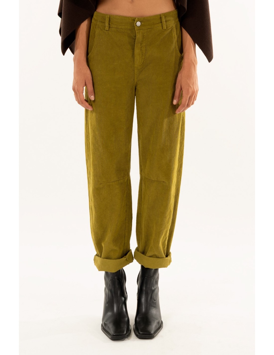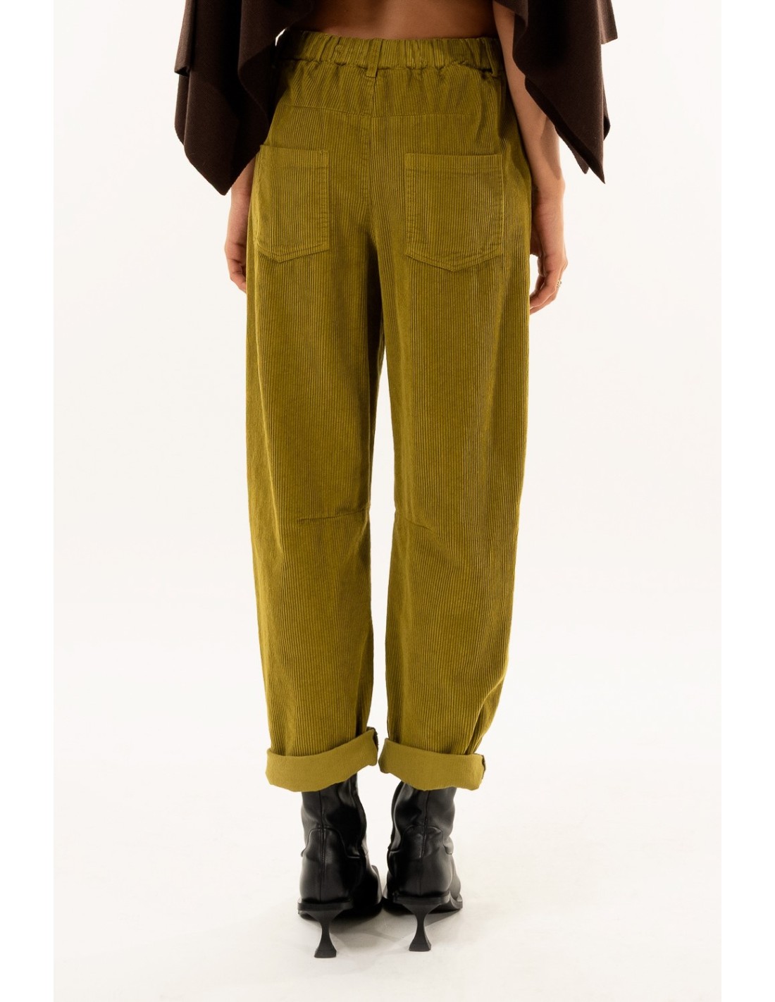 Kontatto reinterpreta a calça casual com cintura baixa e perna de cenoura macia: veludo cotelê para uma textura rica e confortável, dardos no joelho e fundo virado para cima para um toque contemporâneo. Bolsos de remendo nas costas e fecho à frente. Perfeitas para o dia a dia urbano, do brunch ao escritório criativo.