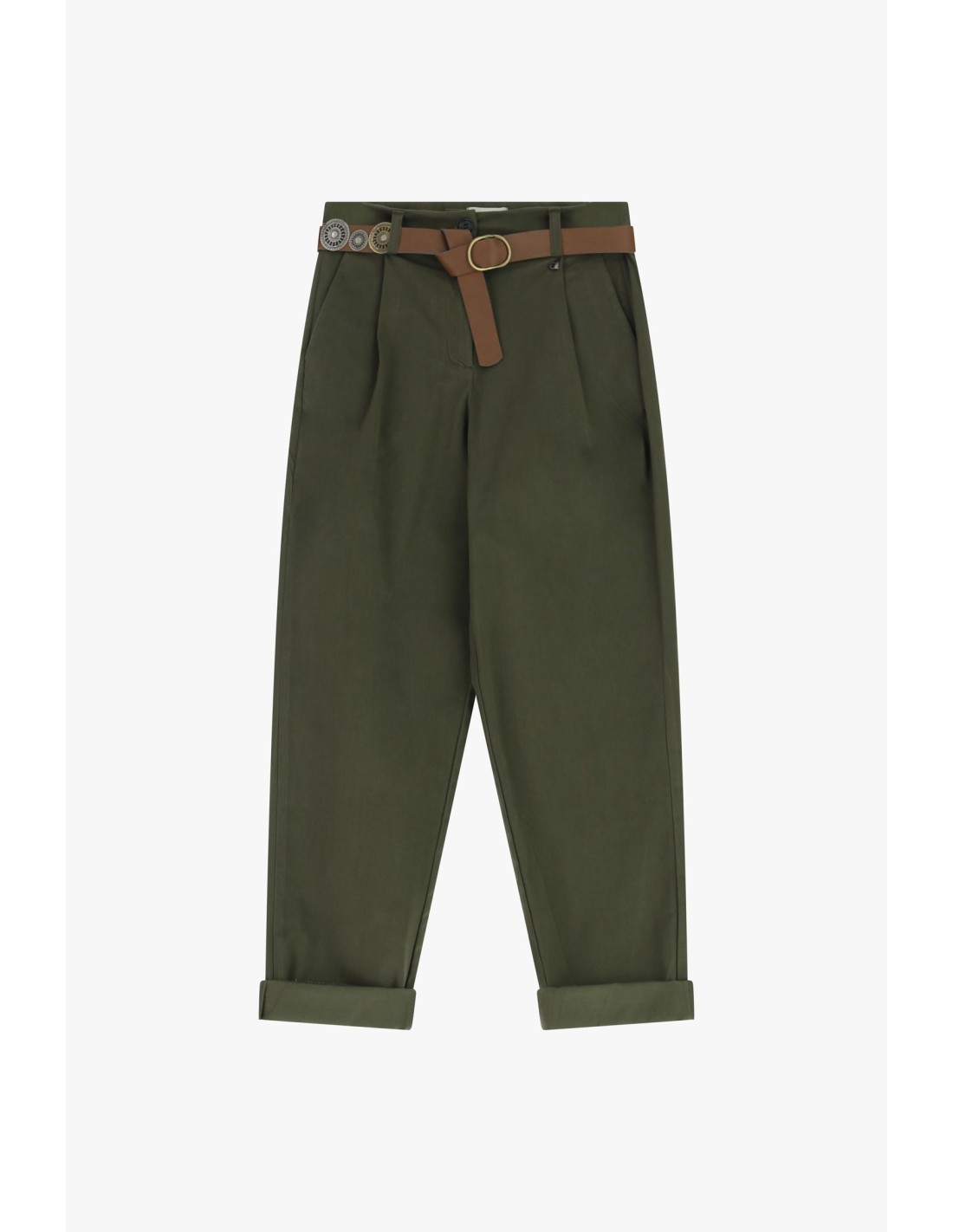 Calças chino justas com cinto decorativo e bainhas viradas
