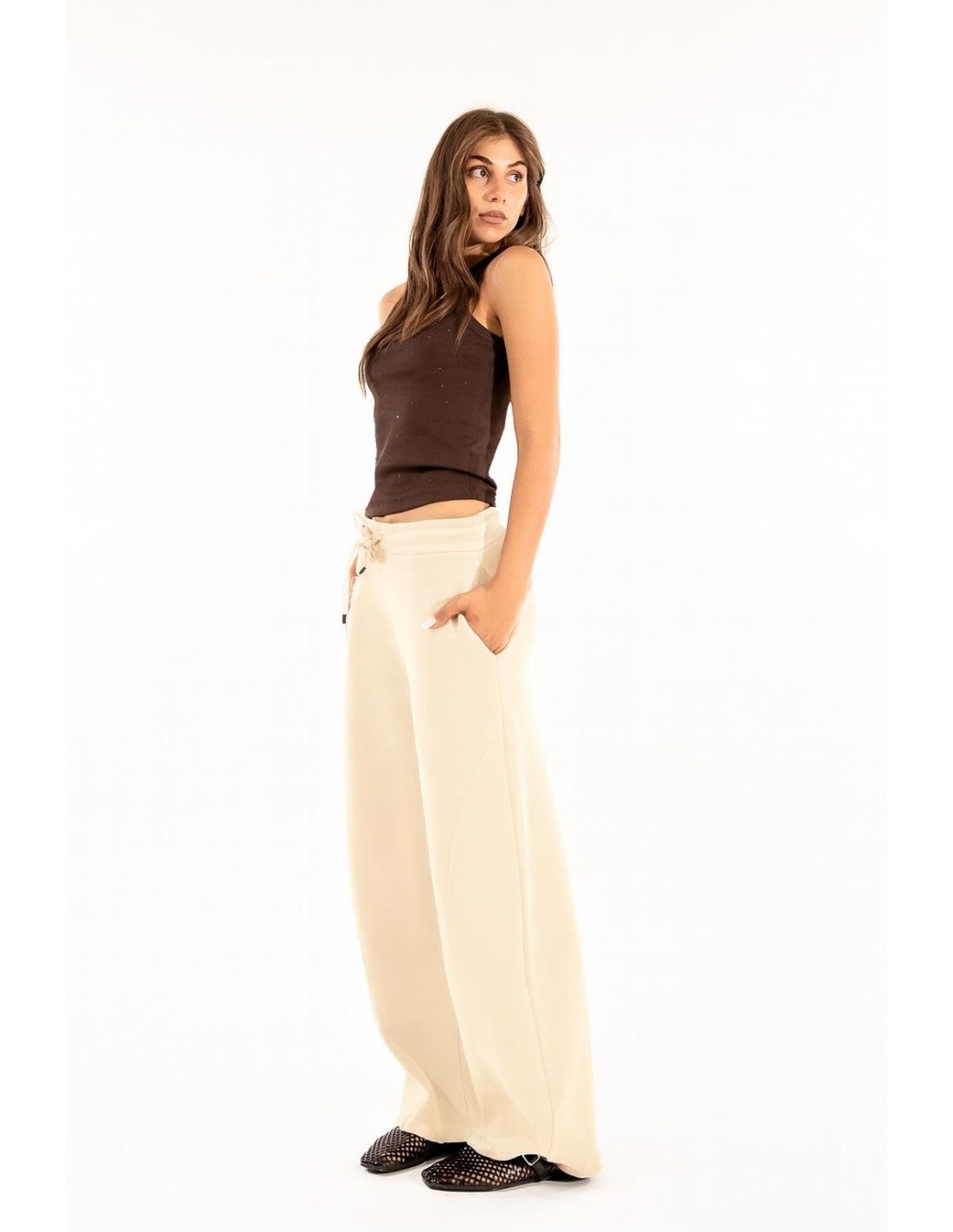 Kontatto apresenta umas calças com um fit relaxado e perna direita que realçam a silhueta. Confeccionadas em felpa macia e consistente para um conforto envolvente. Cós elástico com cordão trançado e bolsos laterais para maior praticidade. Ideais para o dia a dia urbano, viagem e lazer com estilo.