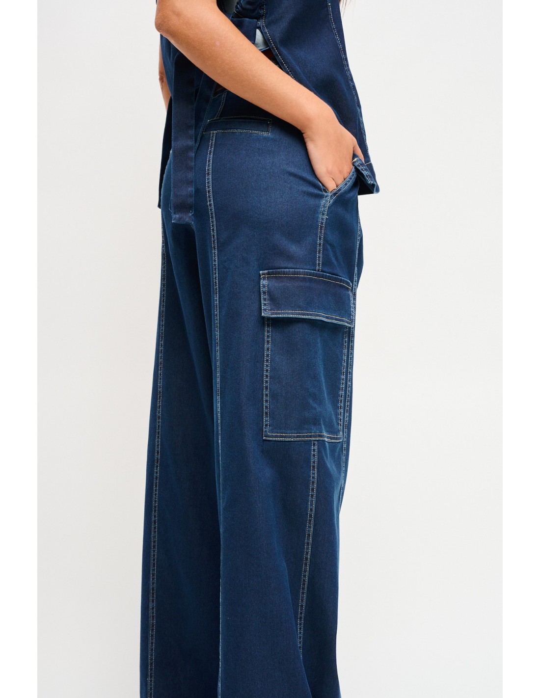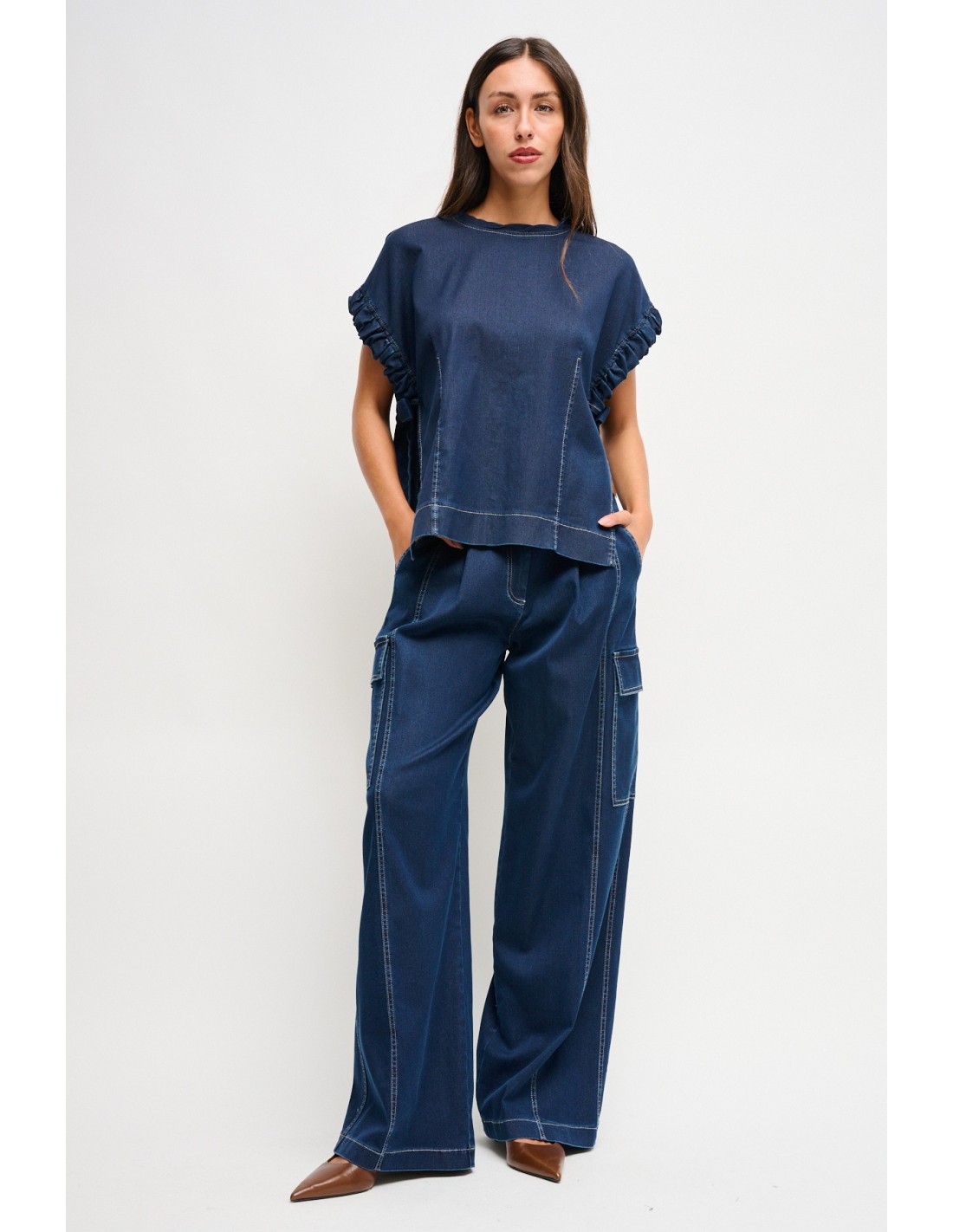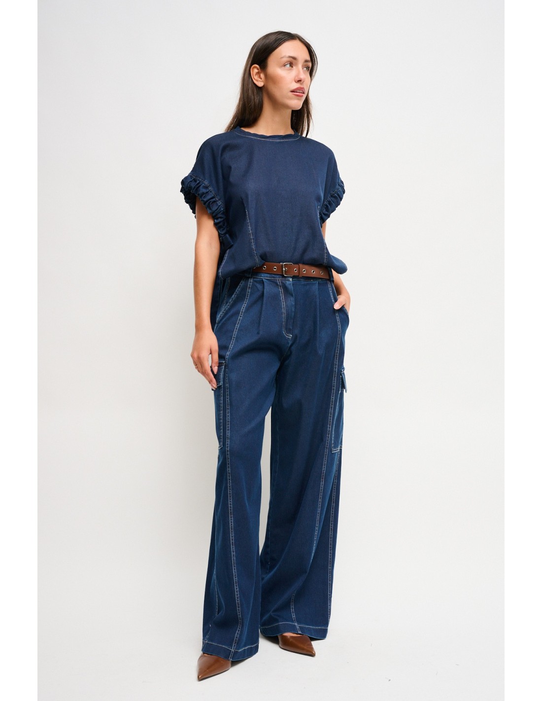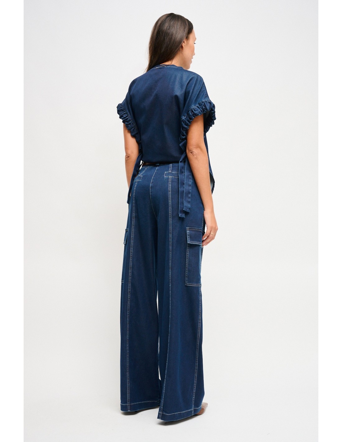 Maryley assina umas calças de perna larga com um corte relaxado que alonga a silhueta. Denim macio e estruturado, costuras à vista que definem as linhas. Cintura removível na cintura para modular o ajuste, bolsos cargo laterais funcionais. Perfeito do escritório ao fim de semana, com sandálias ou slingback.