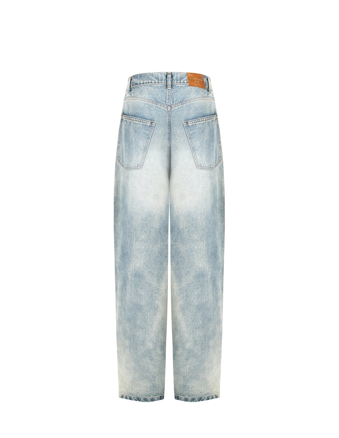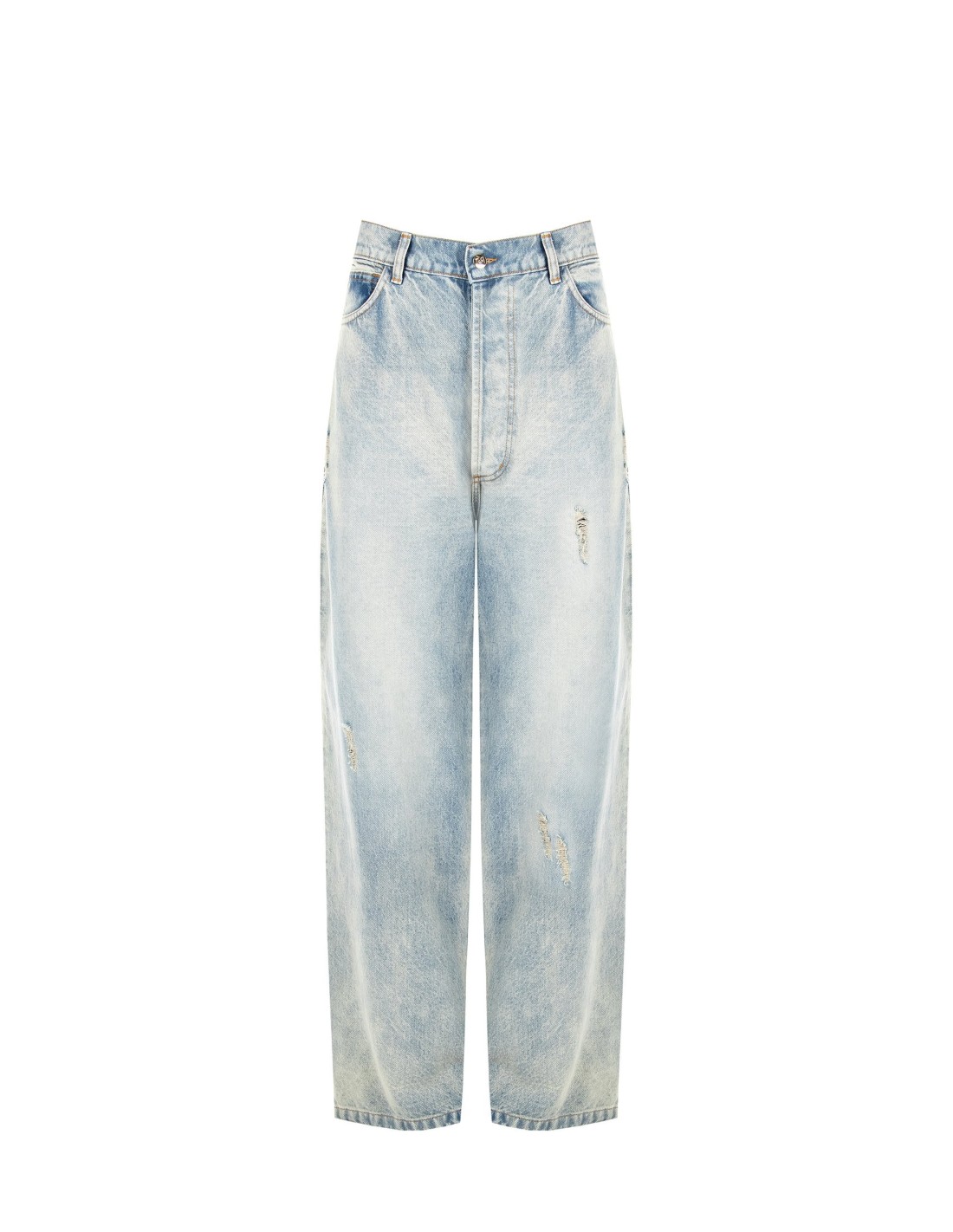 Calças de ganga de cintura alta com um corte largo que emagrece a silhueta. Algodão resistente com uma mão desgastada e ligeira elasticidade para conforto quotidiano. Pormenores: rasgões controlados e bolsos traseiros geométricos; fecho de botões com logótipo. Perfeita para usar no dia a dia com sapatilhas, também ideal para os tempos livres urbanos.