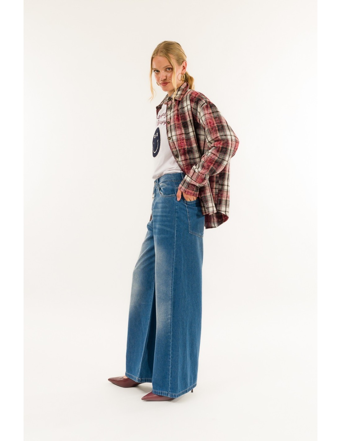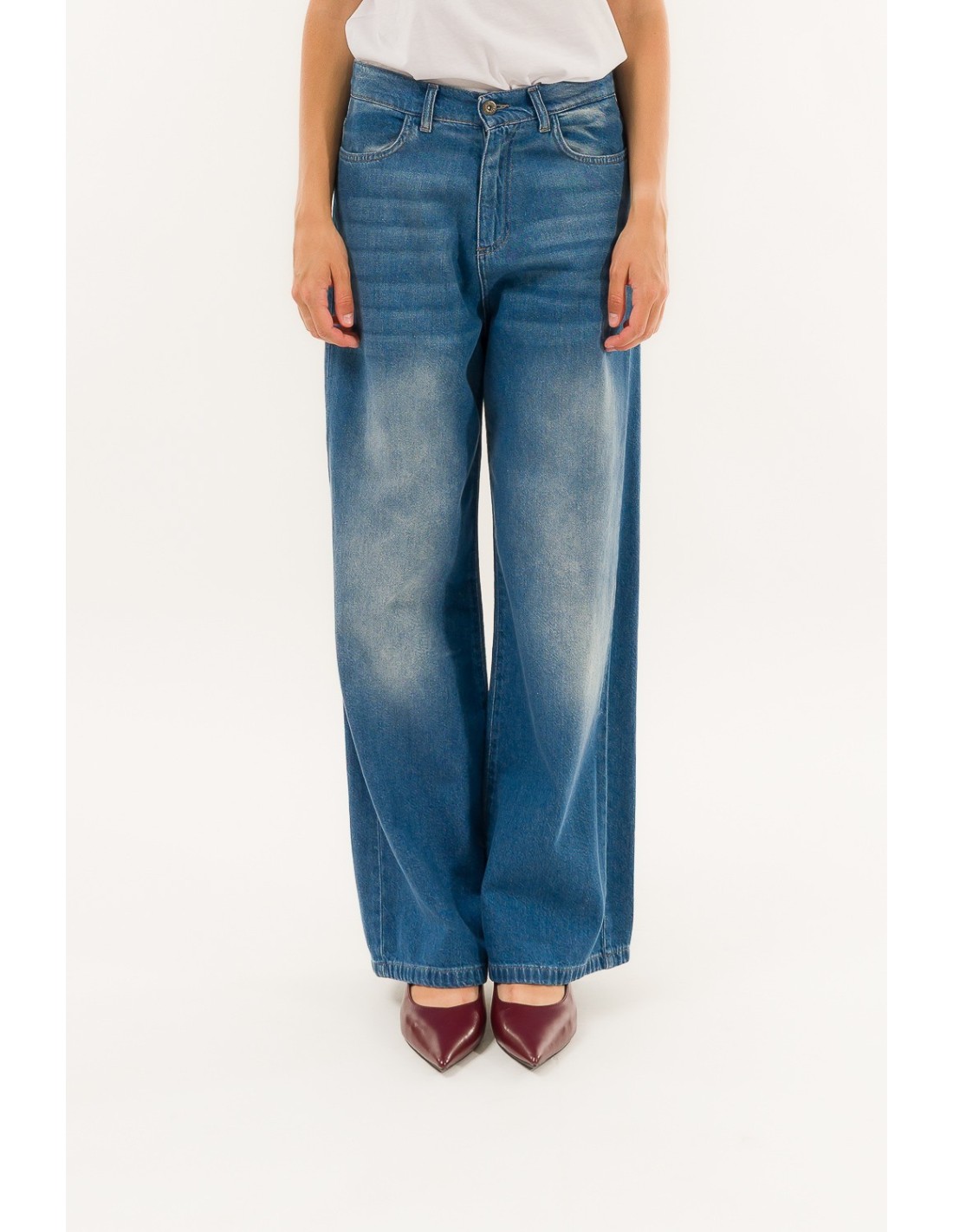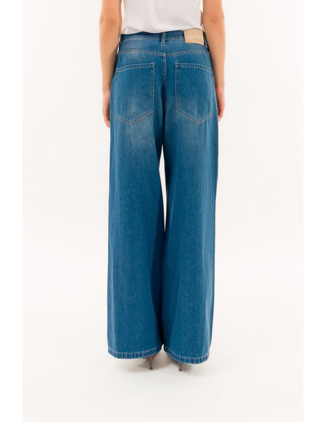 Kontatto propõe uma ganga larga com cintura média: ajuste suave e perna larga que alonga a silhueta. Ganga de algodão com uma mão macia e uma ligeira rigidez para apoio. Detalhes distintivos: bolsos maxi nas costas e fecho de correr e botão. Perfeita do escritório casual ao aperitivo, com sapatilhas ou saltos altos.