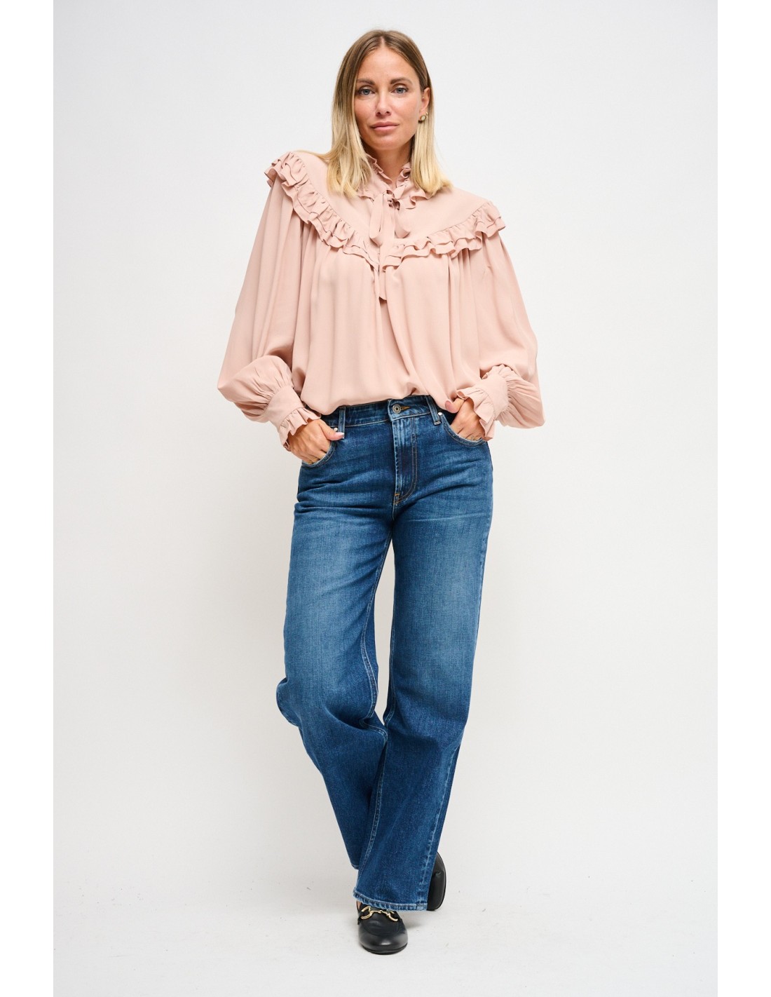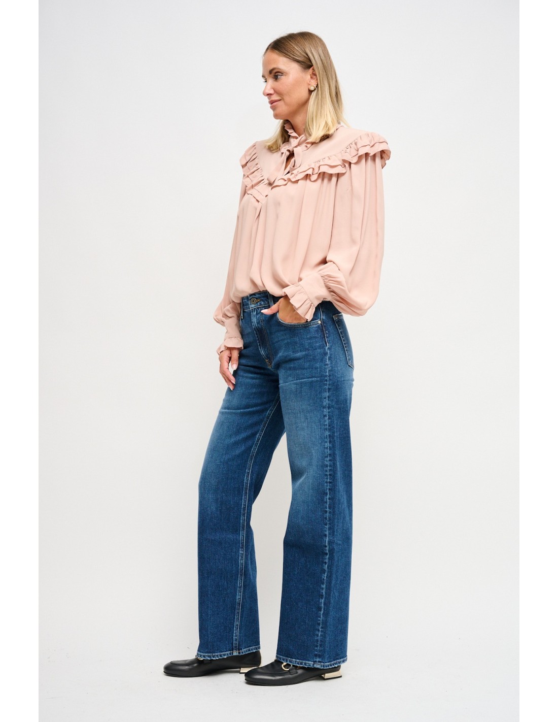 Maryley relança o denim com uma perna suave e reta que alonga sem apertar. Tecido de algodão com leve aspeto usado e elasticidade confortável. Cintura média, fecho com botão com logótipo e bolsos traseiros quadrados que realçam. Perfeitos do escritório ao fim de semana, com blazer ou camisa fluida.