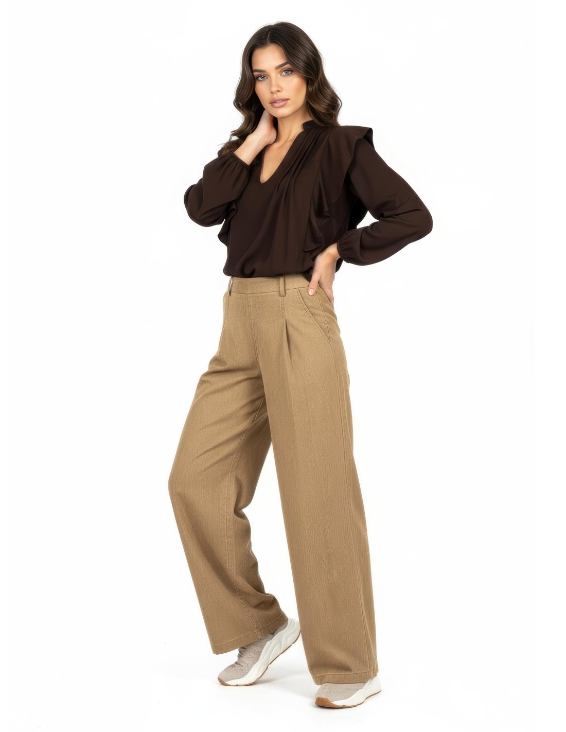 Rinascimento assina uma calça larga de perna direita com uma cintura confortável. Ganga fluida com uma mão suave, pregas frontais que lisonjeiam e uma faixa elástica na parte de trás para um ajuste adaptável. Bolsos funcionais e presilhas para o cinto. Ideal do escritório para o fim de semana para um visual polido e confortável.