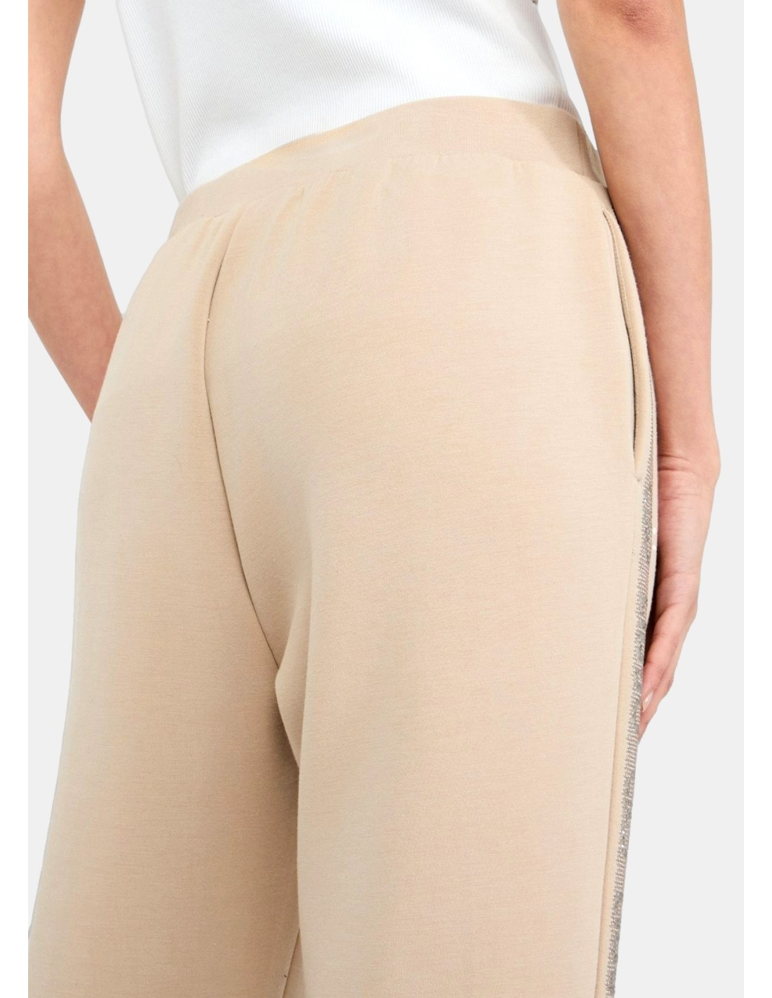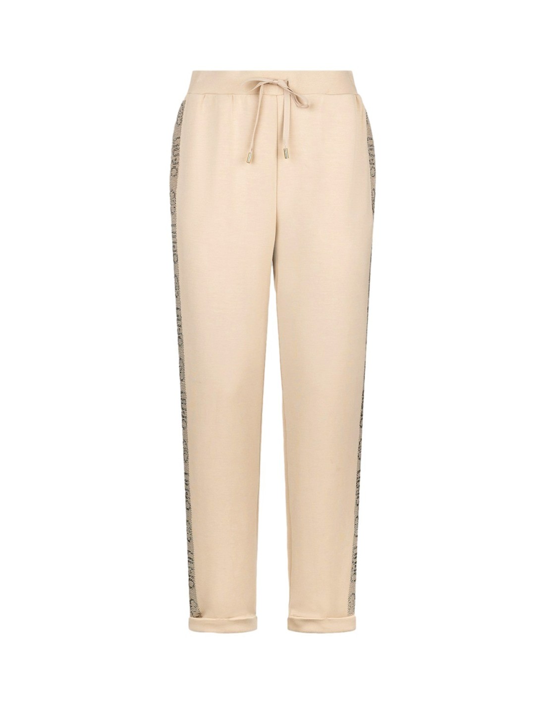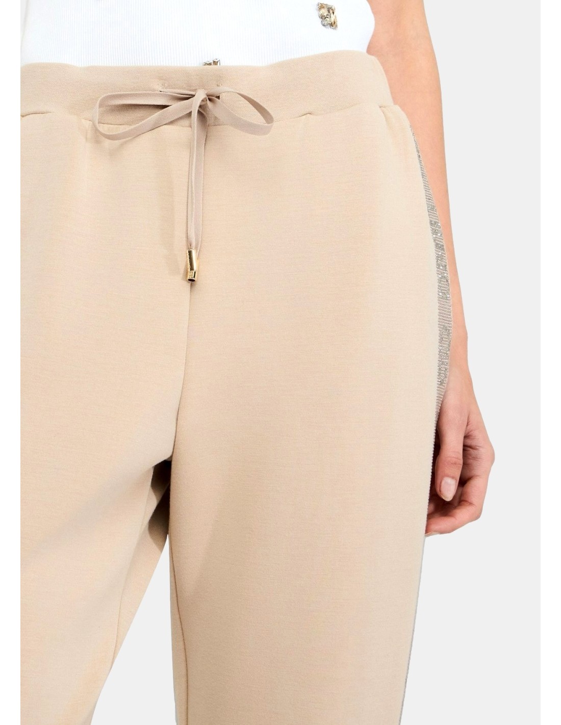 Calças de jogging em espartilho elástico, cintura elástica com cordão, bolsos nas ancas, faixas laterais com logótipo e tachas, bainha virada para cima.