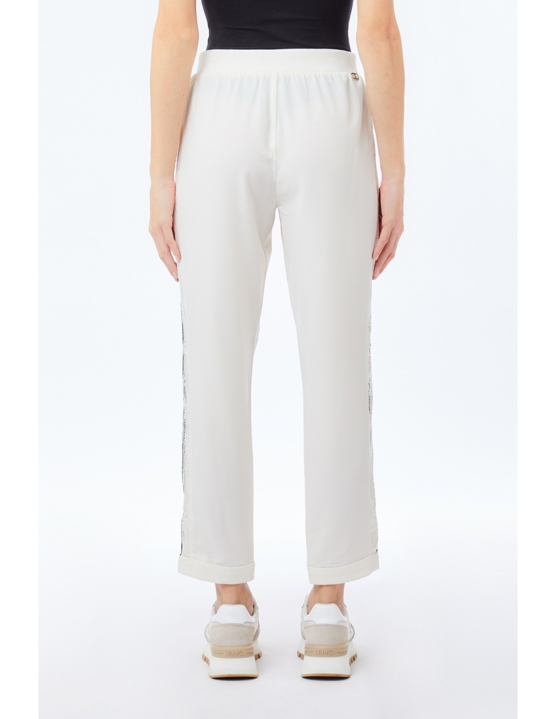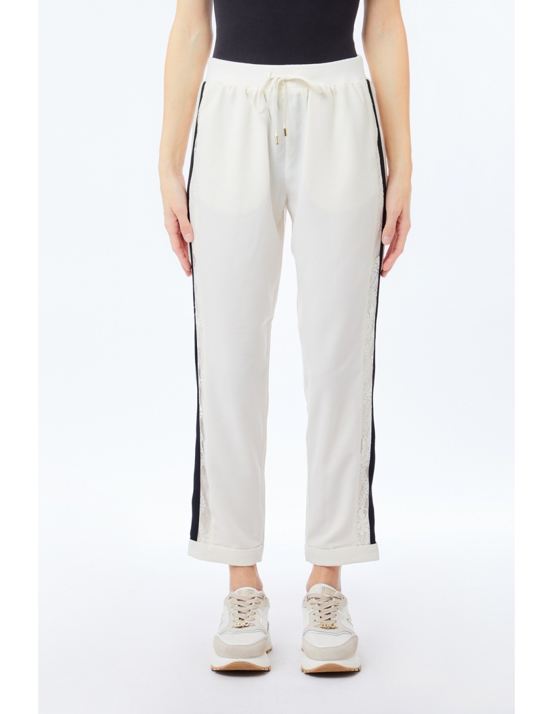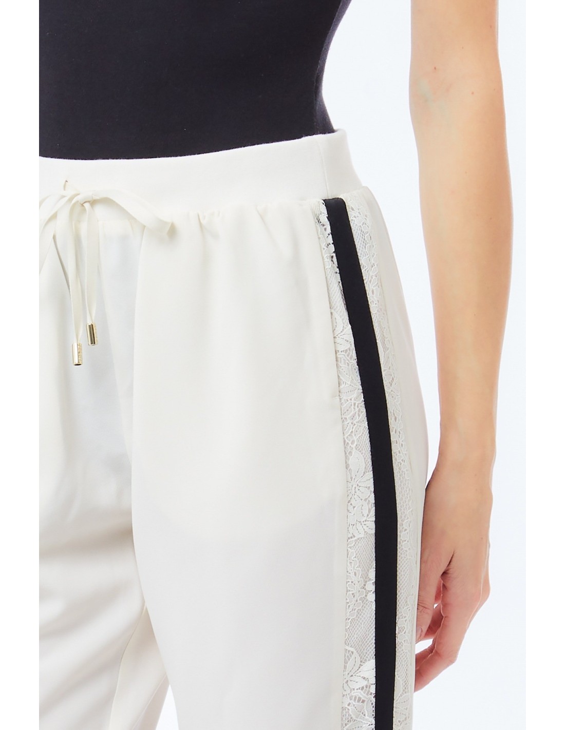 Calças de jogging em crepe elástico, cintura elástica com cordão, bolsos nas ancas, faixas laterais com renda, bainhas viradas para cima, ecológicas.