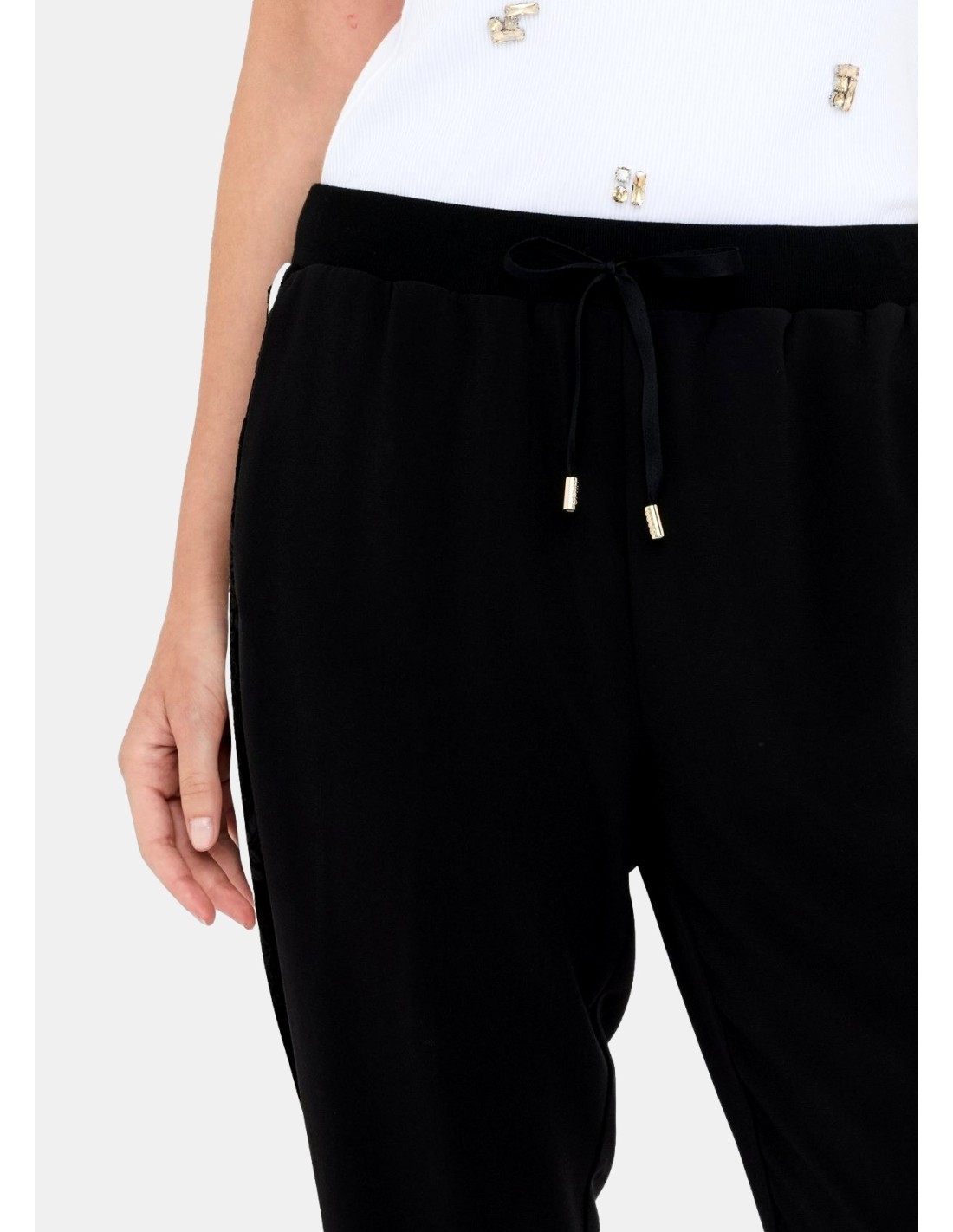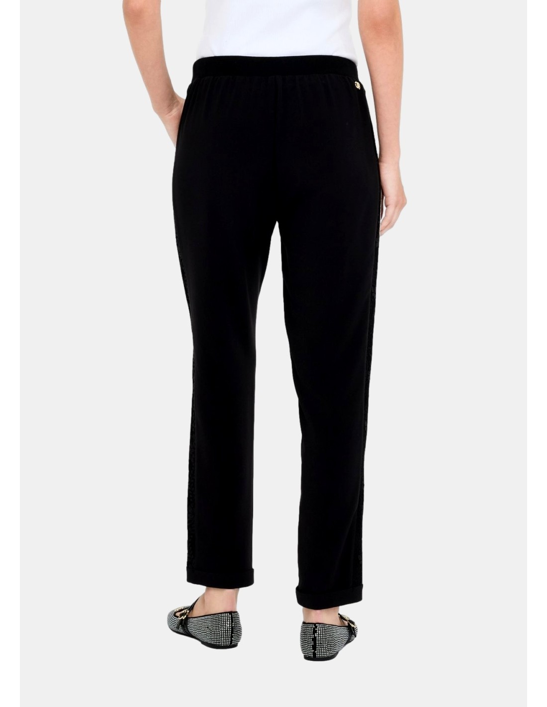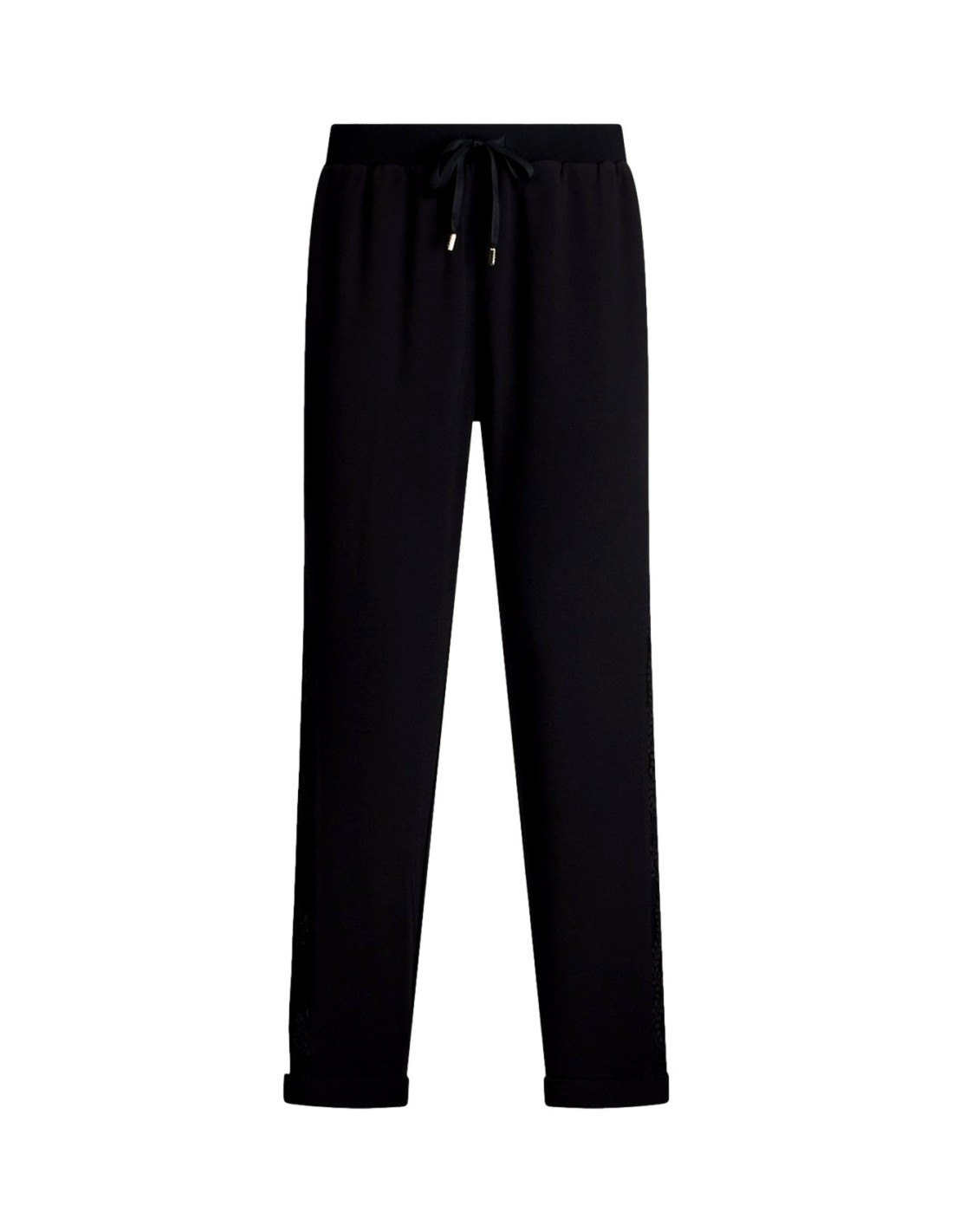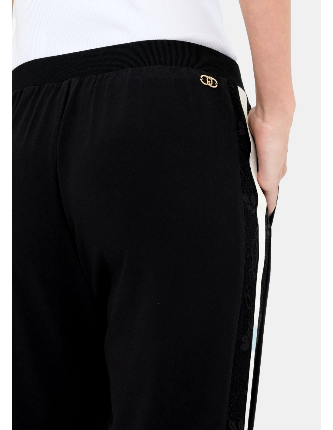 Calças de jogging em crepe elástico, cintura elástica com cordão, bolsos nas ancas, faixas laterais com renda, bainhas viradas para cima, ecológicas.
