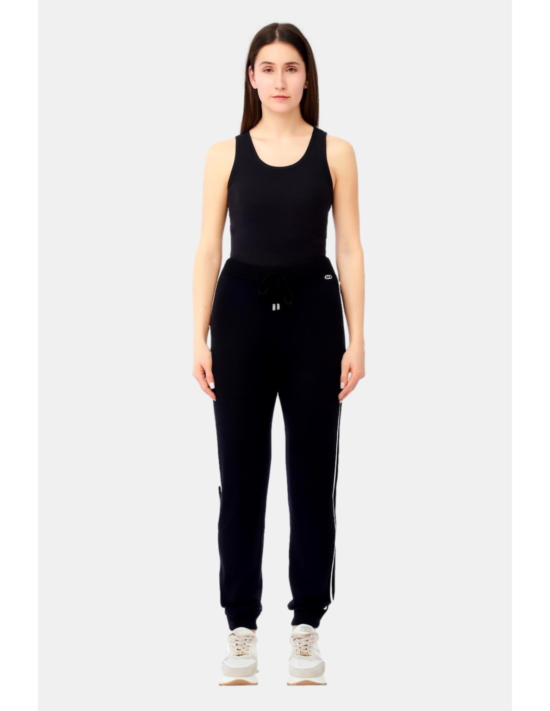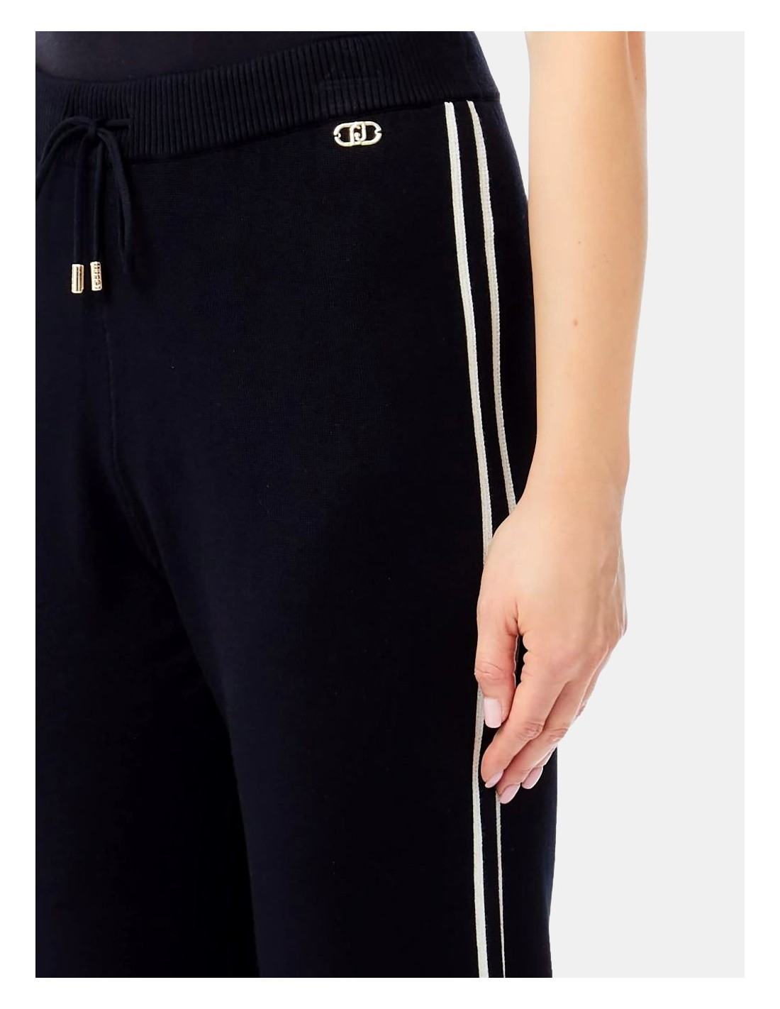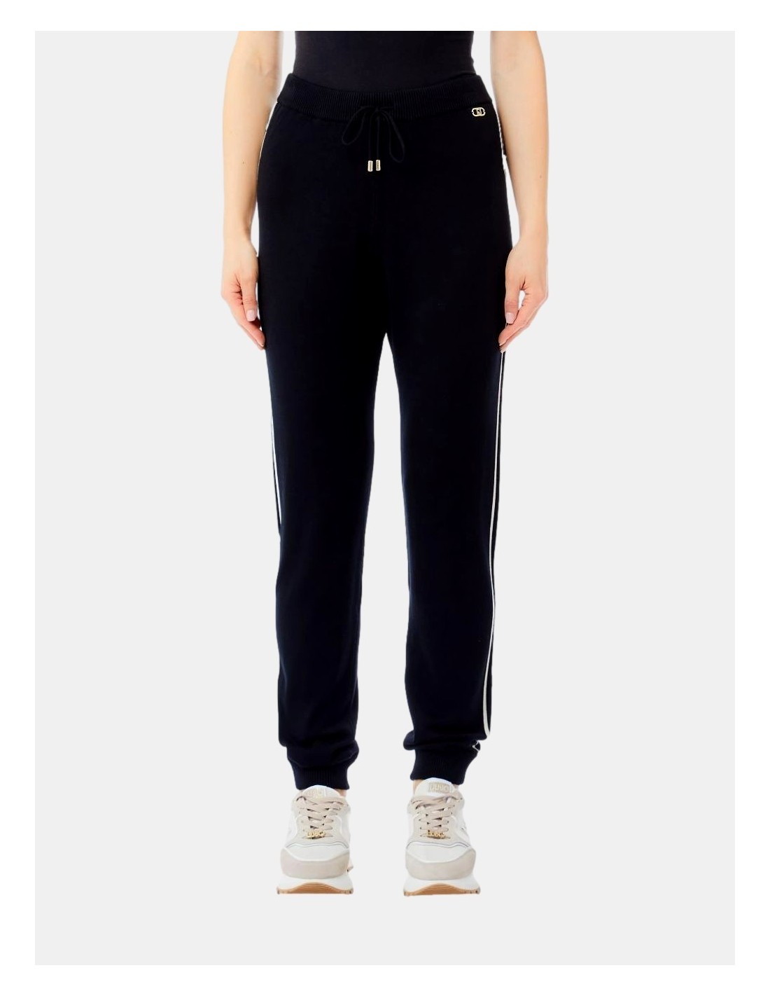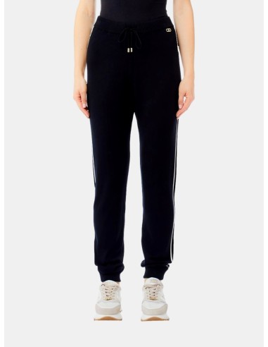 Calças de jersey, cintura com cordão, detalhes laterais contrastantes, logotipo de metal.