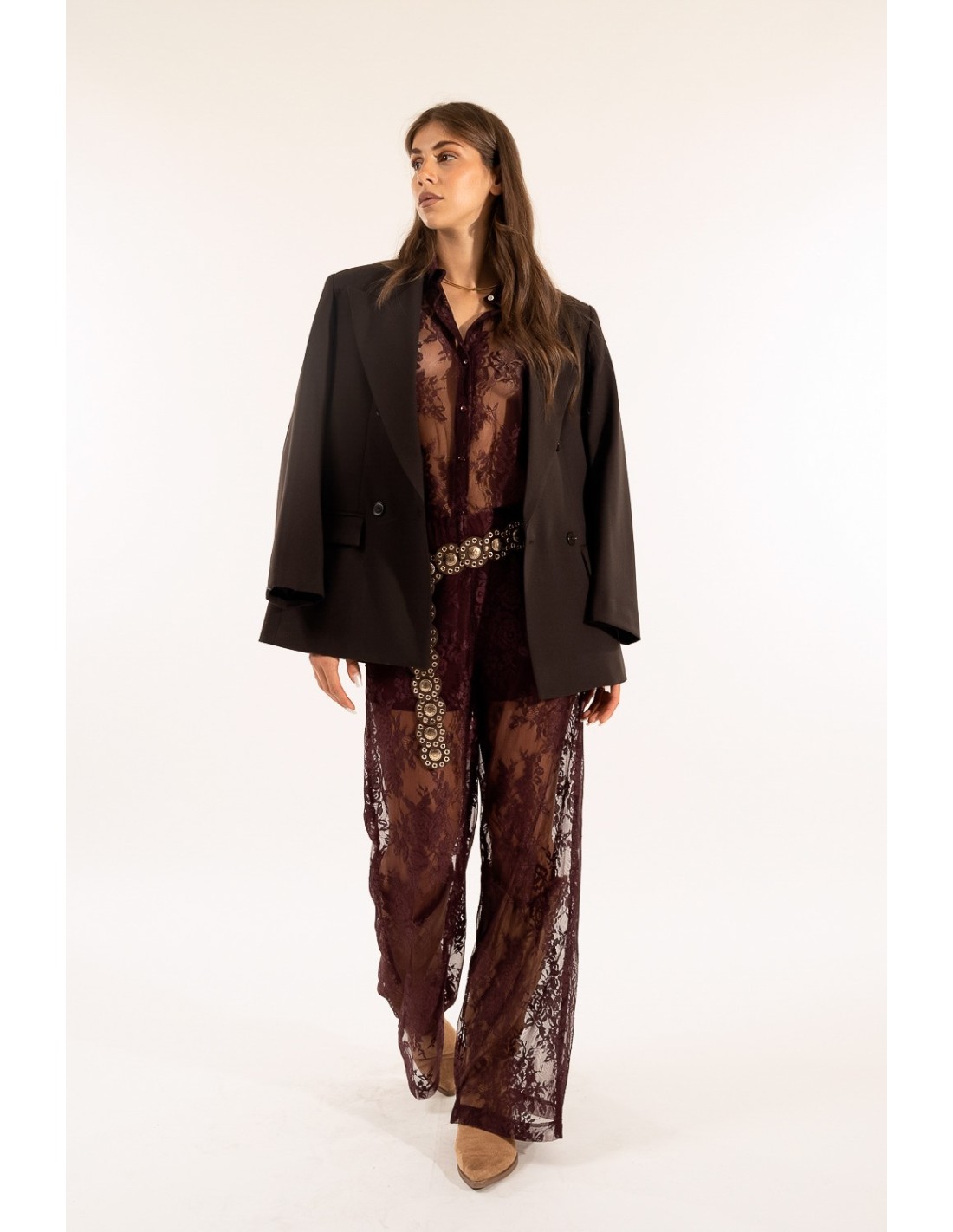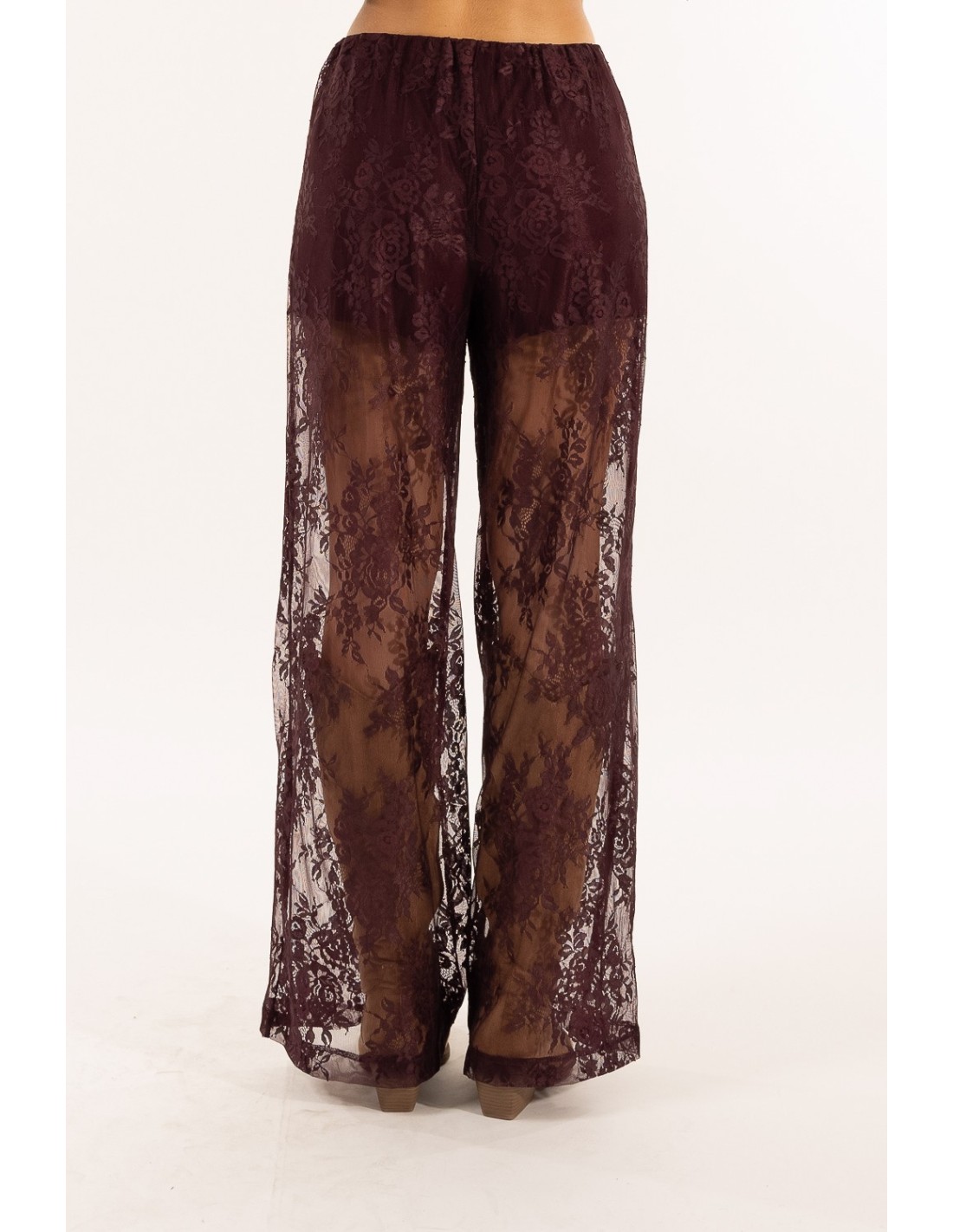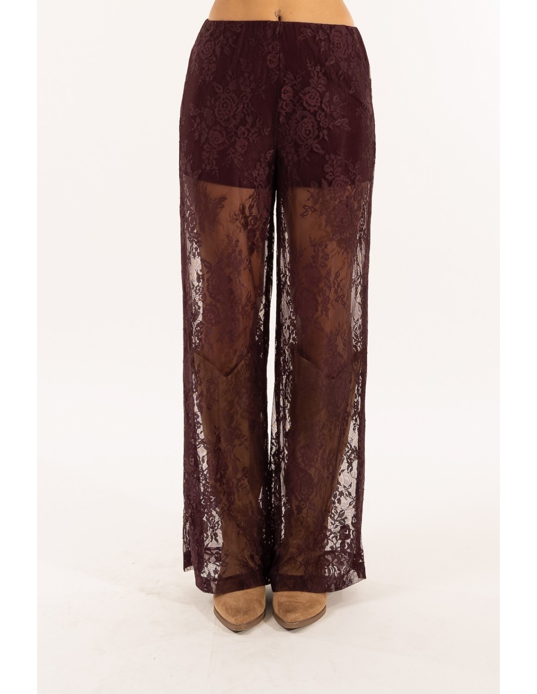 Kontatto assina umas calças de corte amplo e fluido, que alongam a silhueta. Confeccionadas em renda floral leve com base semi-transparente e forro tipo short para um jogo de vê‑não‑vê. Cintura elástica para conforto e queda suave. Perfeitas para festas e noites, para combinar com blazer ou top essencial.
