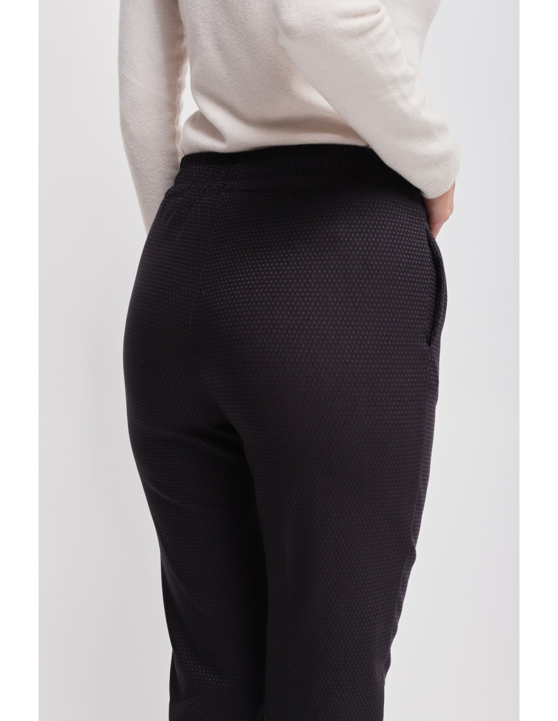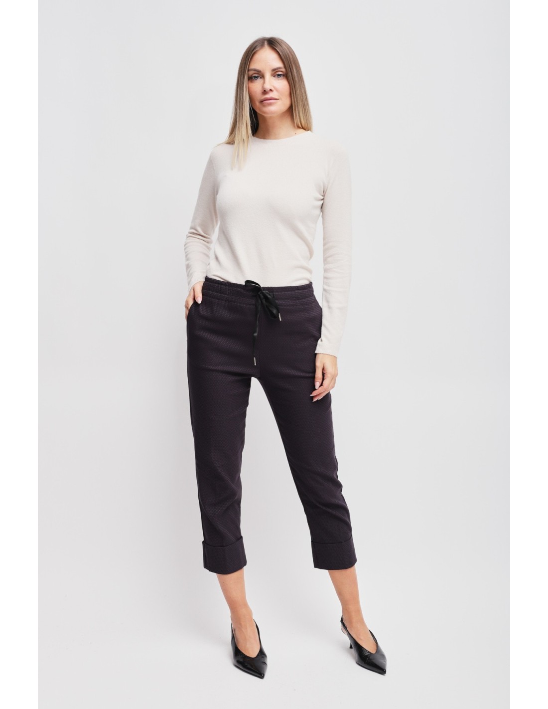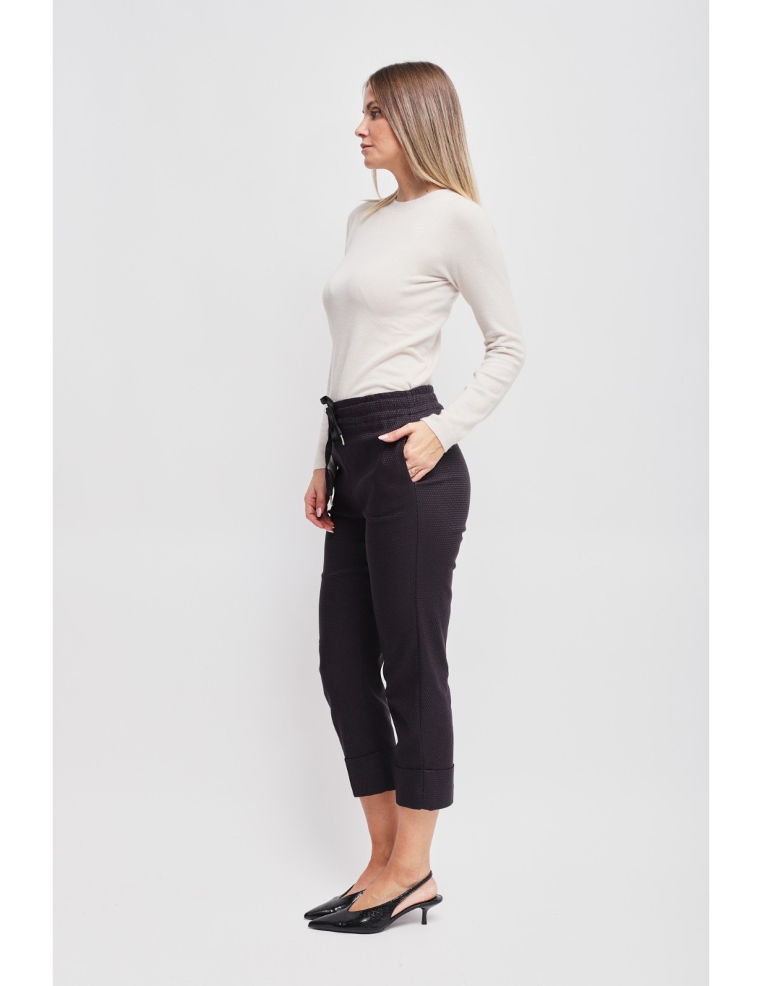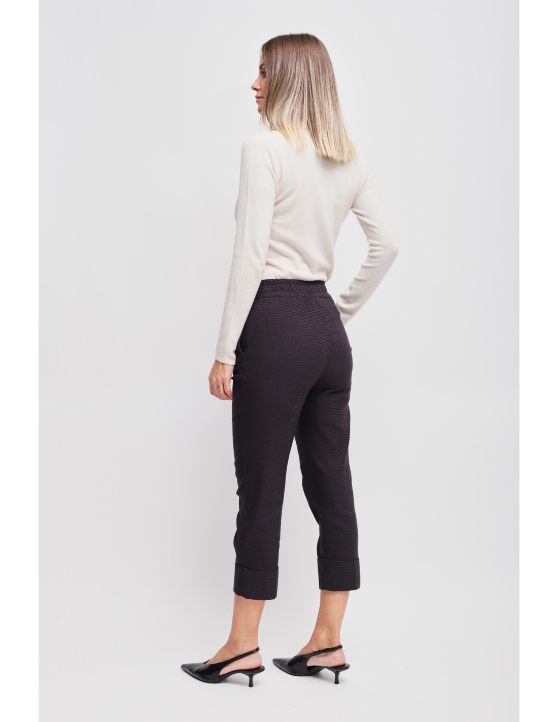 Maryley assina um modelo descontraído com um corte suave que alonga a perna. Tecido jacquard ligeiramente estruturado para conforto e sustentação, cintura elástica com cordão de cetim e bainha com dobra. Bolsos laterais. Perfeitas do escritório ao aperitivo: versáteis, fáceis de combinar, desenham uma silhueta limpa e contemporânea.