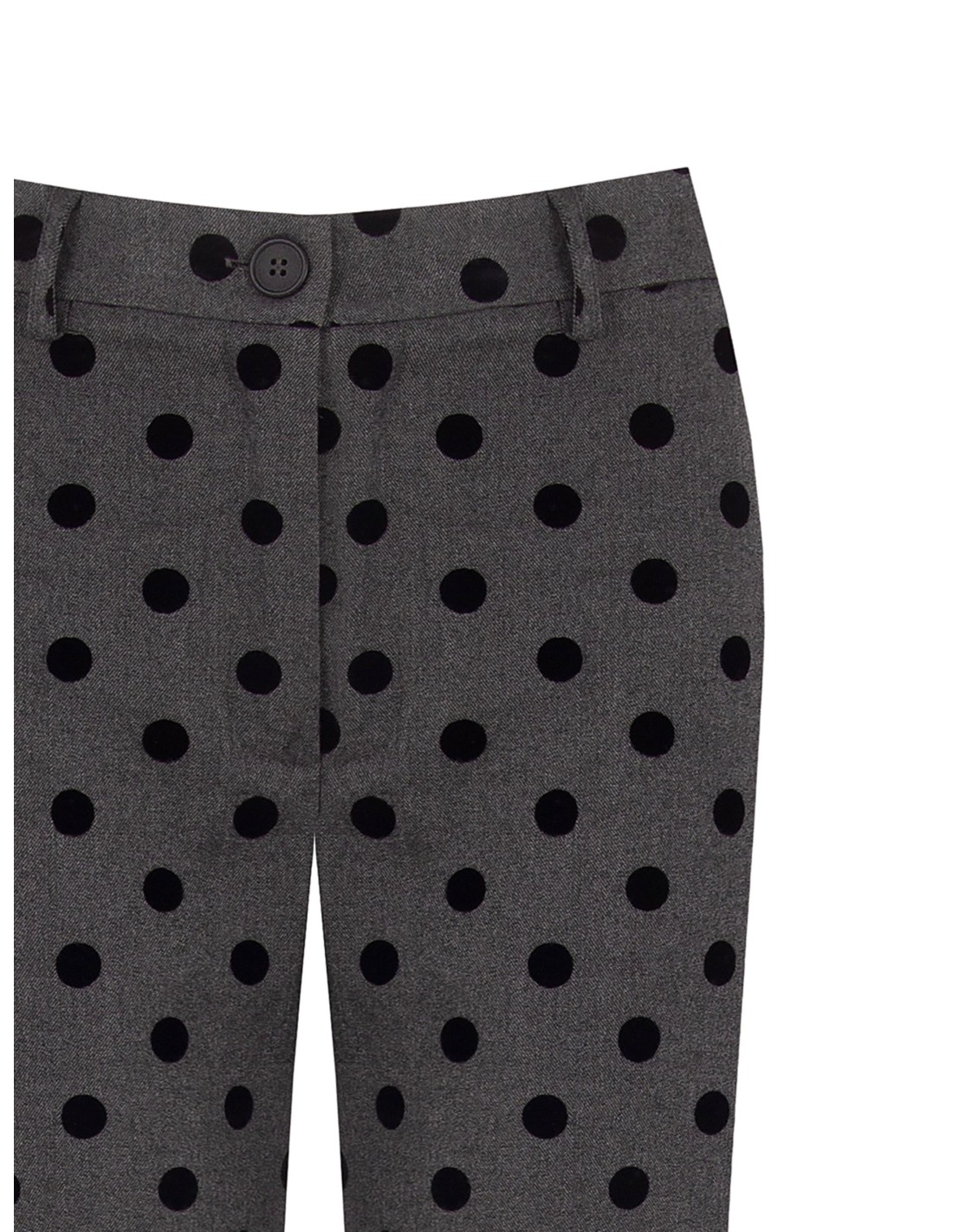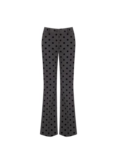 Rinascimento apresenta umas calças de corte evasé que alongam a perna. Tecido confortável com padrão de bolinhas flocado em relevo, cós com elástico posterior para um ajuste perfeito. Fecho frontal com botão e passantes. Versátil do escritório ao aperitivo, confere uma silhueta feminina sem renunciar ao conforto.