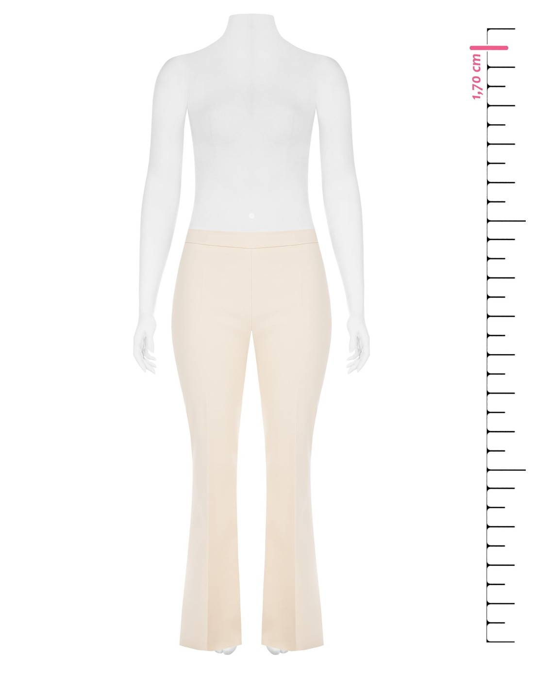 Calças de perna evasada e corte justo que envolvem ancas e coxas, pensadas para alongar a silhueta com naturalidade. O tecido técnico, liso e confortável, acompanha os movimentos; o fecho lateral invisível e a cintura clean tornam-nas ideais do escritório aos encontros noturnos.