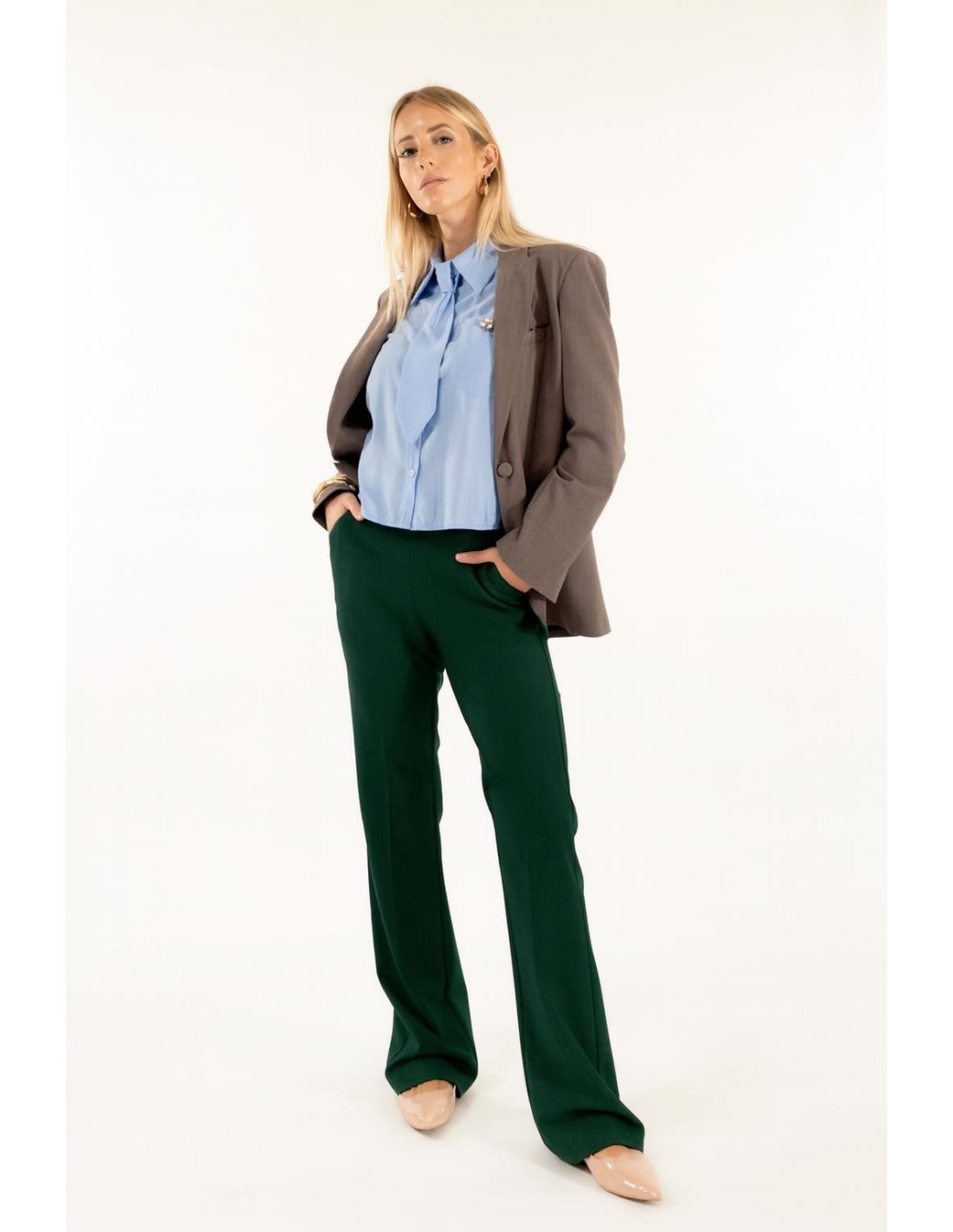Kontatto assina uma calça de perna direita com um ajuste suave e cintura regular, que emagrece a silhueta sem apertar. Tecido fluido com uma mão ligeiramente elástica para um conforto quotidiano. Pormenores: elástico nas costas e prega à frente. Perfeitas para o escritório e para looks quotidianos versáteis.