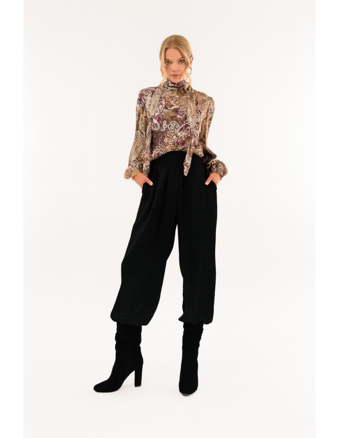 Linhas suaves e tecido fluido acariciam a silhueta com uma elegância sofisticada. Ideais para criar looks requintados e sofisticados, estas calças são um verdadeiro aliado de estilo para quem gosta de se destacar com classe e feminilidade.