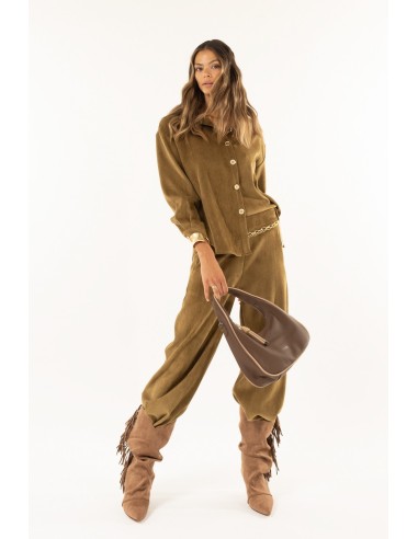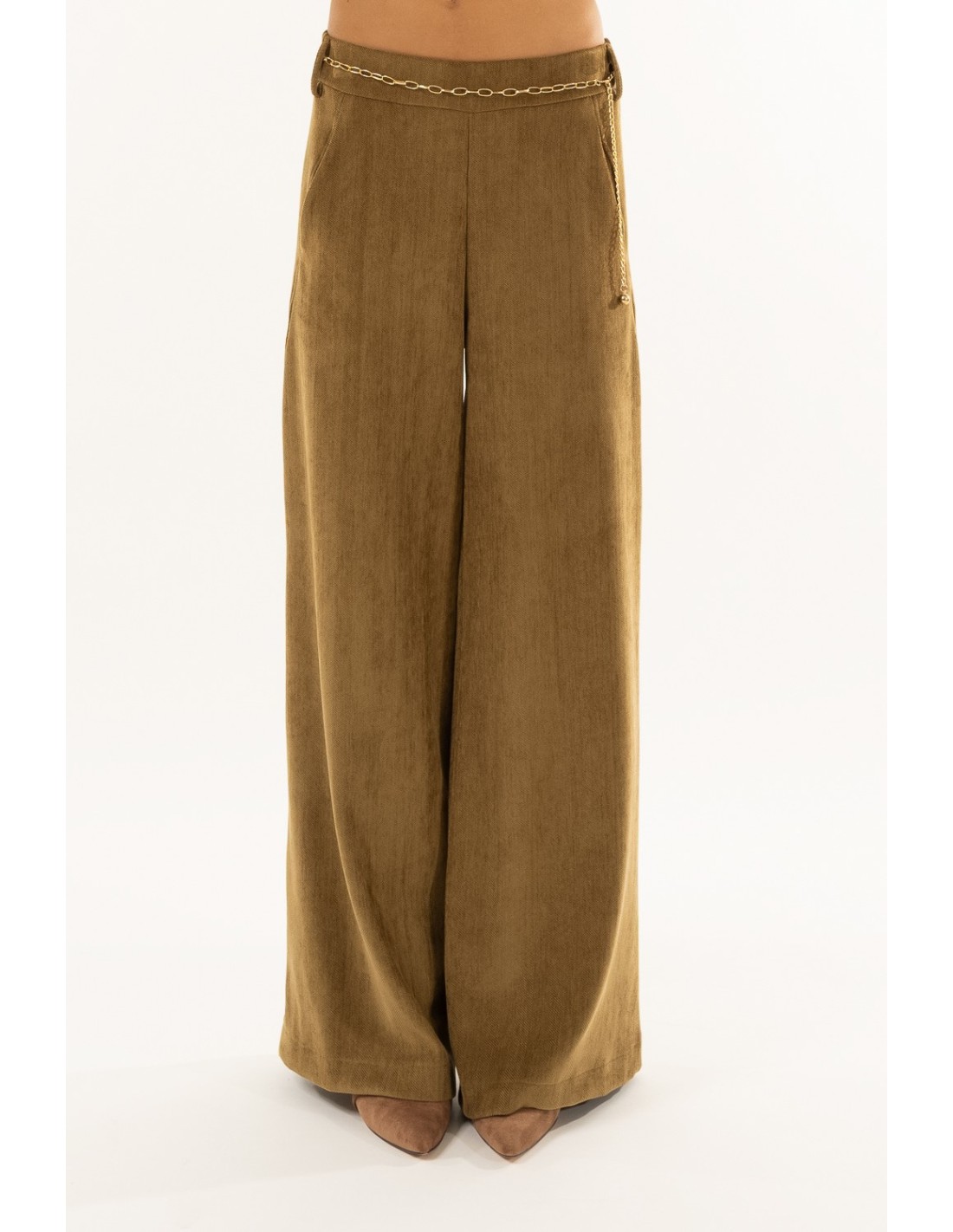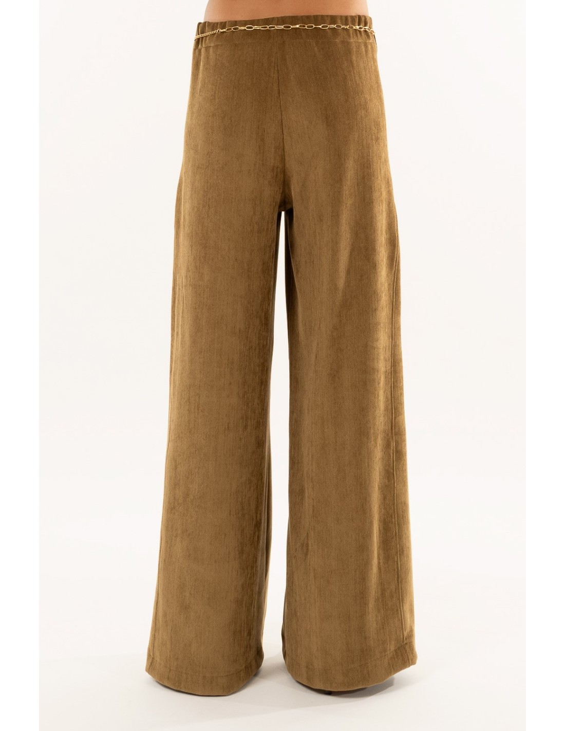Kontatto reinterpreta as calças fluidas com um corte solto e uma cintura confortável que adelgaça a silhueta. Veludo macio com efeito de carícia, caimento total e ligeira elasticidade. Detalhes distintivos: cinto de corrente amovível, prega central que alonga a perna. Perfeito do escritório às bebidas, também ideal para o dia a dia.