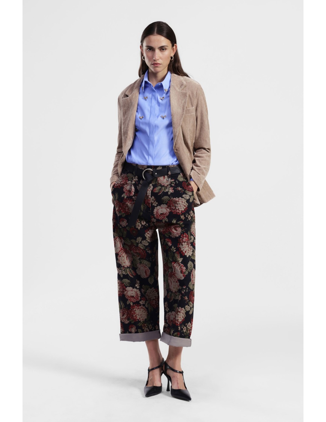 Linhas suaves e largas para estas calças palazzo com padrão floral e pregas na parte inferior. O pormenor do cinto com fivela confere um toque de personalidade e permite ajustar o corte. Perfeitas para quem gosta de expressar a sua personalidade todos os dias com estilo e originalidade.
