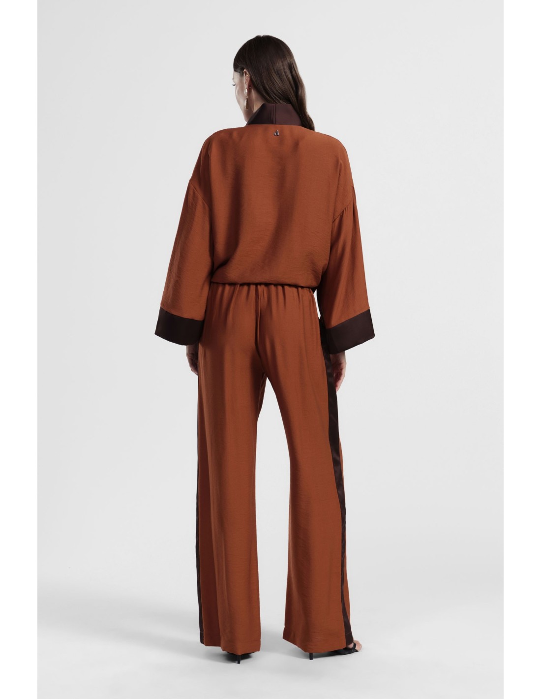 Estas calças palazzo de cintura subida com fitas laterais dão um toque original ao look do dia a dia. O corte largo garante conforto e liberdade de movimentos, enquanto os pormenores contrastantes nas costuras laterais realçam a silhueta. Perfeitas para qualquer ocasião, combine-as facilmente com camisas suaves ou tops leves.