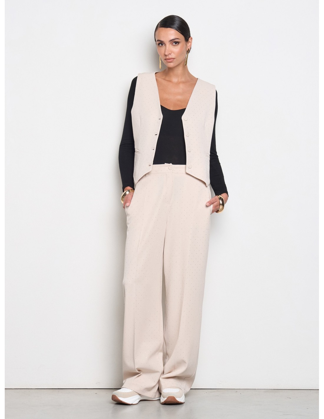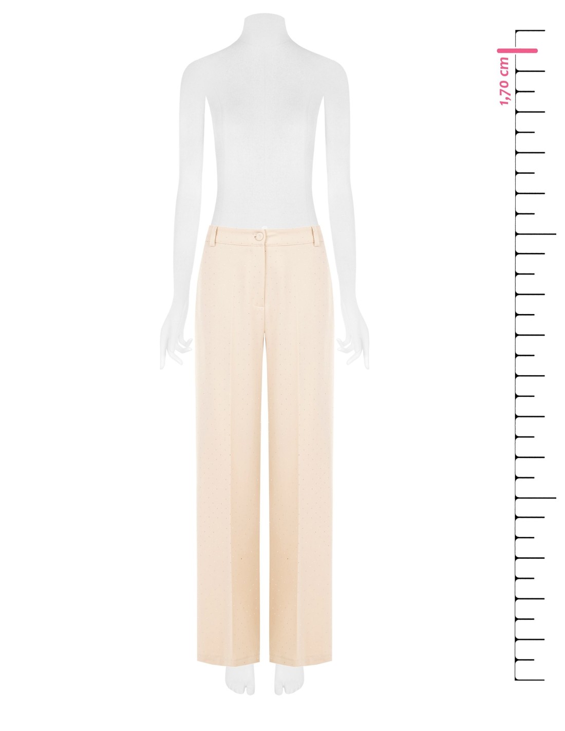 Calças largas com perna reta, corte fluido que valoriza a silhueta. Tecido macio e ligeiramente elástico, salpicado de mini brilhantes para um brilho discreto. Cintura com elástico na parte de trás e botão à frente para conforto e fixação. Perfeitas para escritório e aperitivos, combinam com blazer ou top essencial.