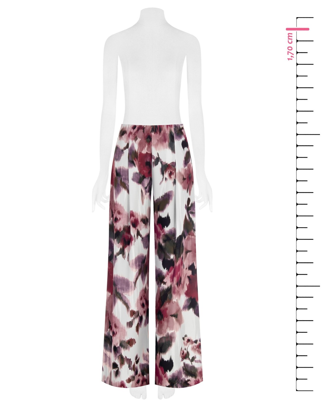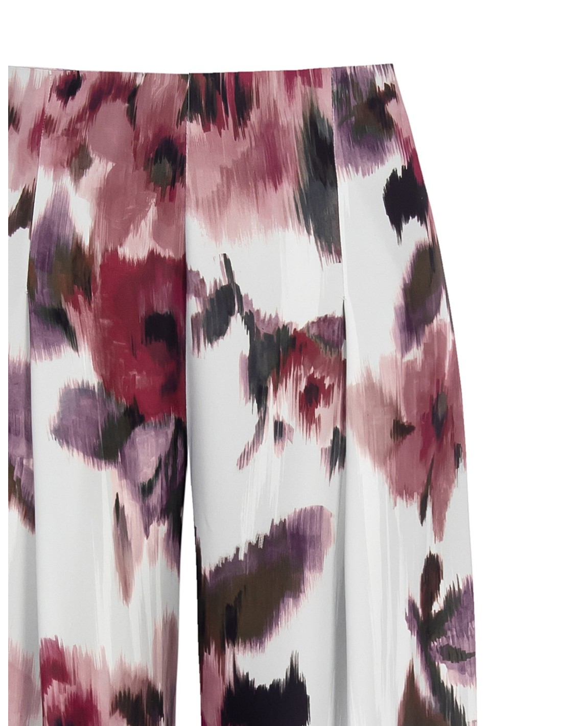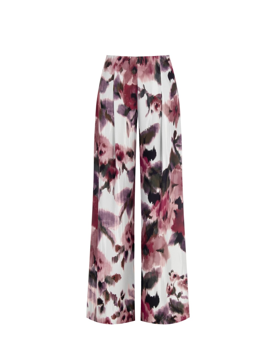 Ampla silhueta fluida que afina, em cetim leve de toque sedoso. A cintura limpa com fecho traseiro desenha a cintura, enquanto as pregas suaves acompanham o movimento. Estampa floral pictórica para um toque romântico. Perfeitos do escritório ao aperitivo, com saltos ou sandálias rasas.