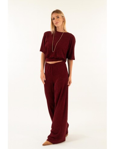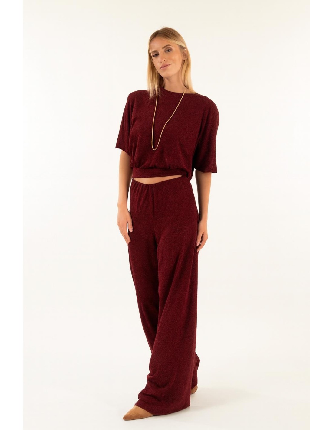 Kontatto assina umas calças largas com uma perna fluida e um corte descontraído que adelgaça a silhueta. Malha macia com fio de lurex para uma textura brilhante e confortável. Cintura elástica e linha palazzo sem costuras para um movimento elegante. Perfeito para festas e jantares, mas também fácil de reinterpretar do dia para a noite.