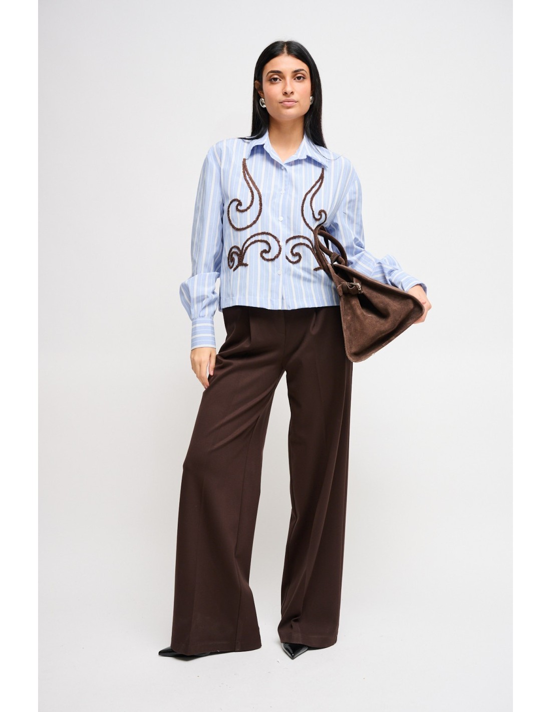 Maryley apresenta umas calças largas de perna reta, corte fluido que alonga a silhueta. Confeccionadas em Ponto Milano elástico, garantem conforto e firmeza. Cintura regular com fecho escondido, vinco passado e bolsos laterais para um toque de alfaiataria. Perfeitas do escritório ao aperitivo.