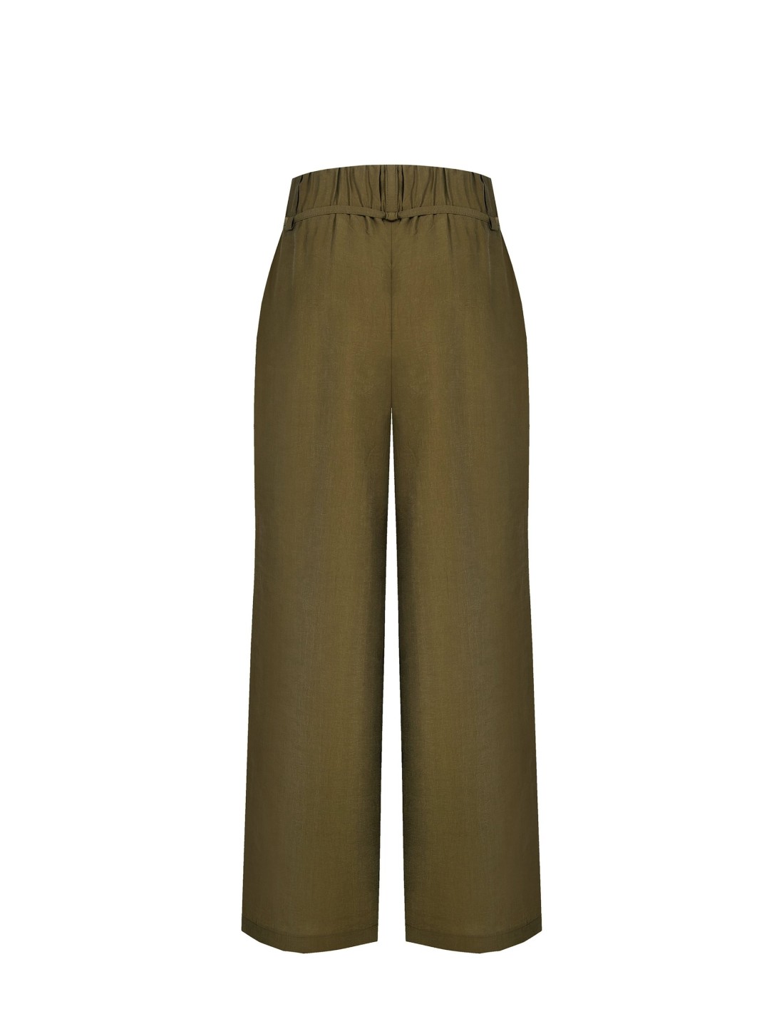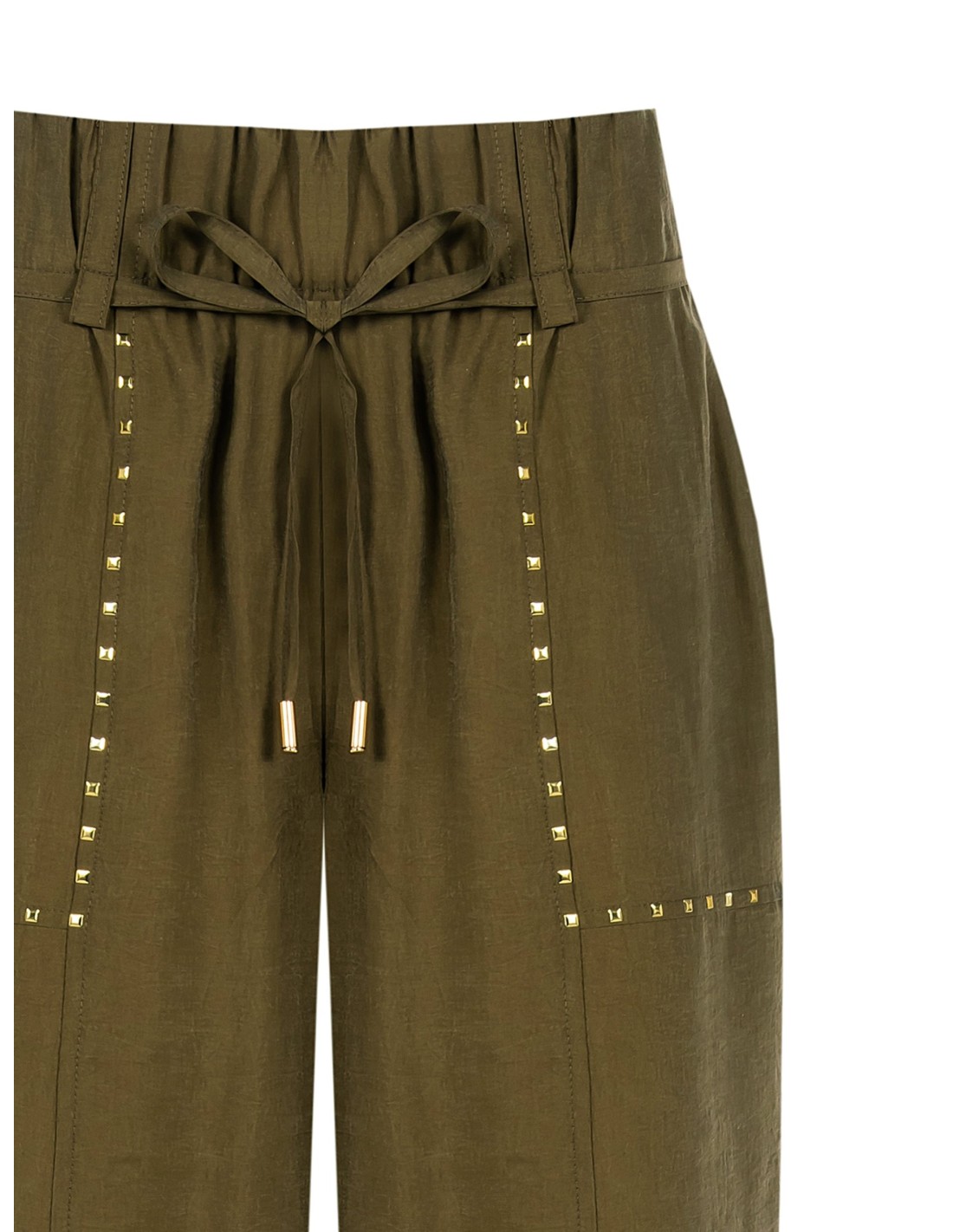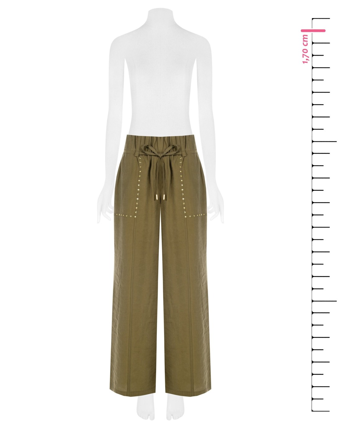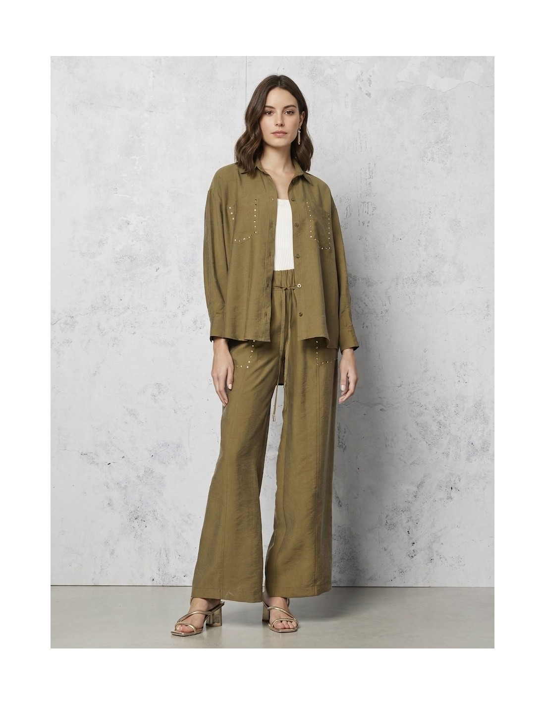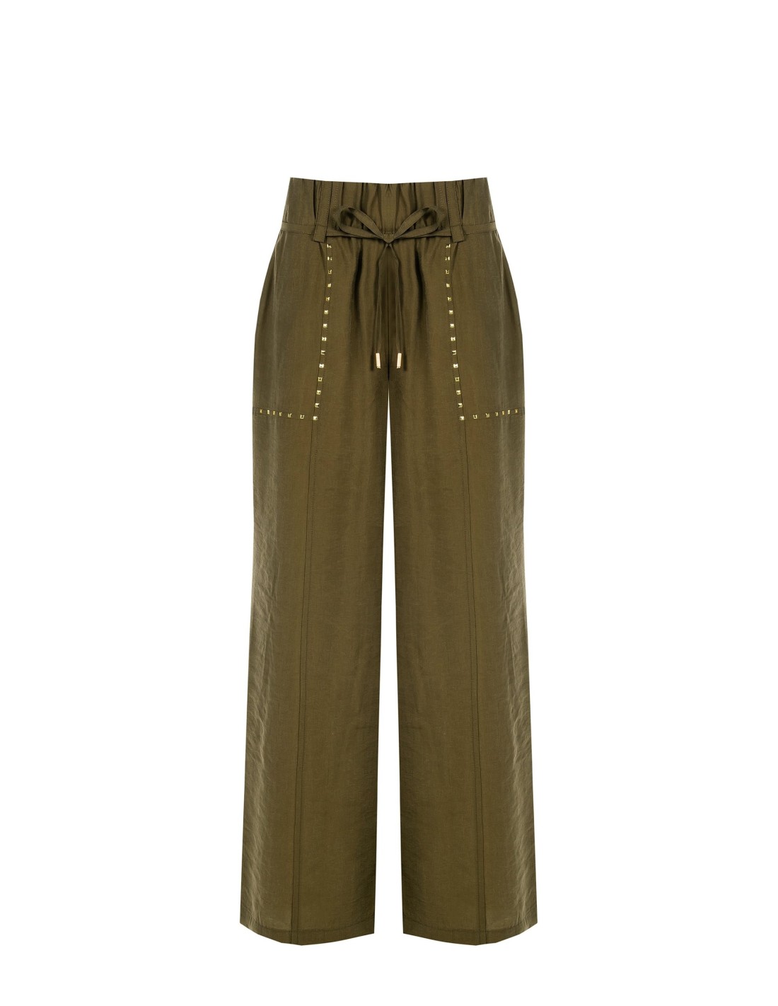 Corte amplo e fluido, com um caimento suave que realça a silhueta e acompanha os movimentos com conforto. O tecido ligeiramente amarrotado confere carácter, enquanto cordão na cintura e tachas aplicadas acrescentam um toque requintado. Perfeito do escritório ao tempo livre.