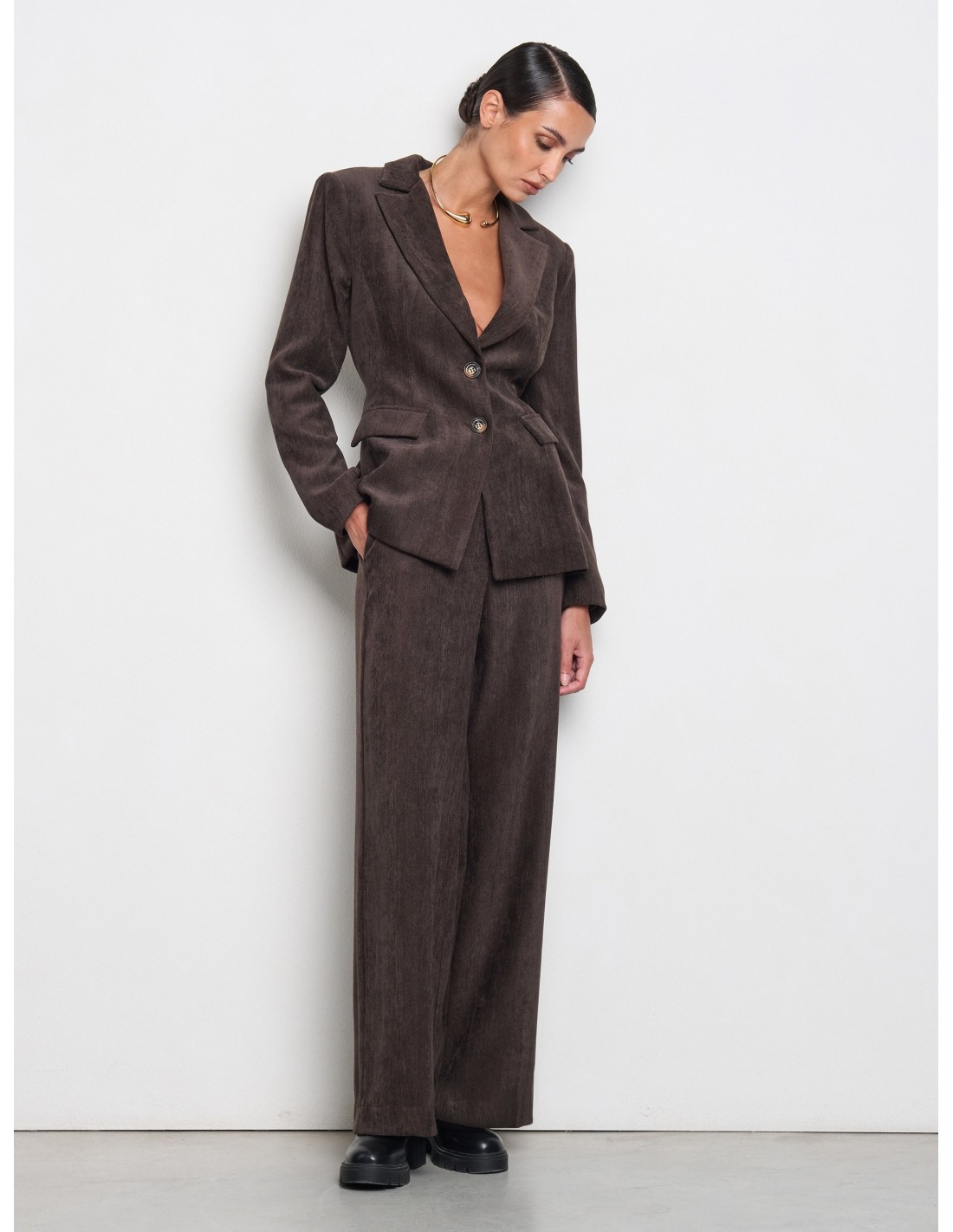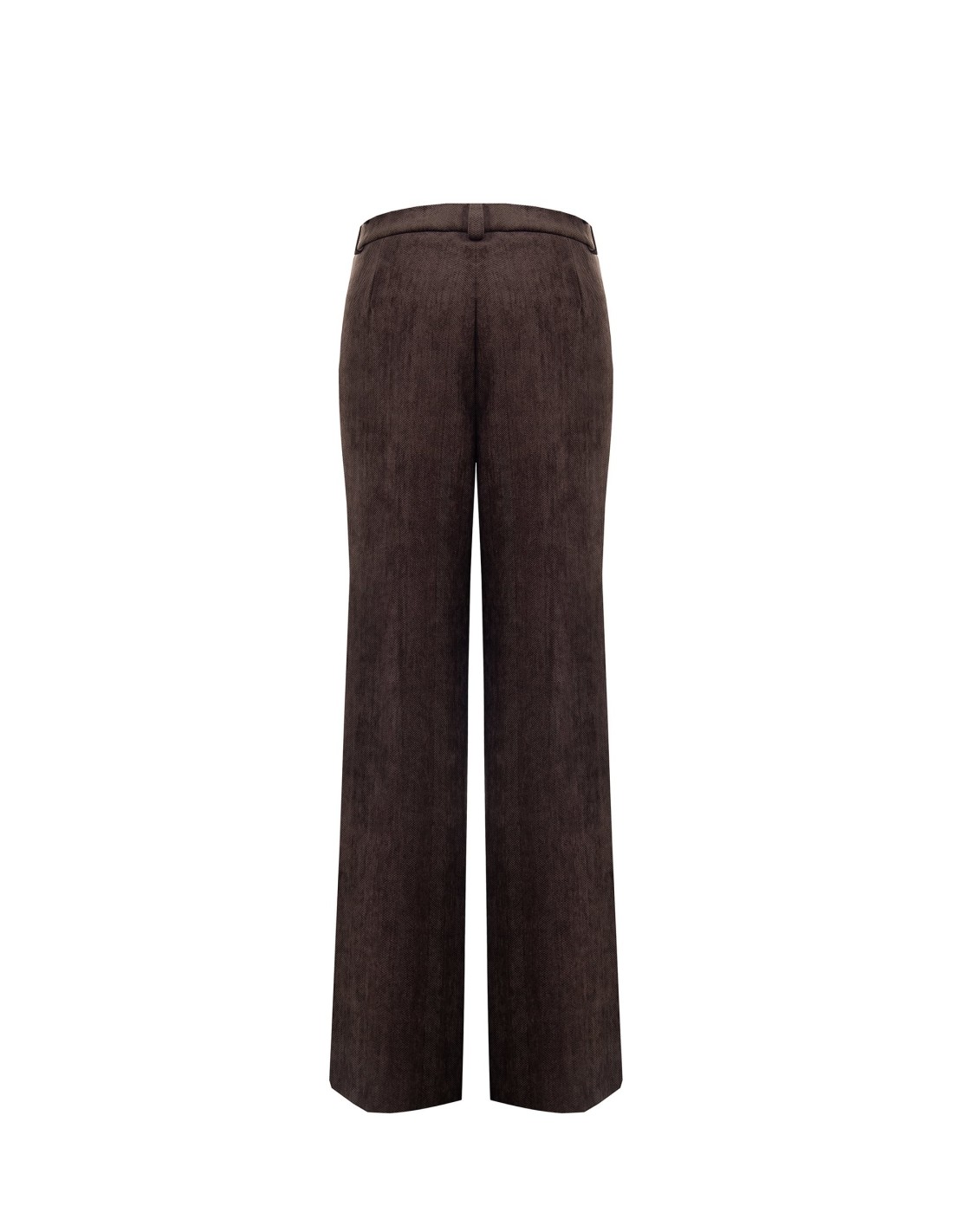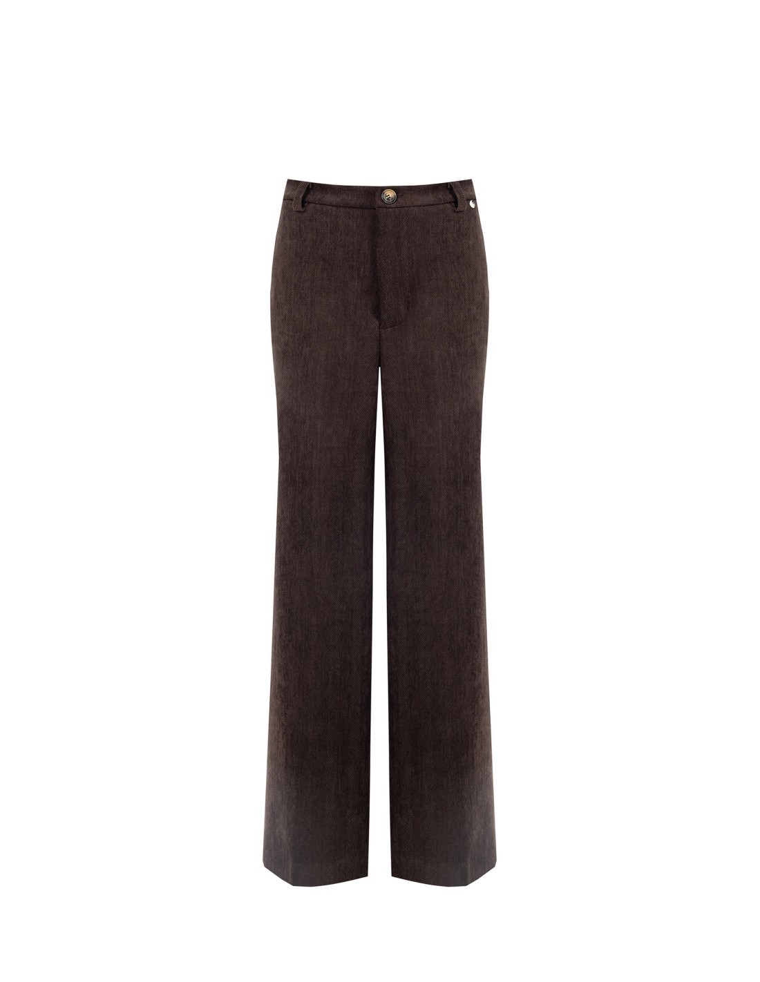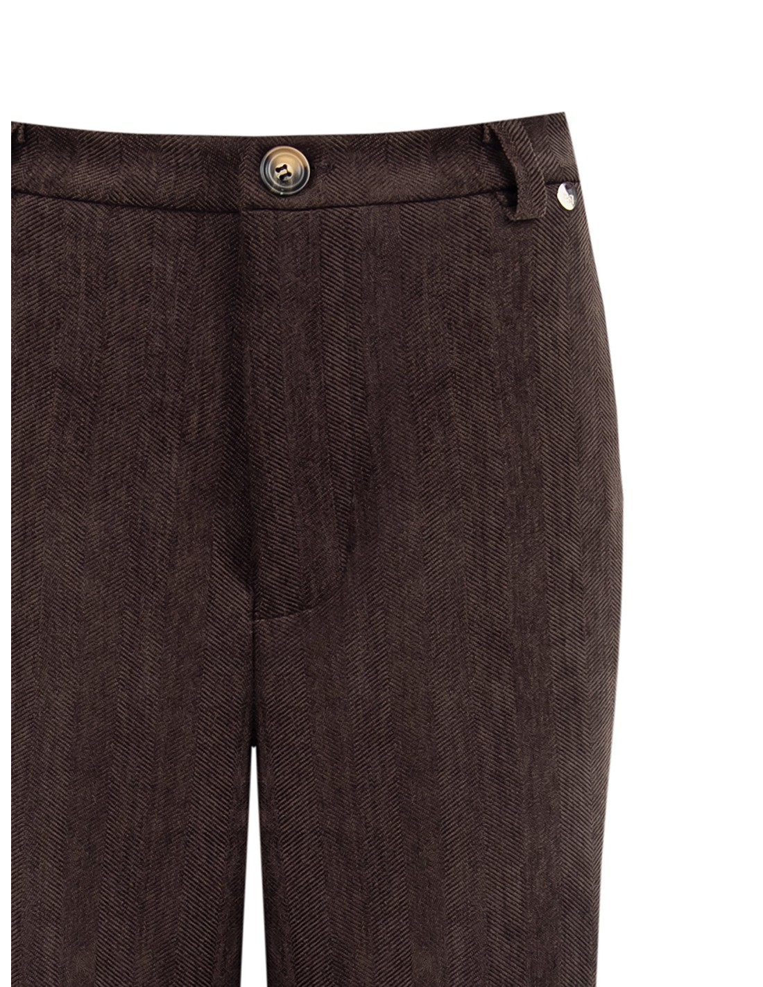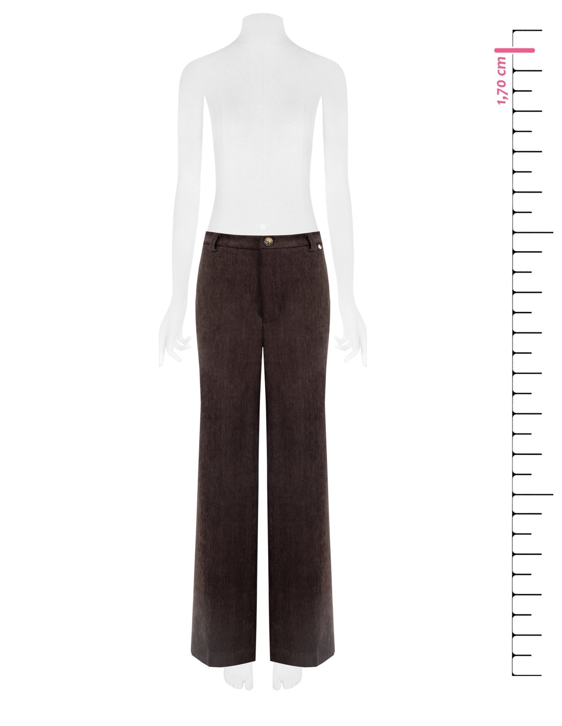 Calças de perna larga, corte fluido que alonga a silhueta. Confeccionadas em veludo macio com padrão espinha de peixe, agradável ao toque e confortável durante todo o dia. Cintura regular com passantes, fecho com botão com adorno tipo joia e bolsos laterais. Versáteis do escritório ao pós‑trabalho, perfeitas também para looks do dia a dia refinados.