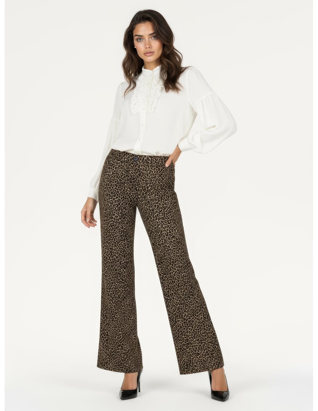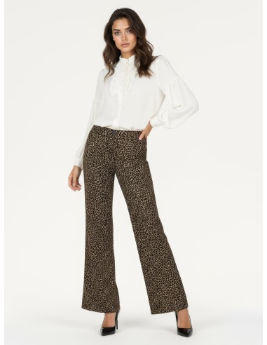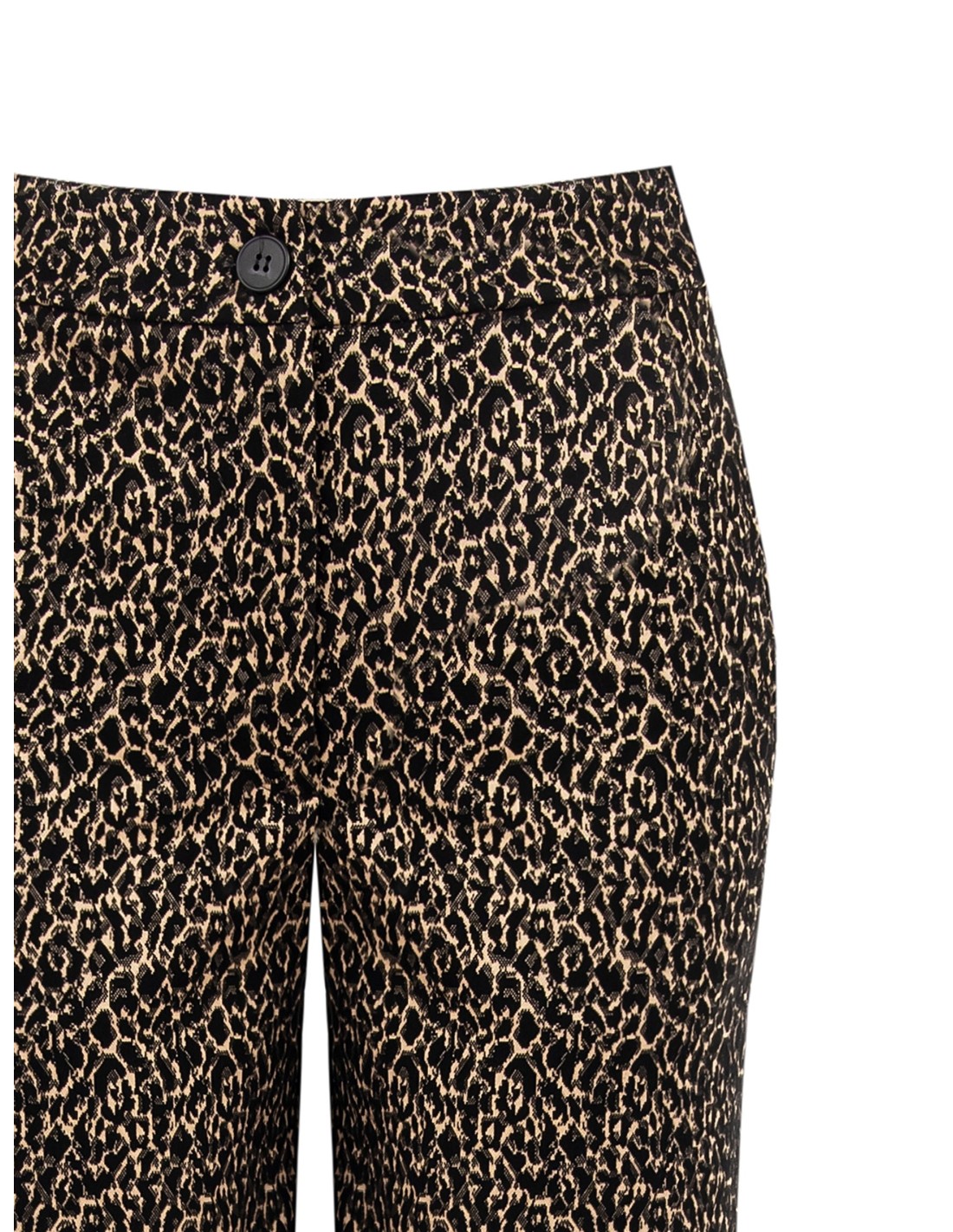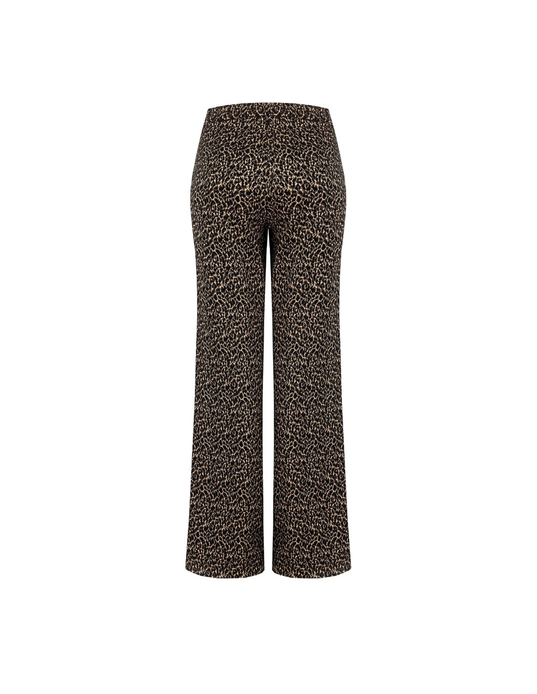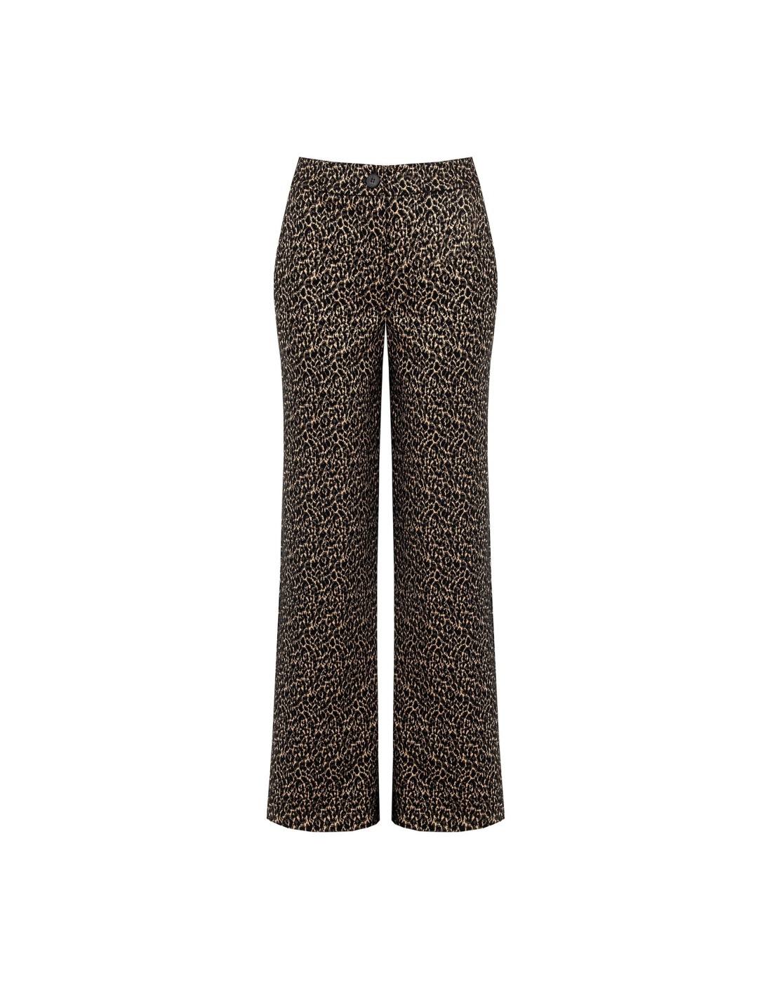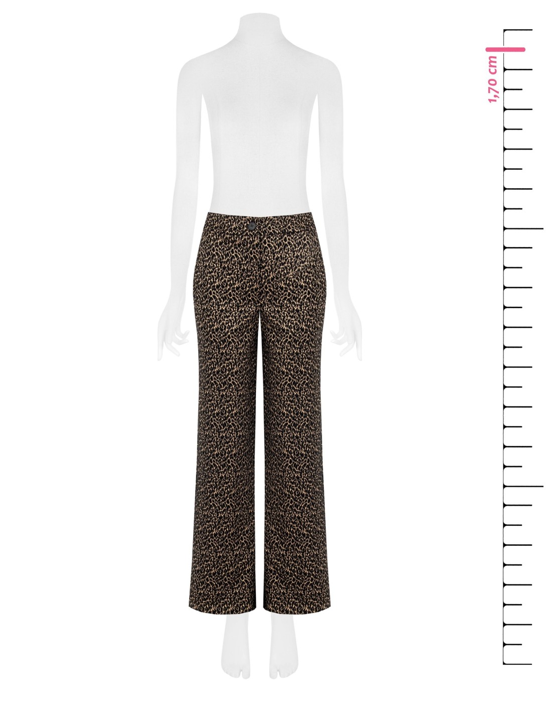 Calças de perna direita com um corte regular que emagrece a silhueta. Tecido fluido com ligeira elasticidade e textura animalier. Cintura média com fecho de botão coberto e bolsos inclinados para um toque prático. Versáteis da secretária para depois do jantar: confortáveis durante todo o dia, perfeitas com blazer ou blusa.