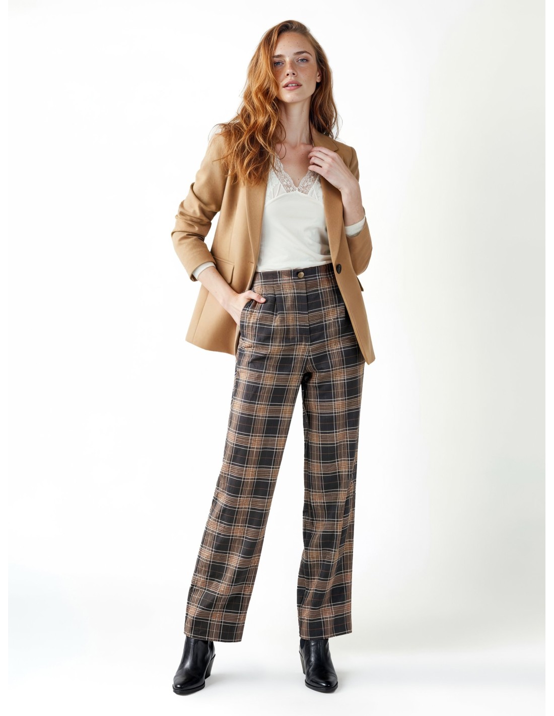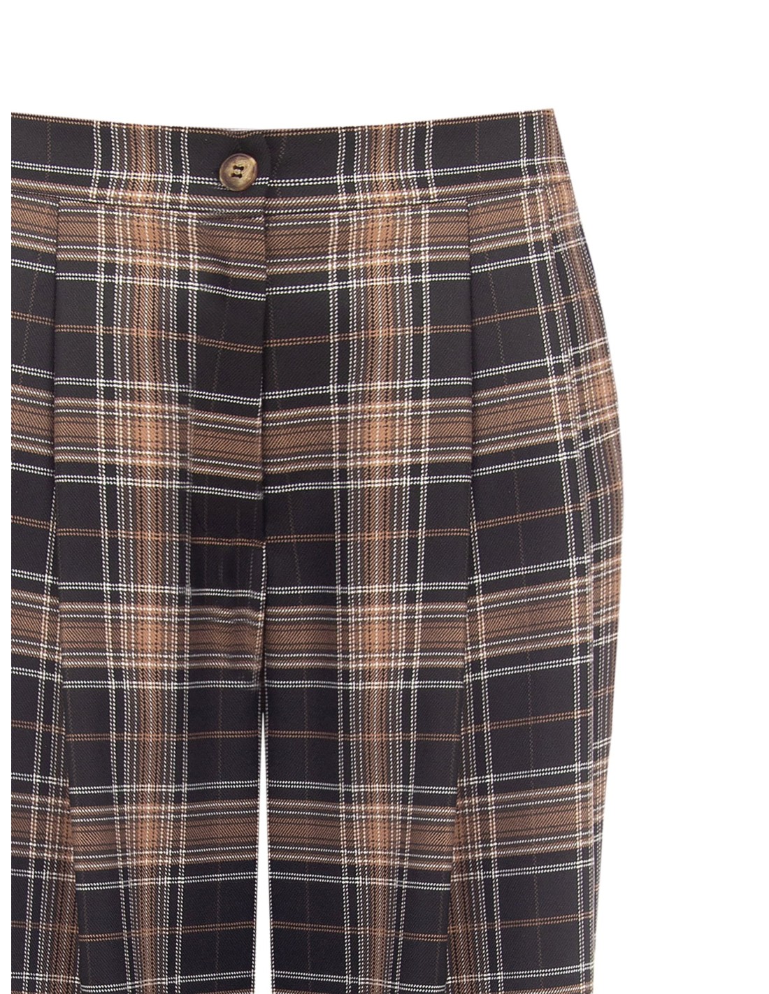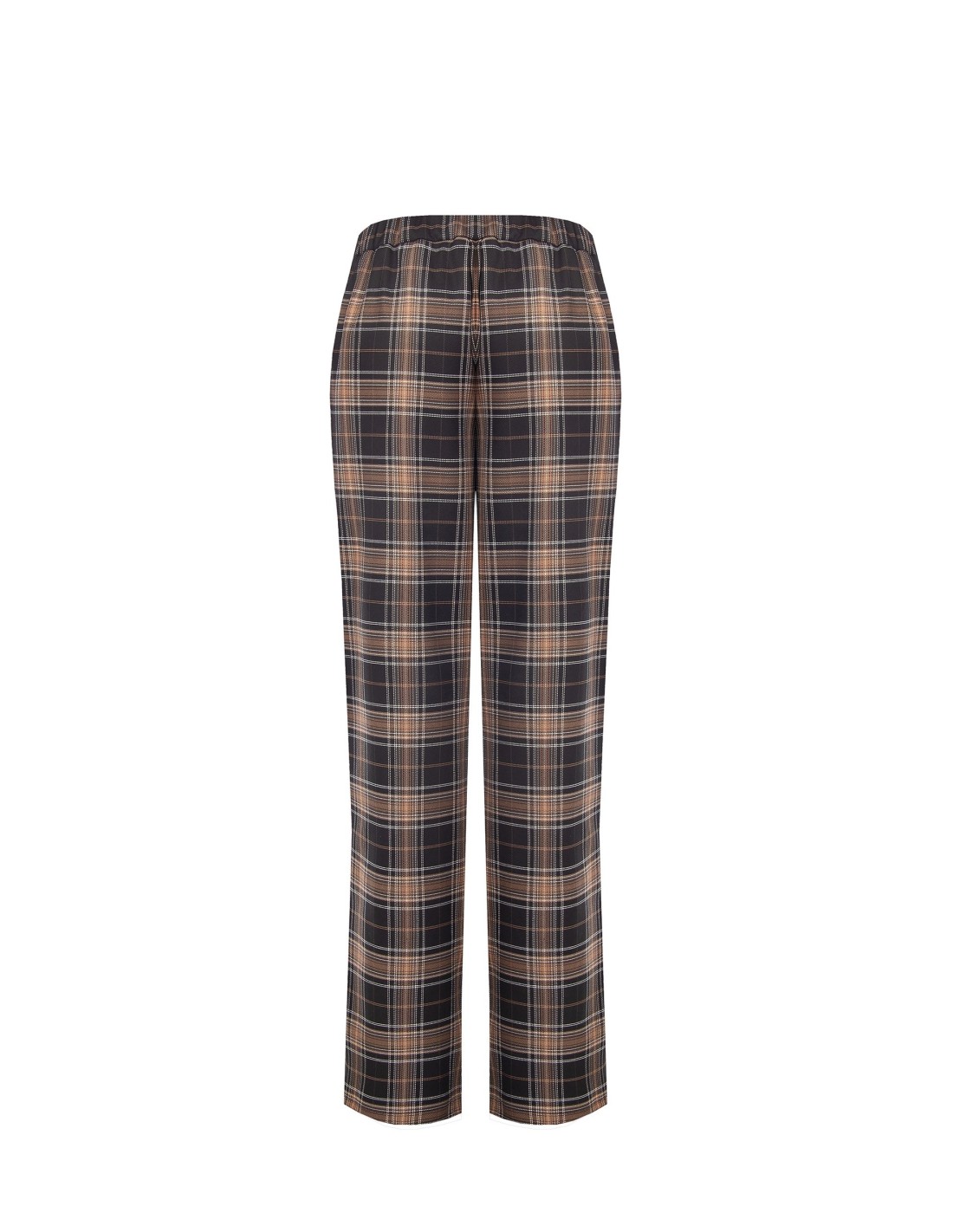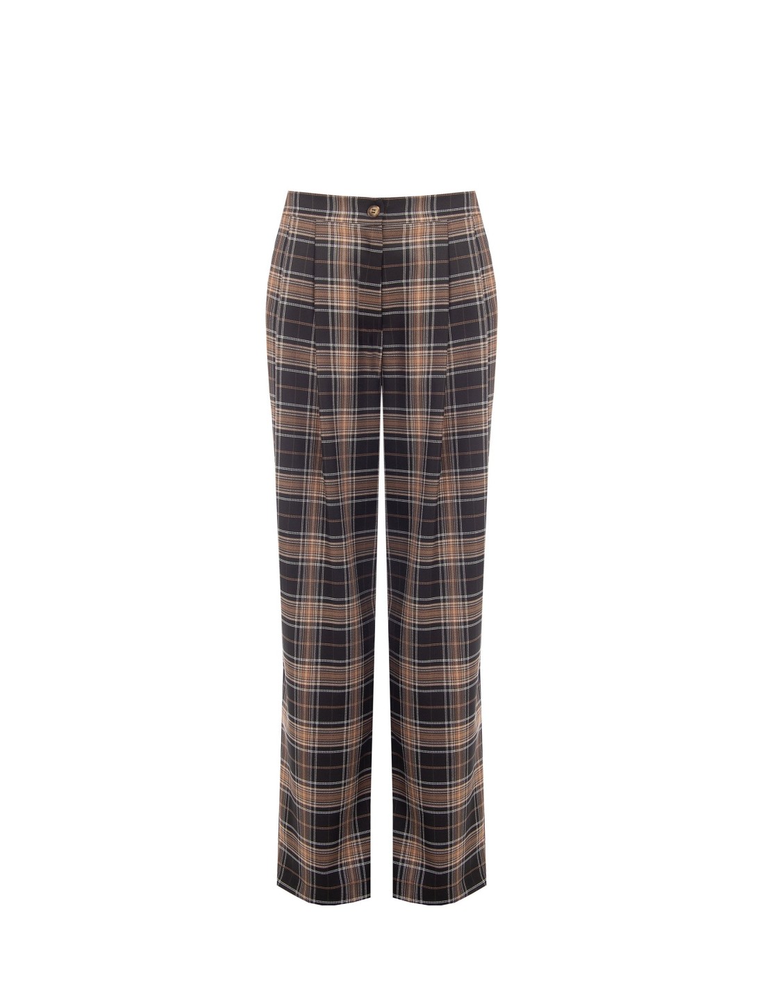 Rinascimento apresenta umas calças de perna reta com corte descontraído que alongam a silhueta. Tecido macio e consistente com padrão xadrez. Cintura confortável graças ao elástico posterior, pregas frontais duplas e fecho com botão. Perfeito para o escritório e para looks do dia a dia cuidados.