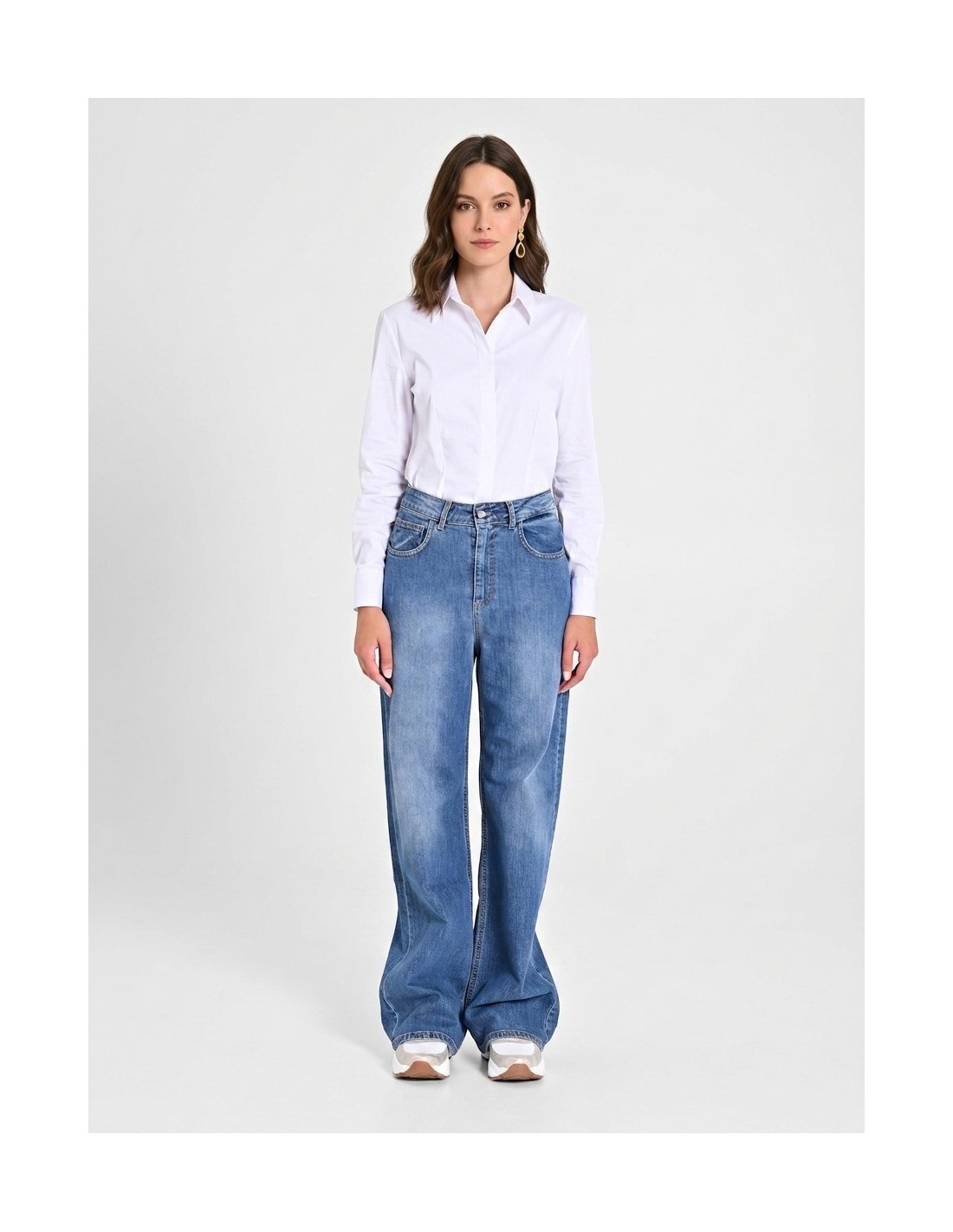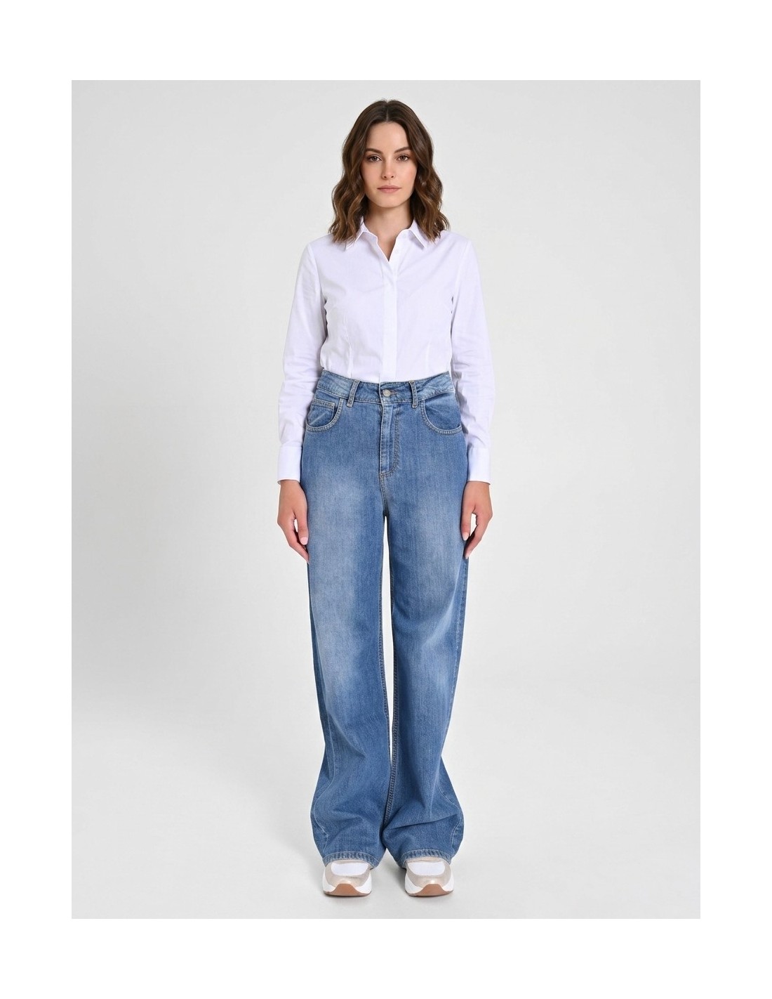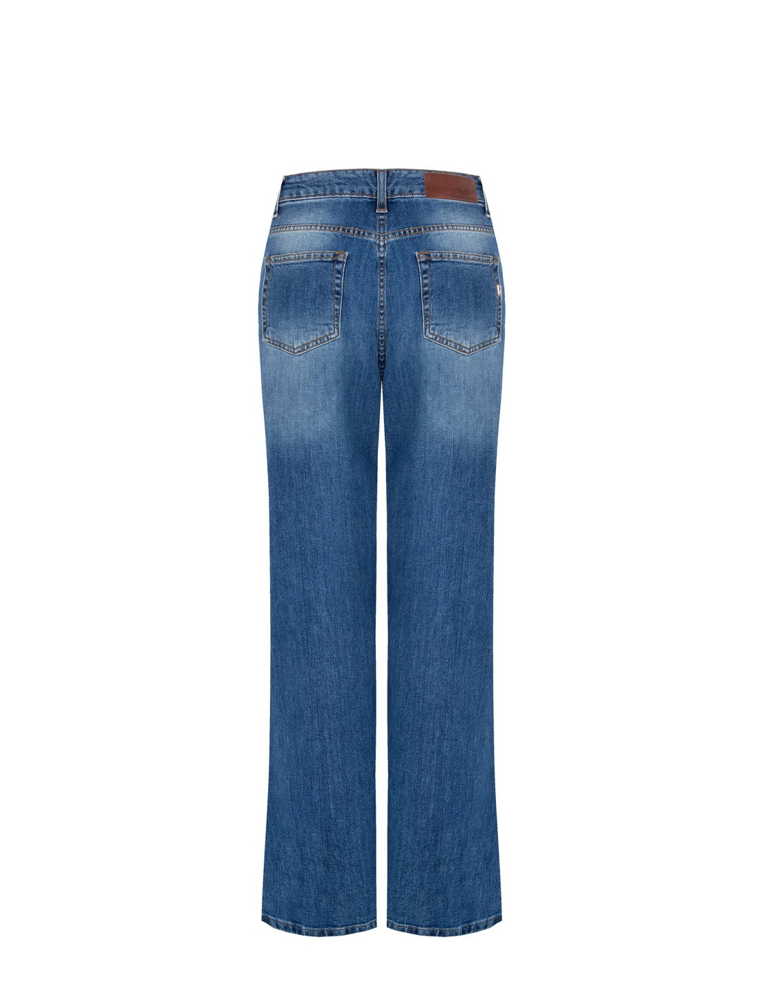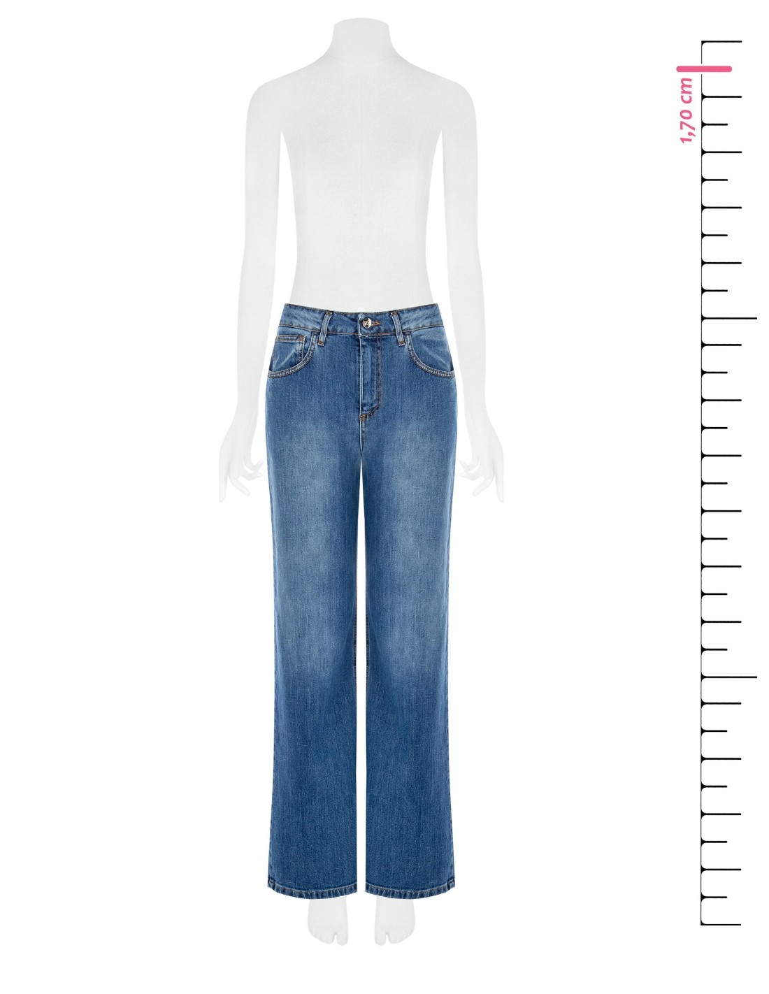 Jeans de perna larga em ganga macia com caimento fluido e alongador, com cintura alta que valoriza a silhueta e acompanha os movimentos com conforto. Cinco bolsos e fecho com botão e fecho de correr acrescentam um toque autêntico. Perfeito do escritório ao tempo livre.